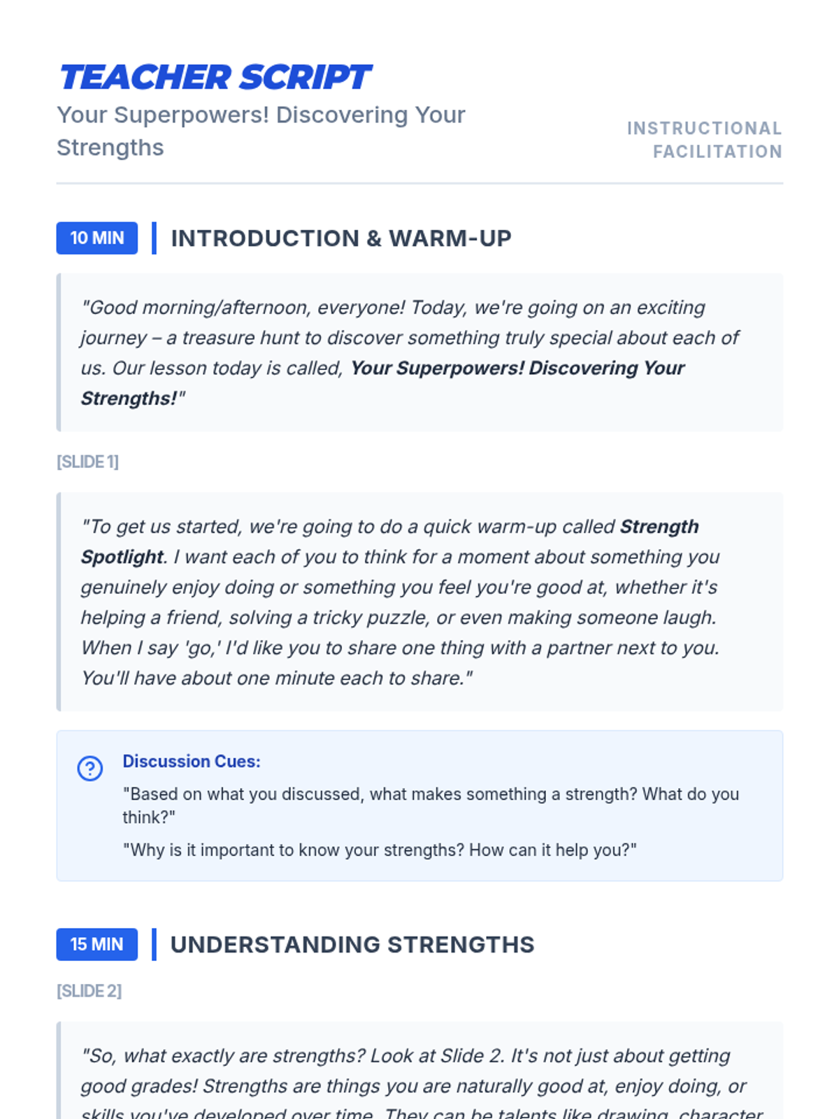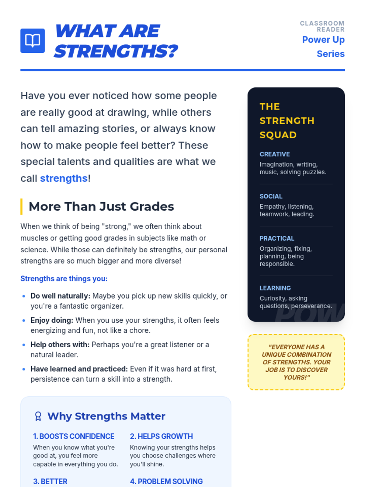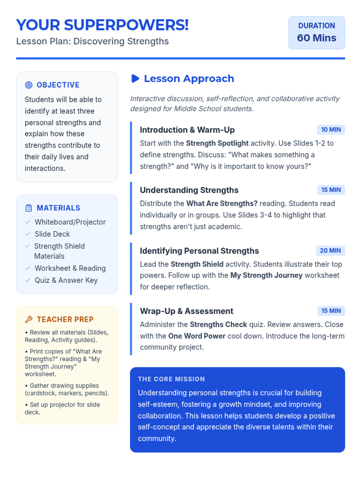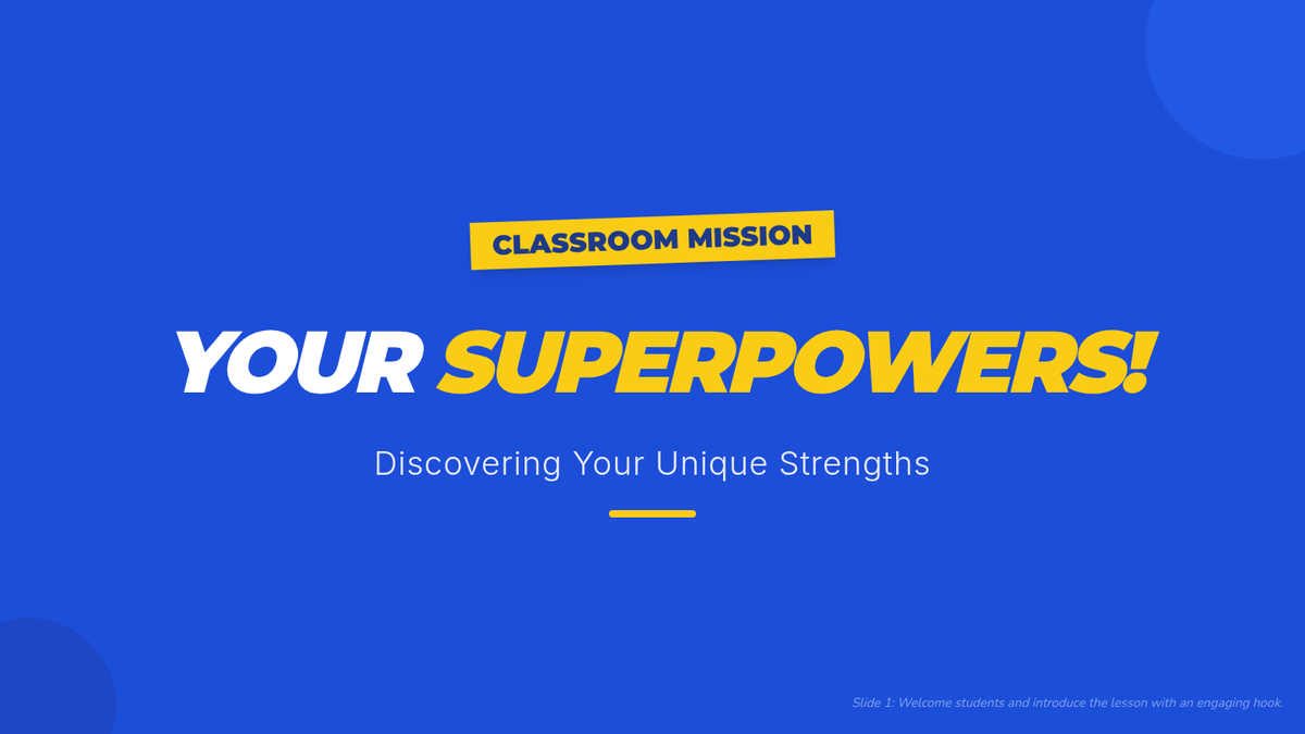 A 60-minute lesson for middle school students to identify and celebrate their unique strengths, or 'superpowers,' to boost self-esteem and foster a positive classroom community.