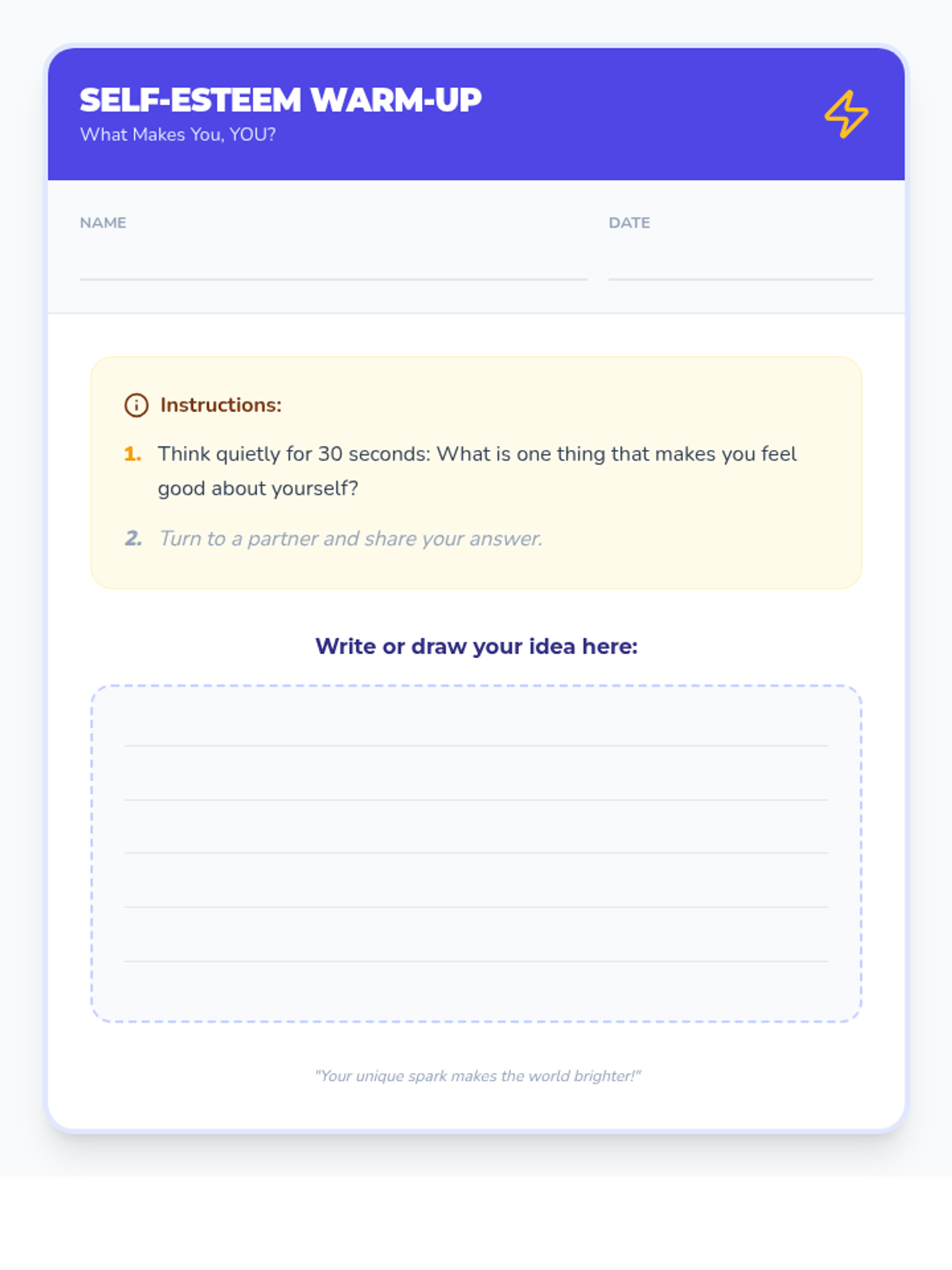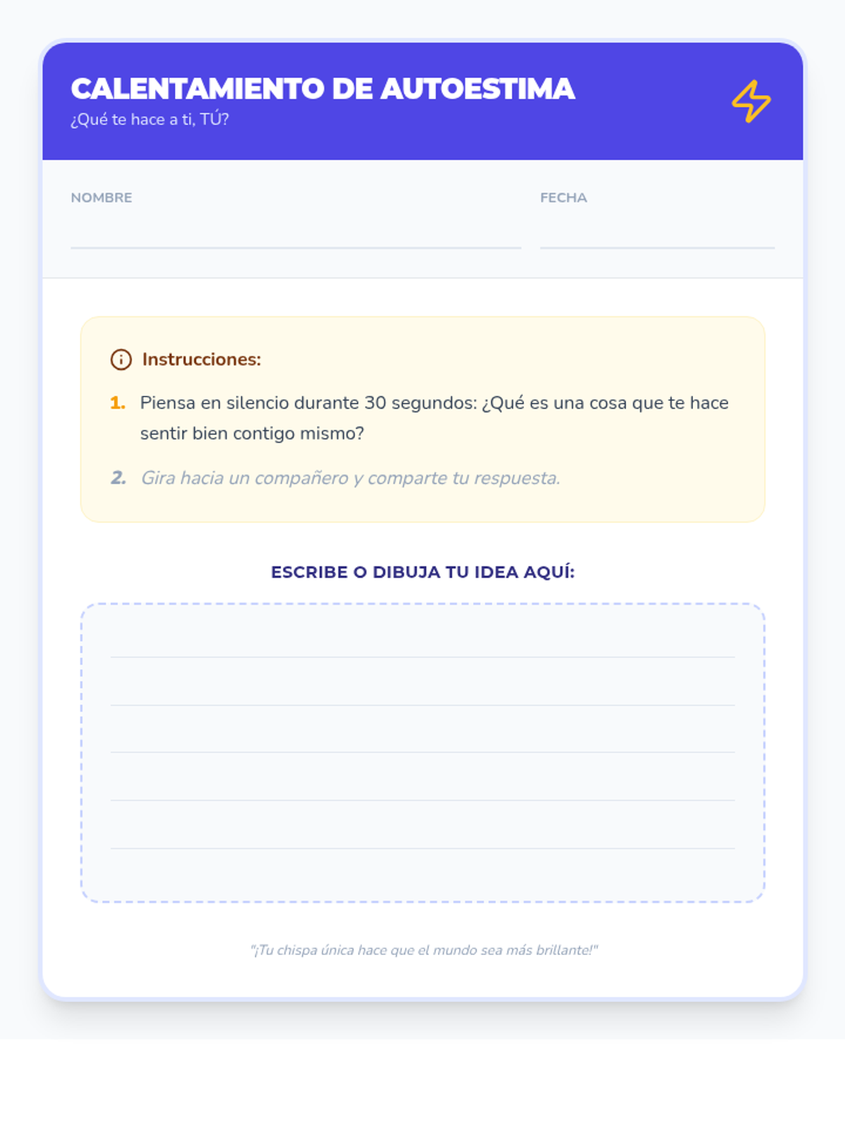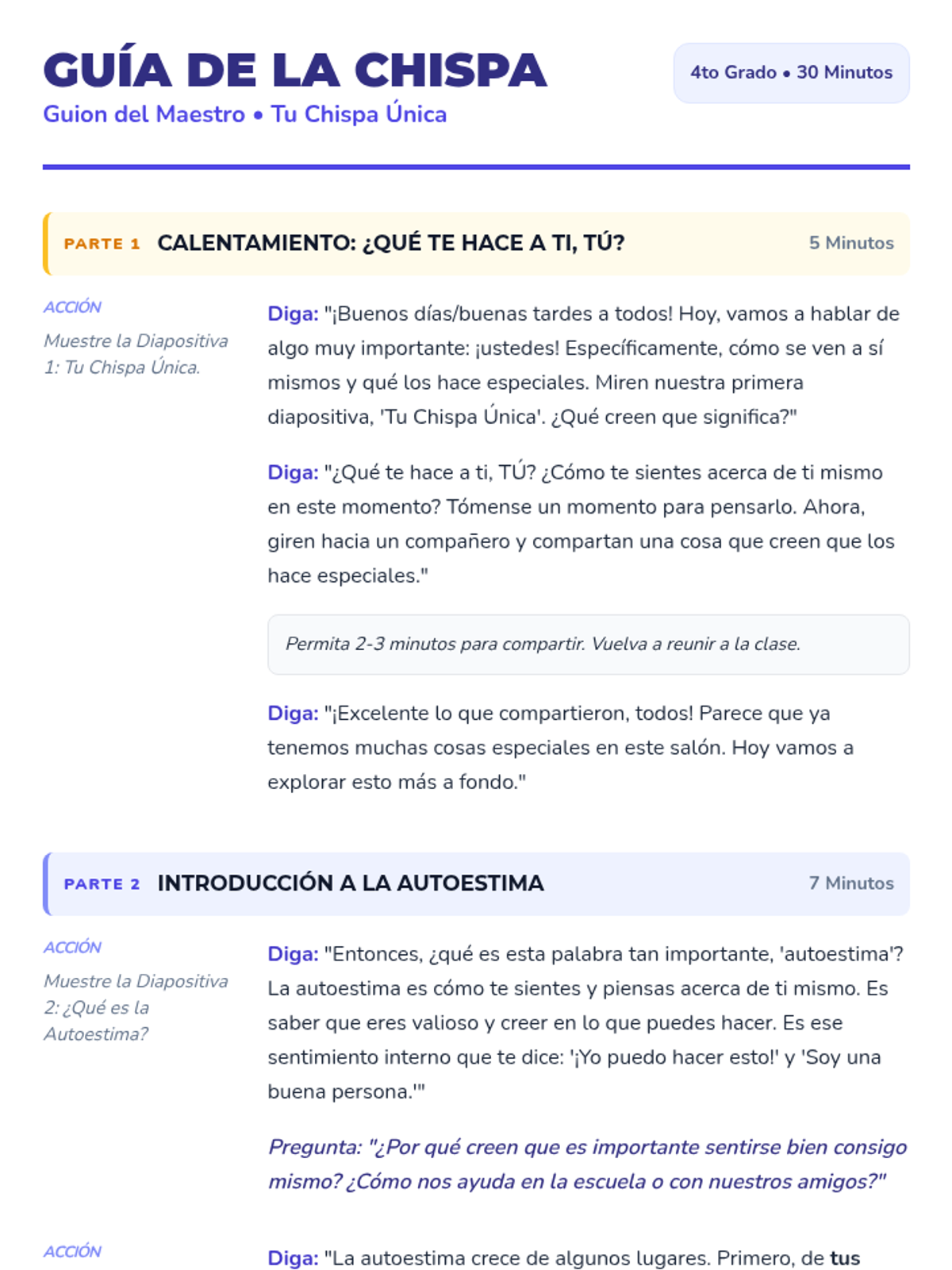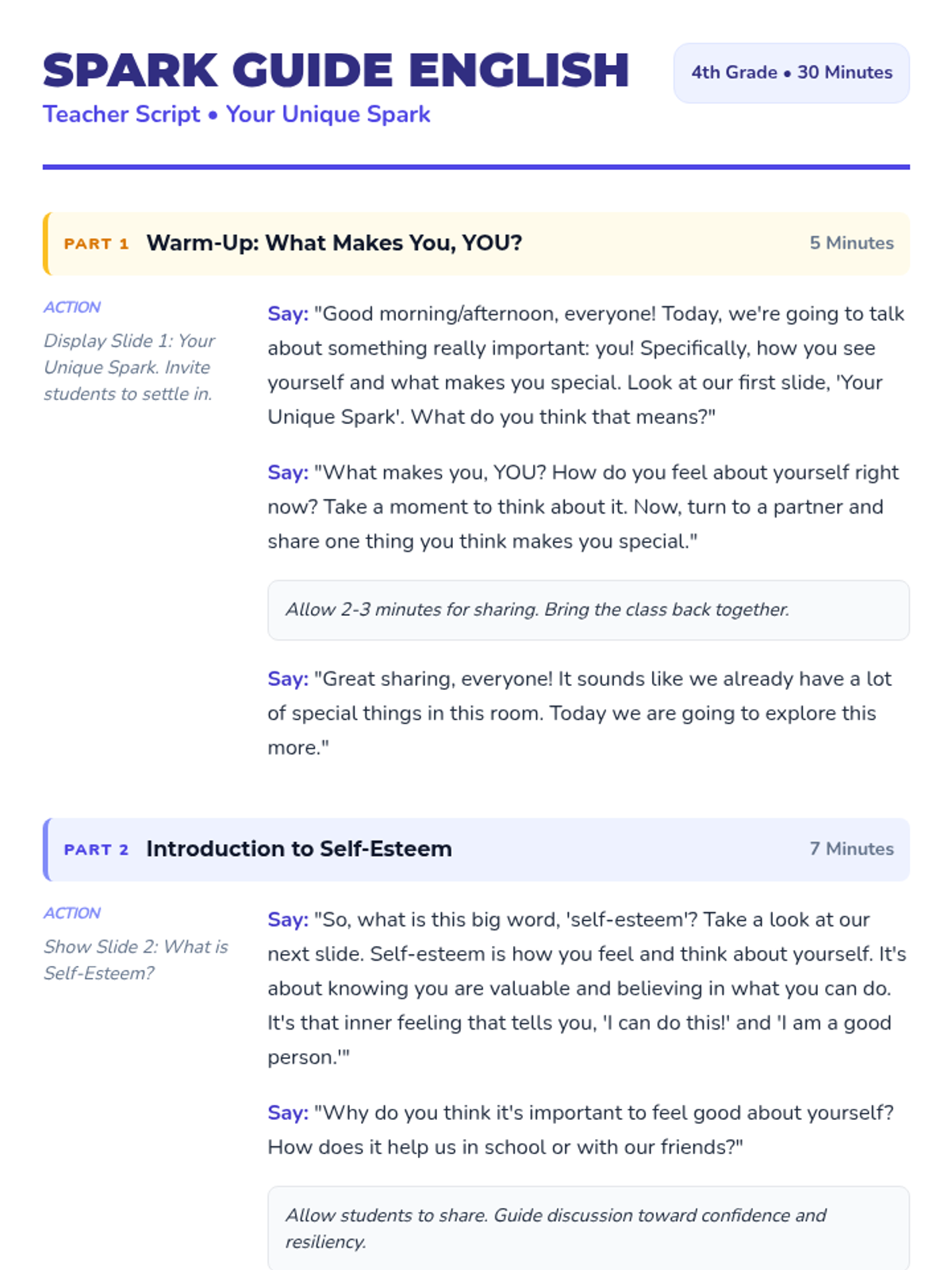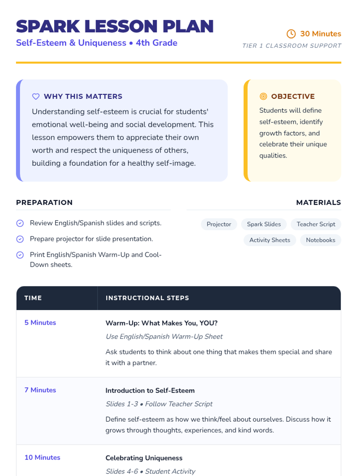 A 30-minute lesson for 4th-grade students exploring self-esteem and celebrating individual uniqueness through interactive slides and reflective activities in English and Spanish.