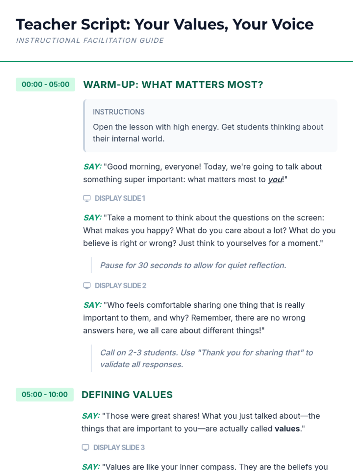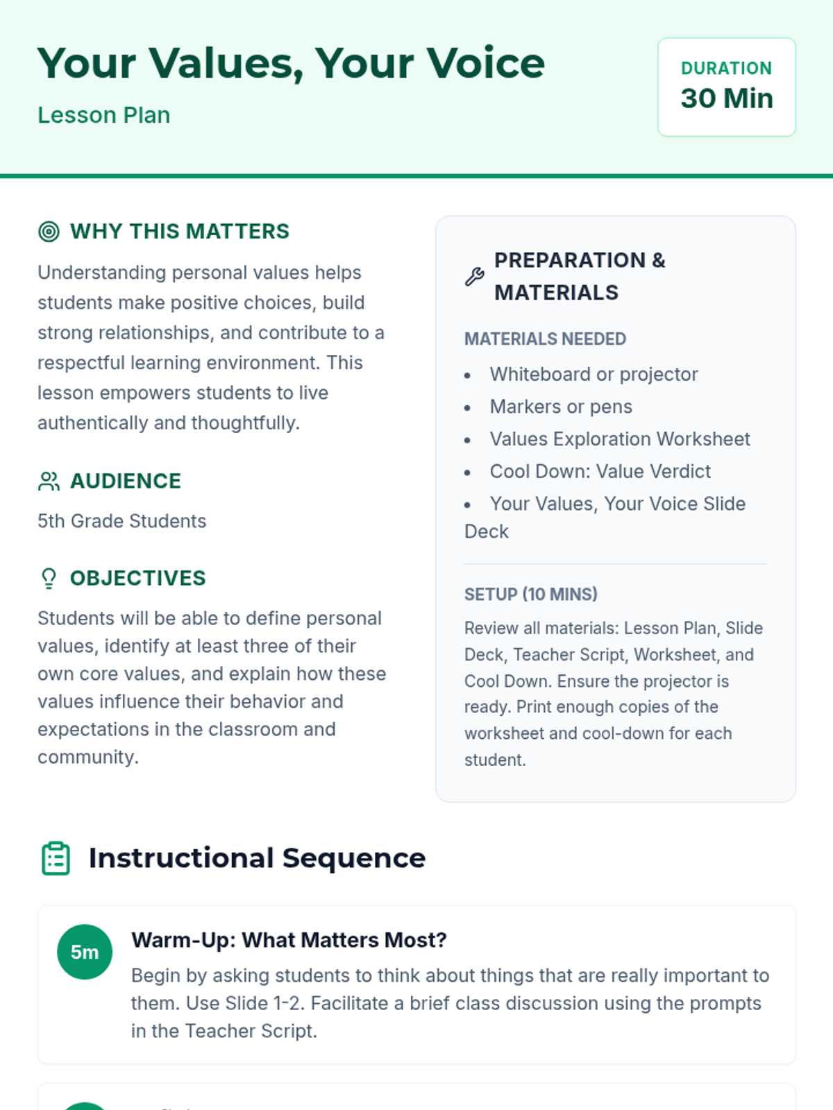 This 30-minute lesson helps 5th-grade students understand what values are, identify their own personal values, and connect these values to expectations in the classroom and beyond. It fosters self-awareness and promotes a positive classroom culture.
