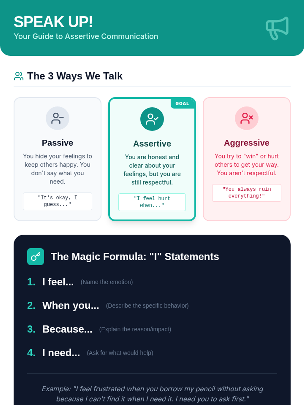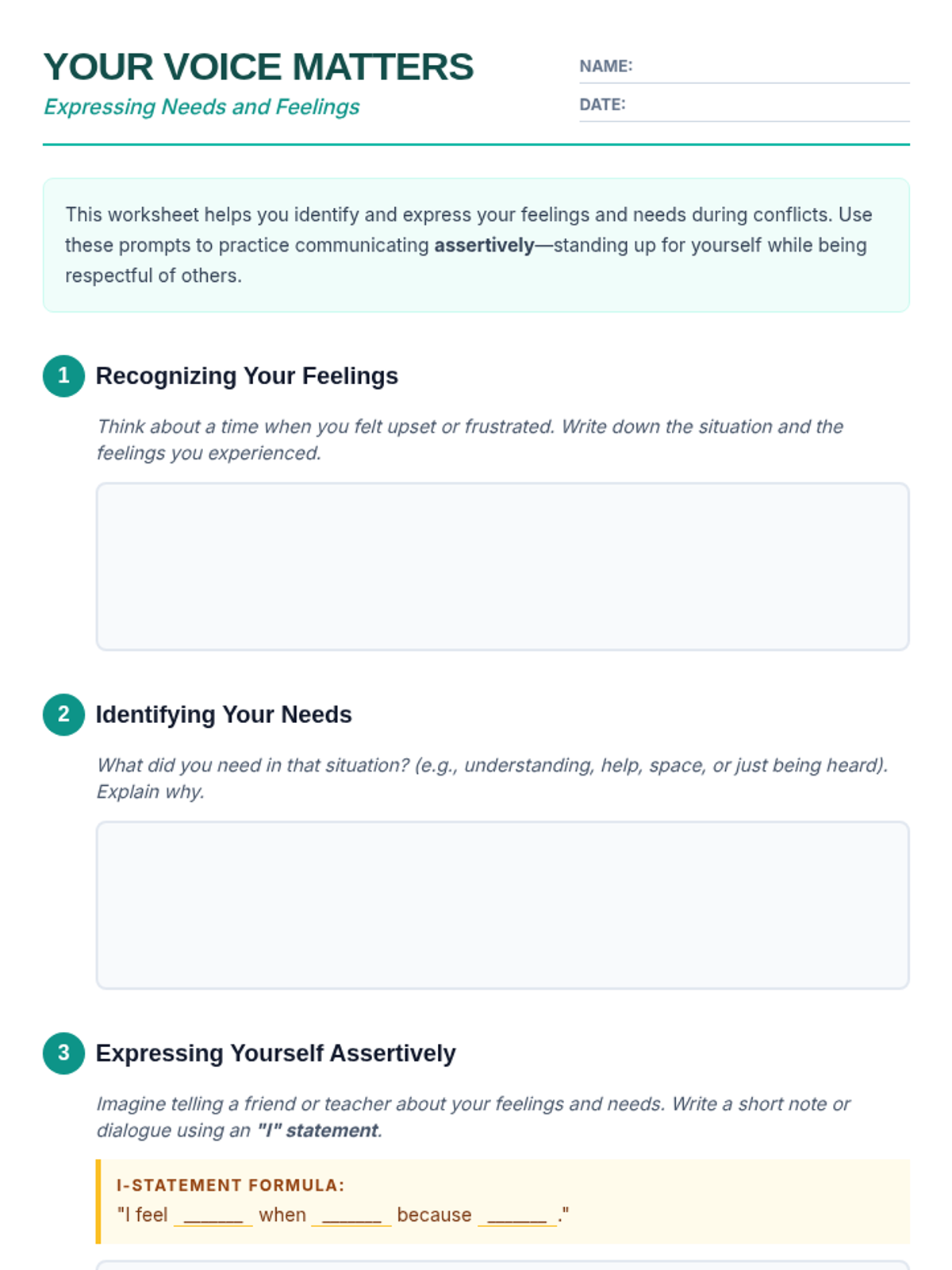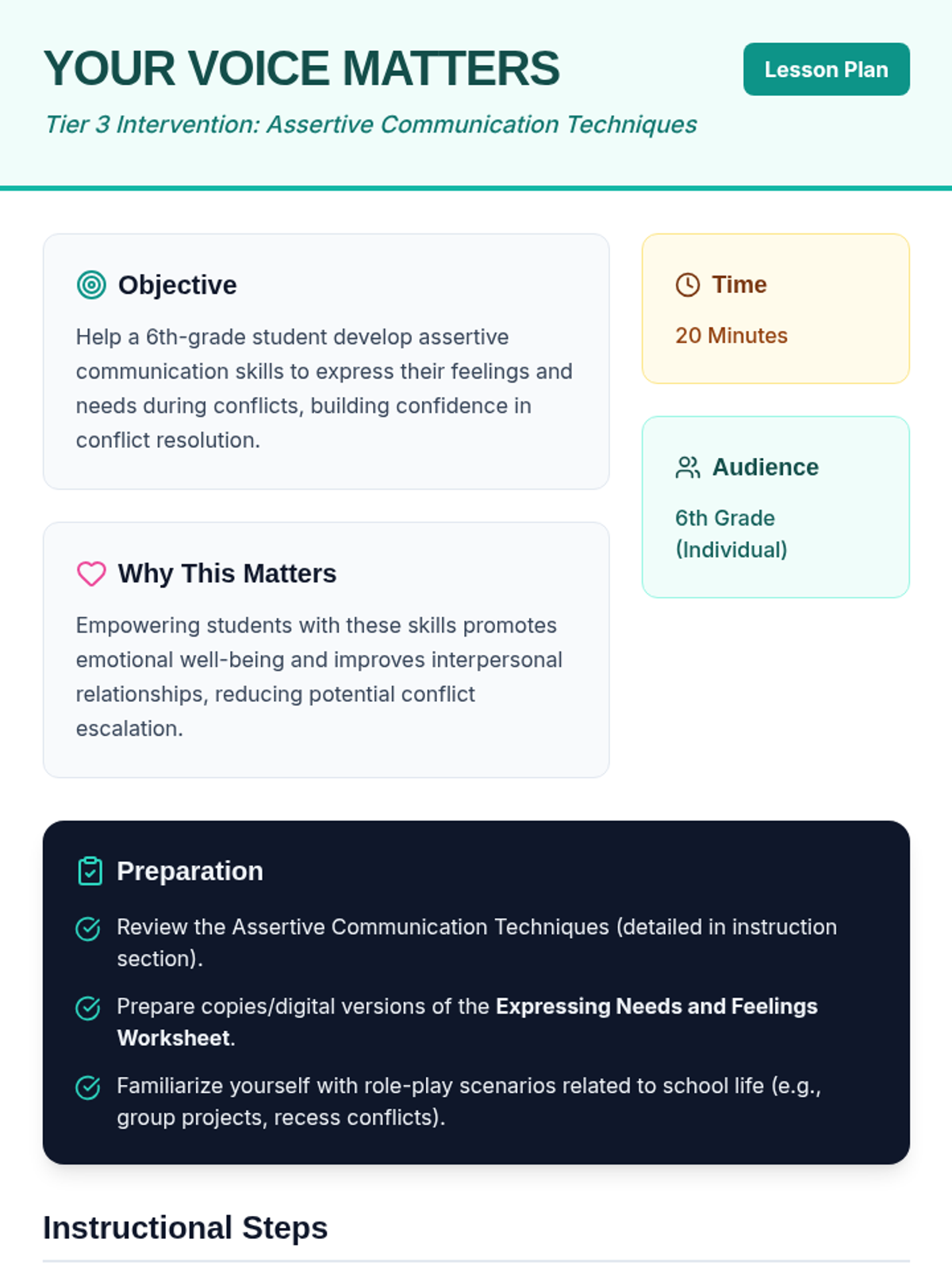A personalized Tier 3 session designed to empower 6th-grade students with assertive communication skills, helping them express feelings and needs confidently during conflicts.