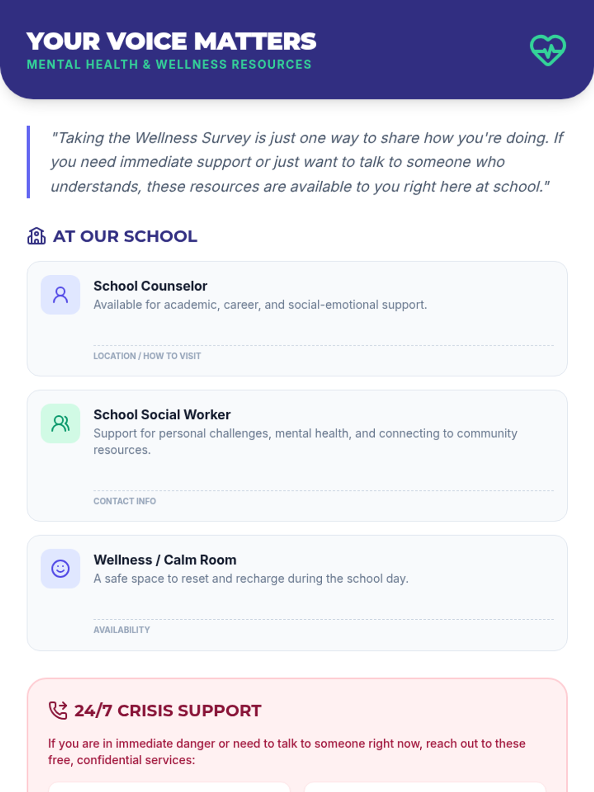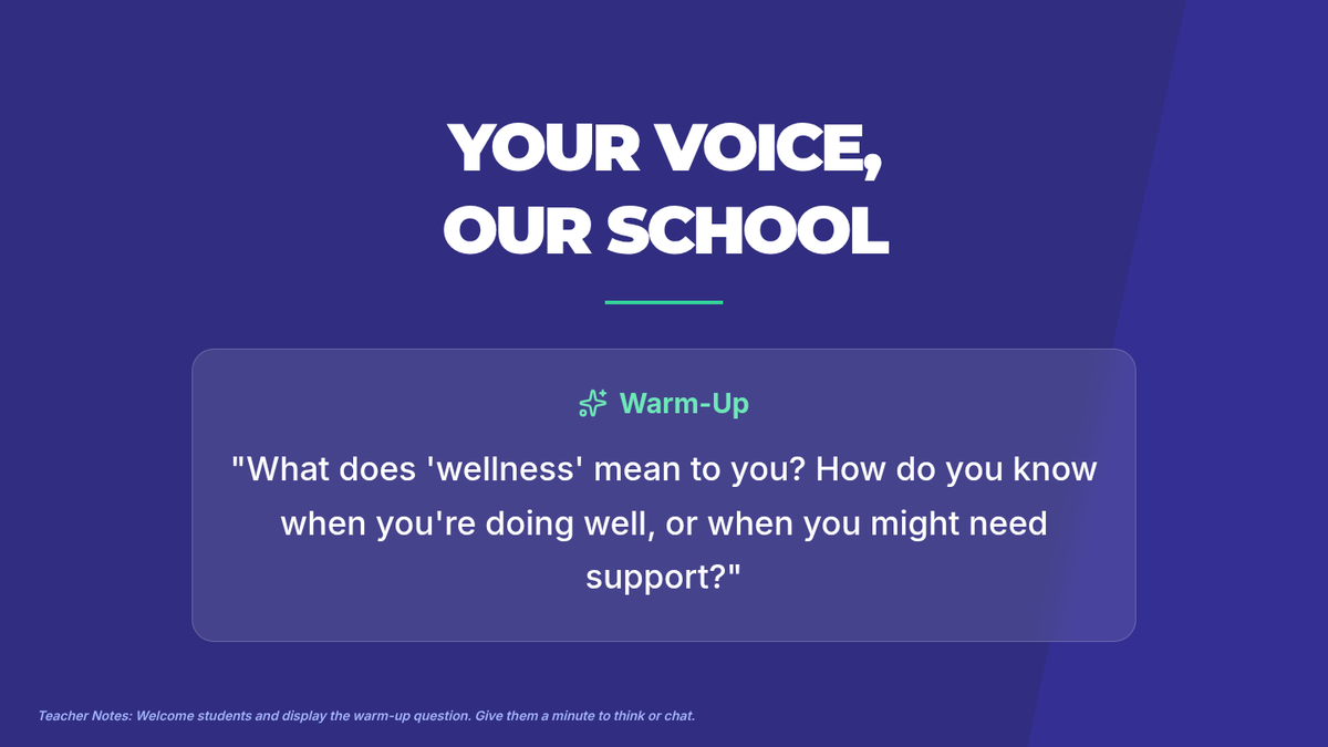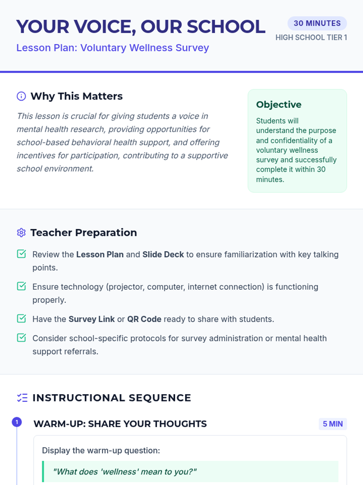 A 30-minute high school lesson designed to introduce students to a voluntary wellness survey, emphasizing confidentiality, the importance of student voice, and how results inform school support systems.
