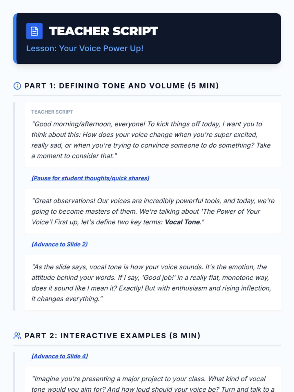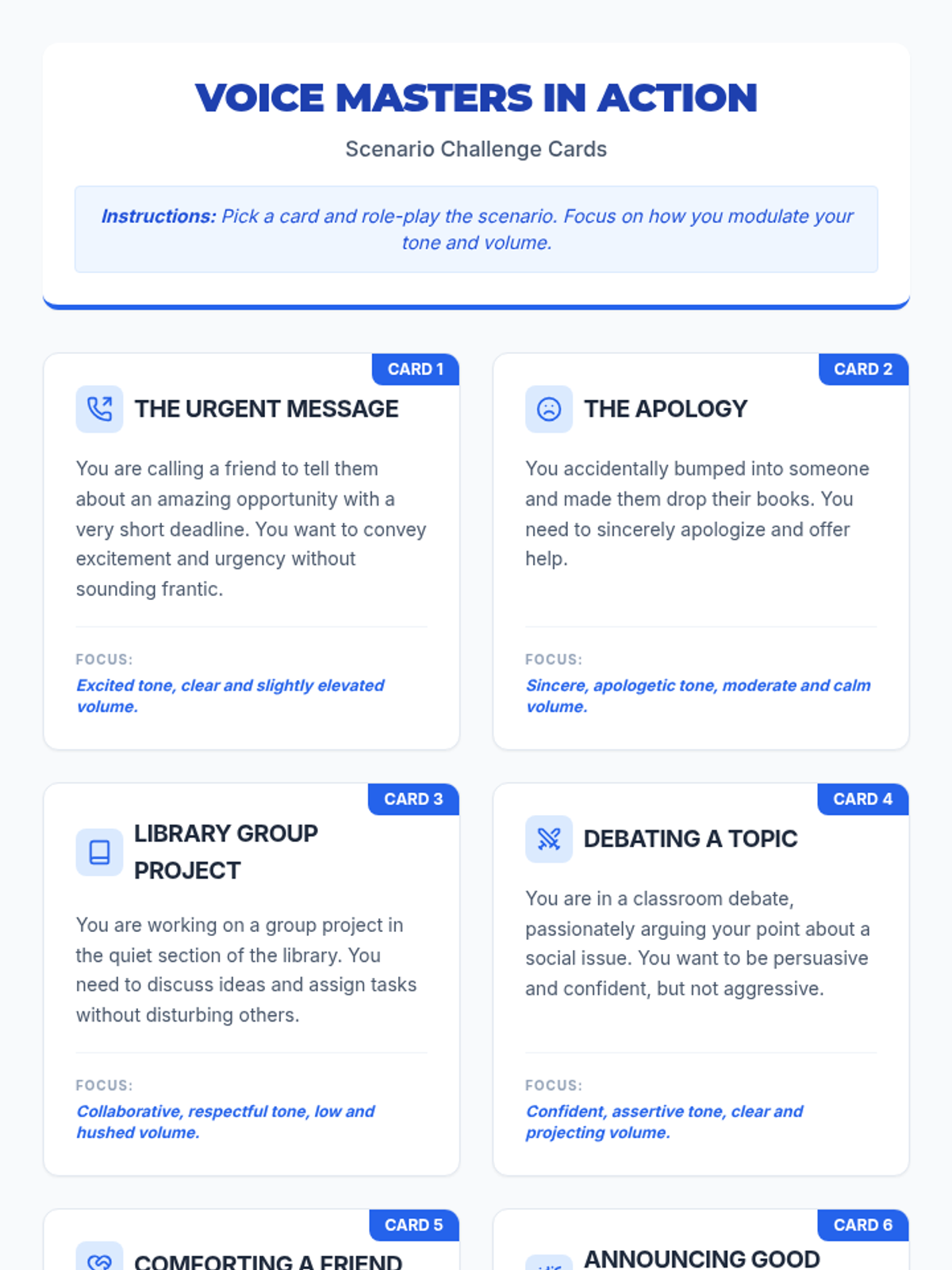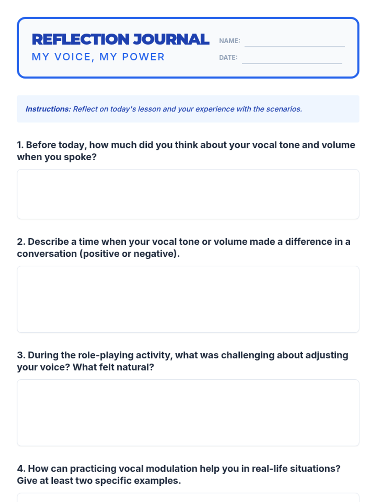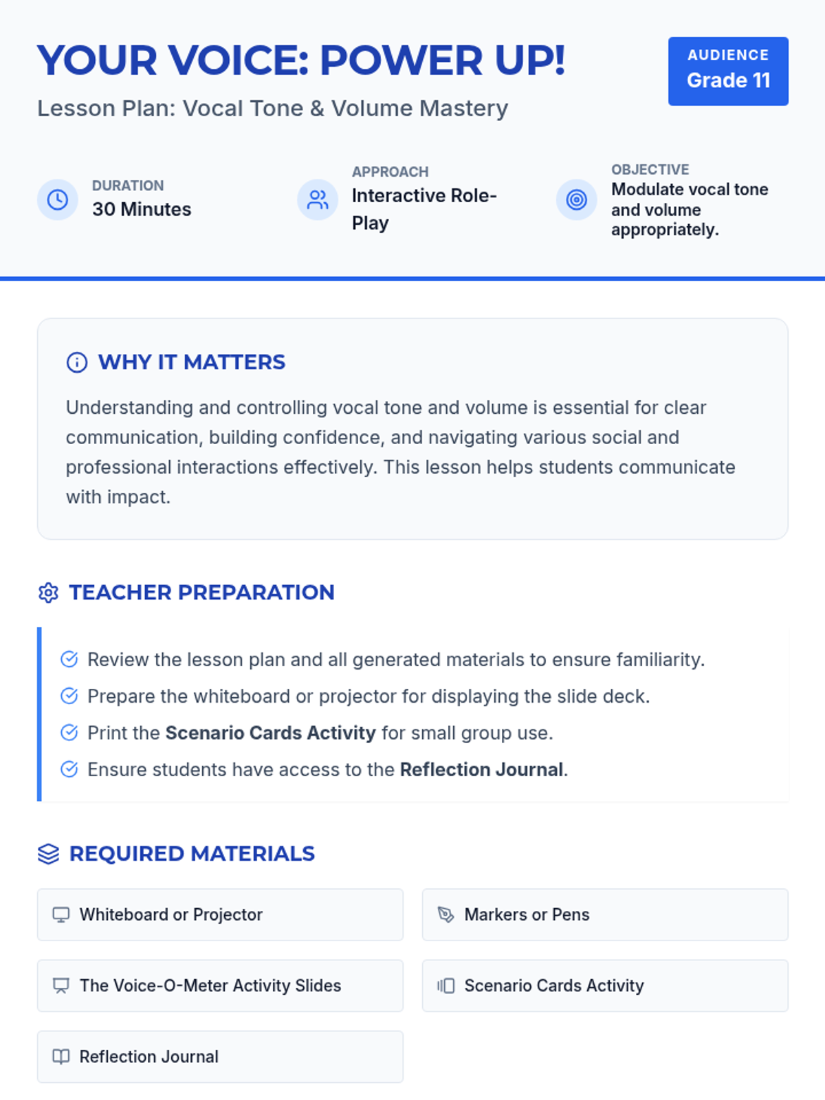 A 30-minute lesson for 11th-grade students on mastering vocal tone and volume to improve communication, confidence, and social awareness.
