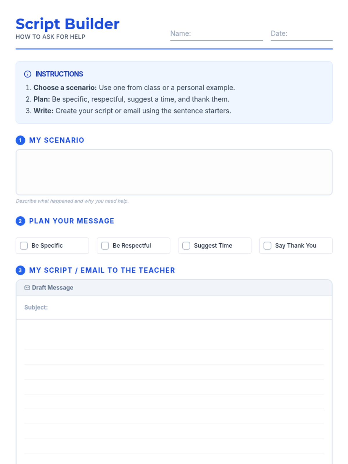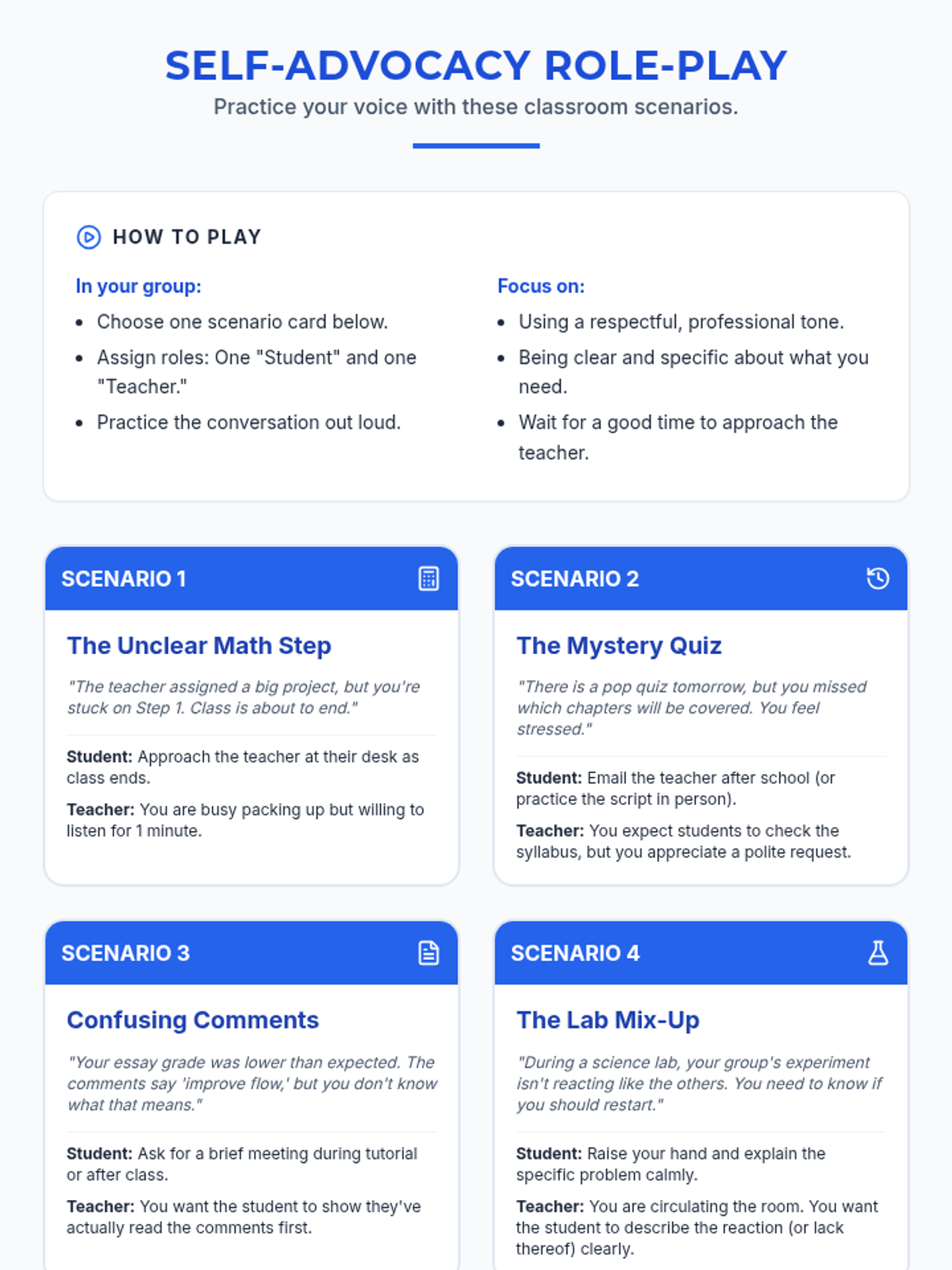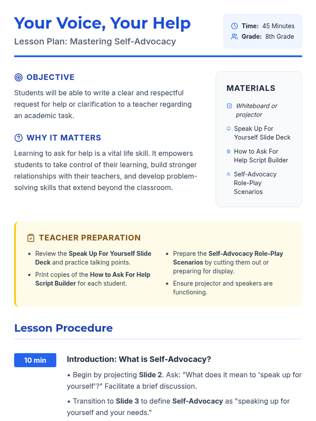 A 45-minute lesson for 8th graders on self-advocacy, focusing on how to respectfully and effectively ask teachers for academic help and clarification.