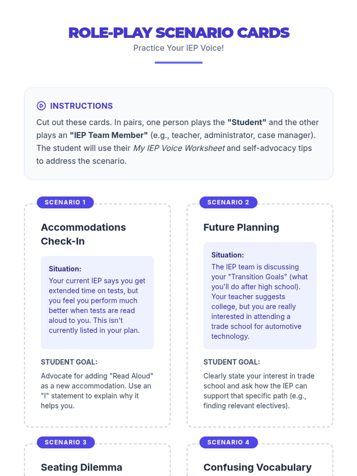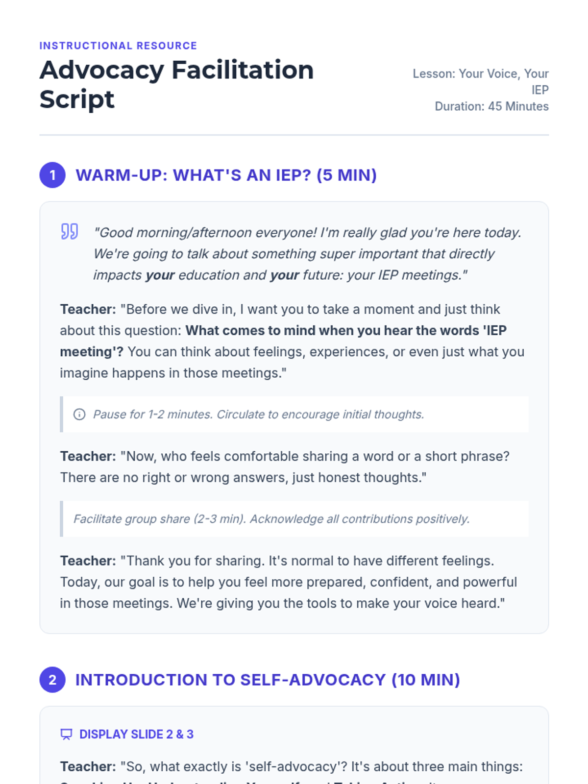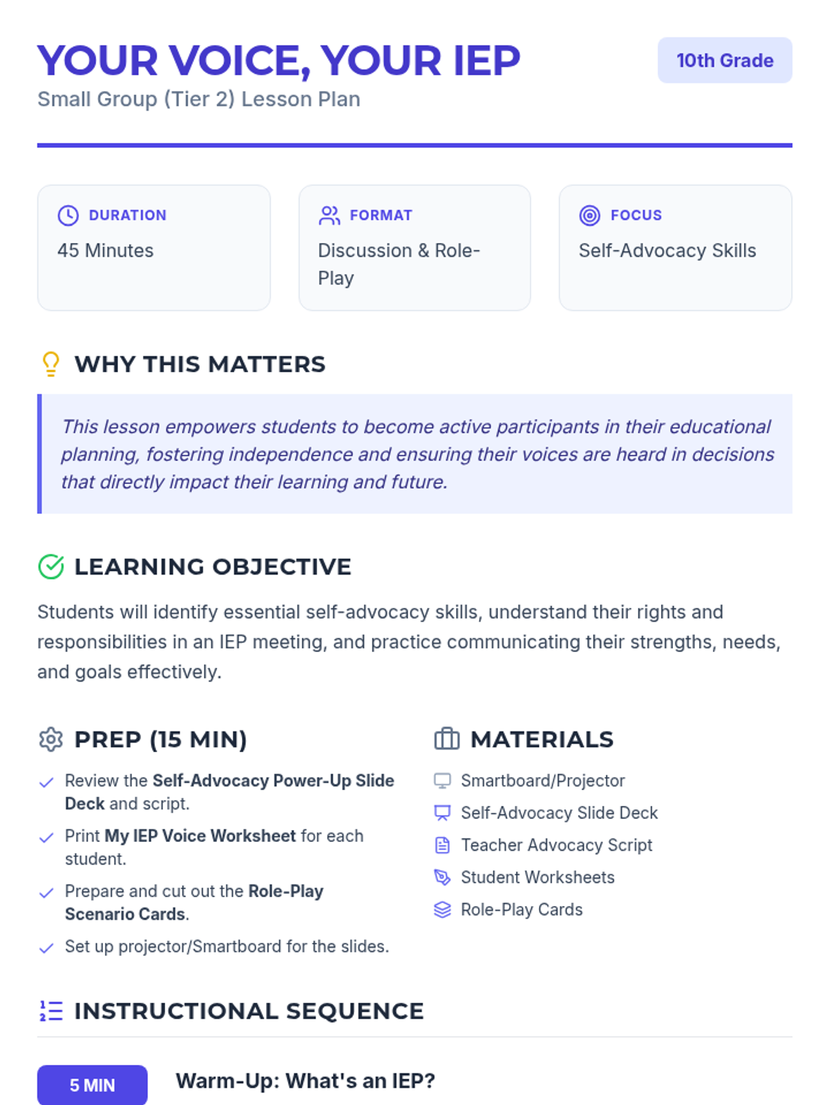 A Tier 2 small group lesson for 10th graders designed to empower students with IEPs to actively participate in their educational planning through self-advocacy skills. Students will identify their strengths, challenges, and goals, and practice communicating them effectively in an IEP meeting context.