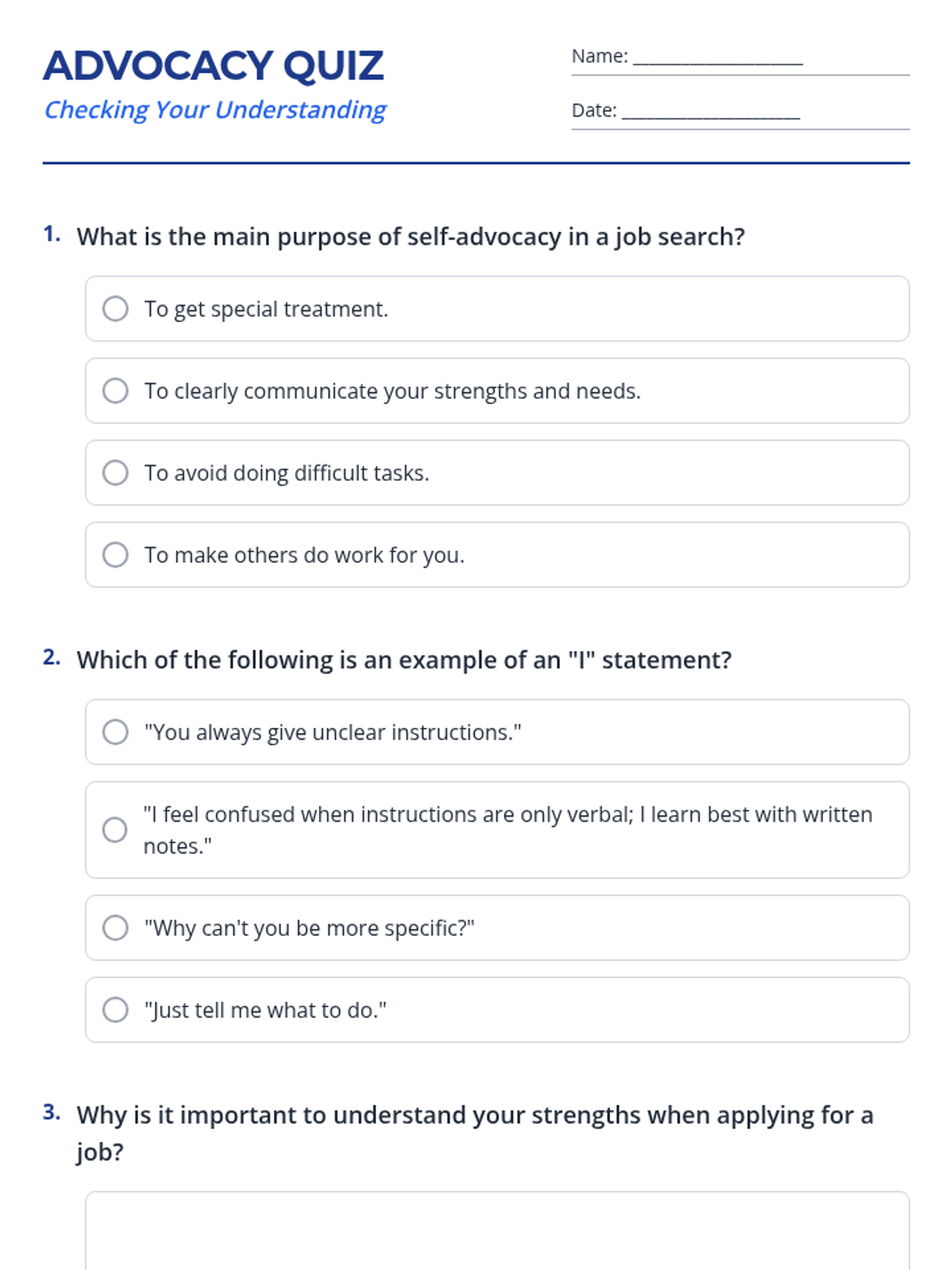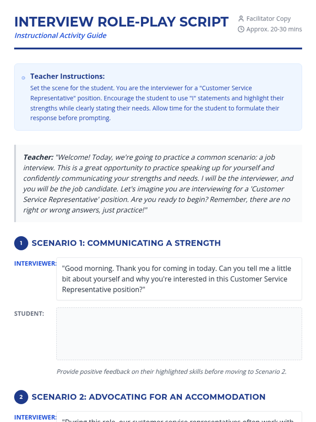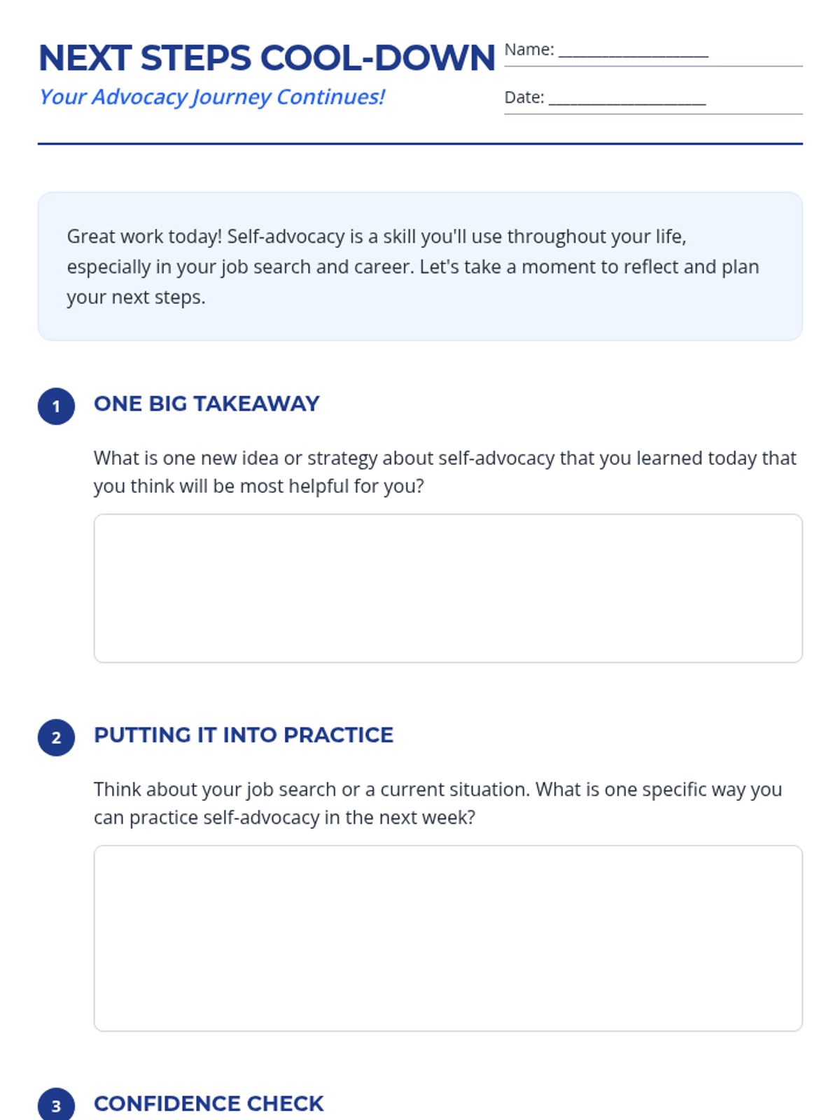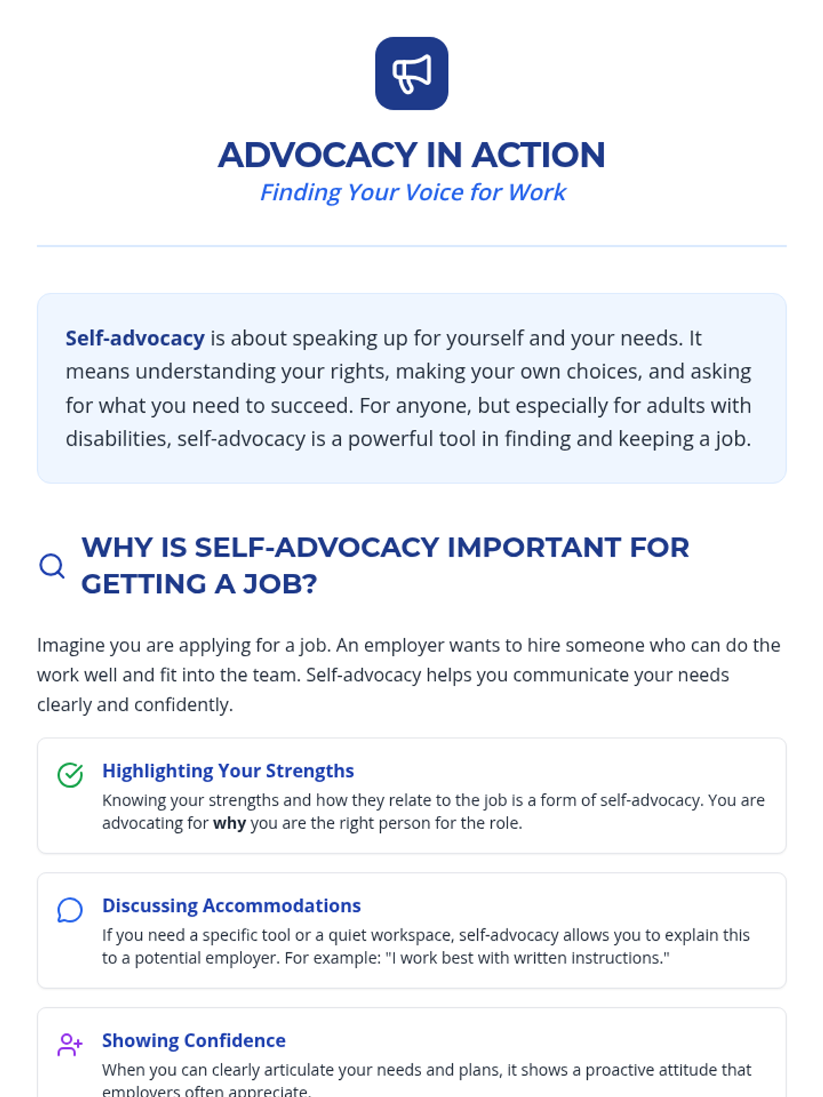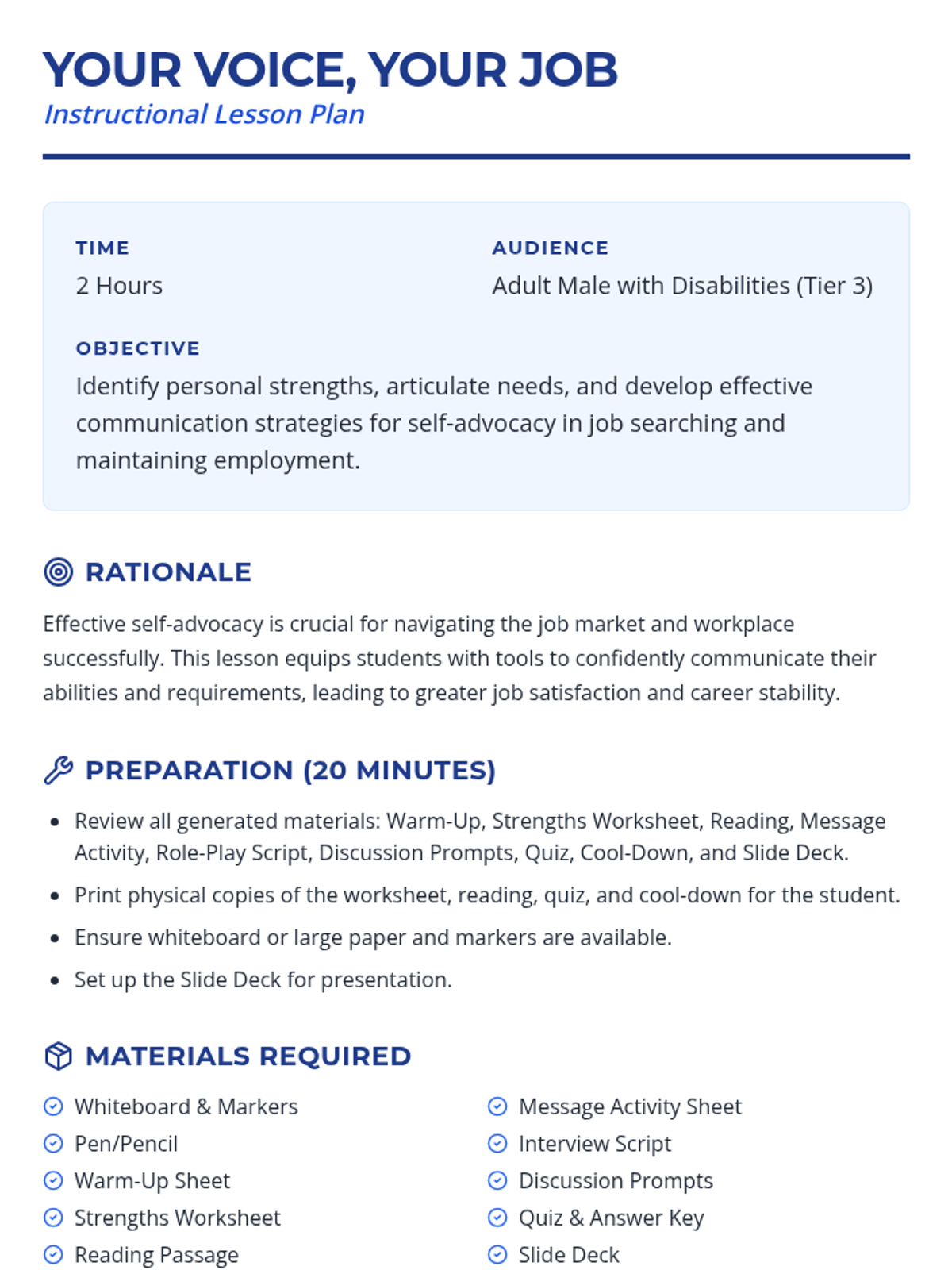 A 2-hour individualized lesson designed to empower adult males with disabilities to effectively advocate for themselves in the job search and workplace, fostering confidence and independence.