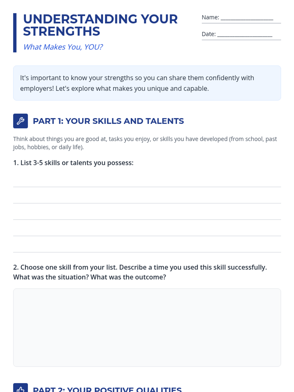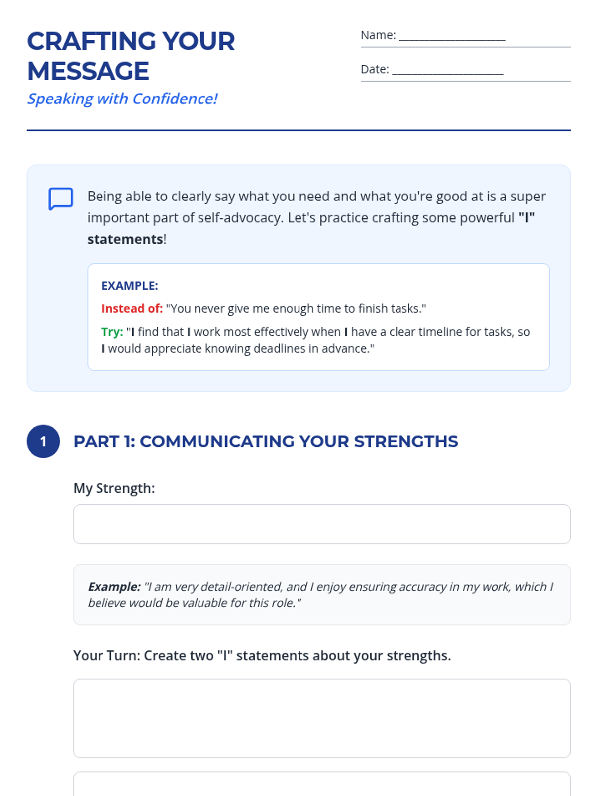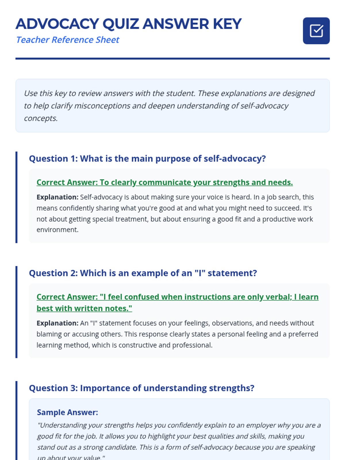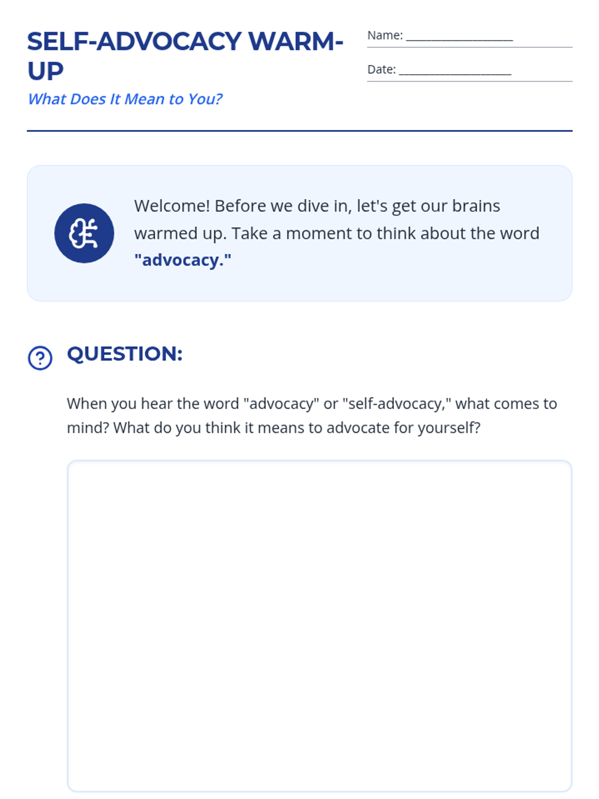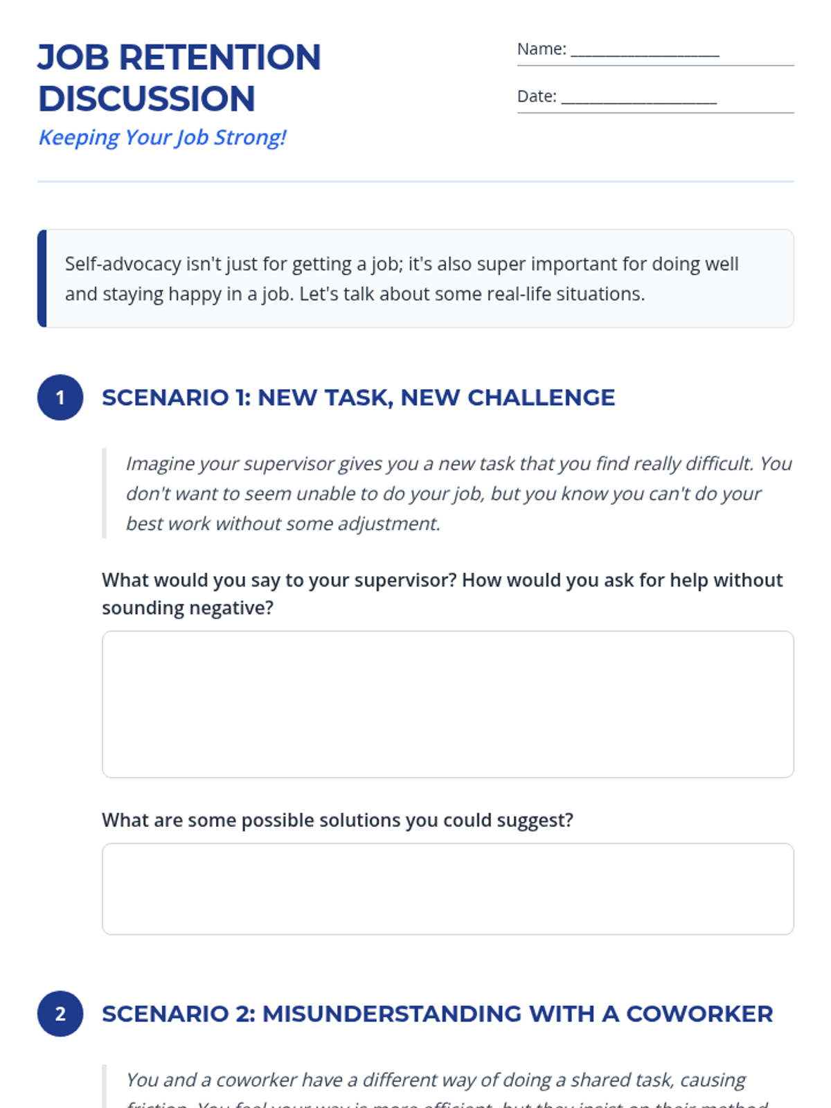 A 2-hour individualized lesson designed to empower adult males with disabilities to effectively advocate for themselves in the job search and workplace, fostering confidence and independence.