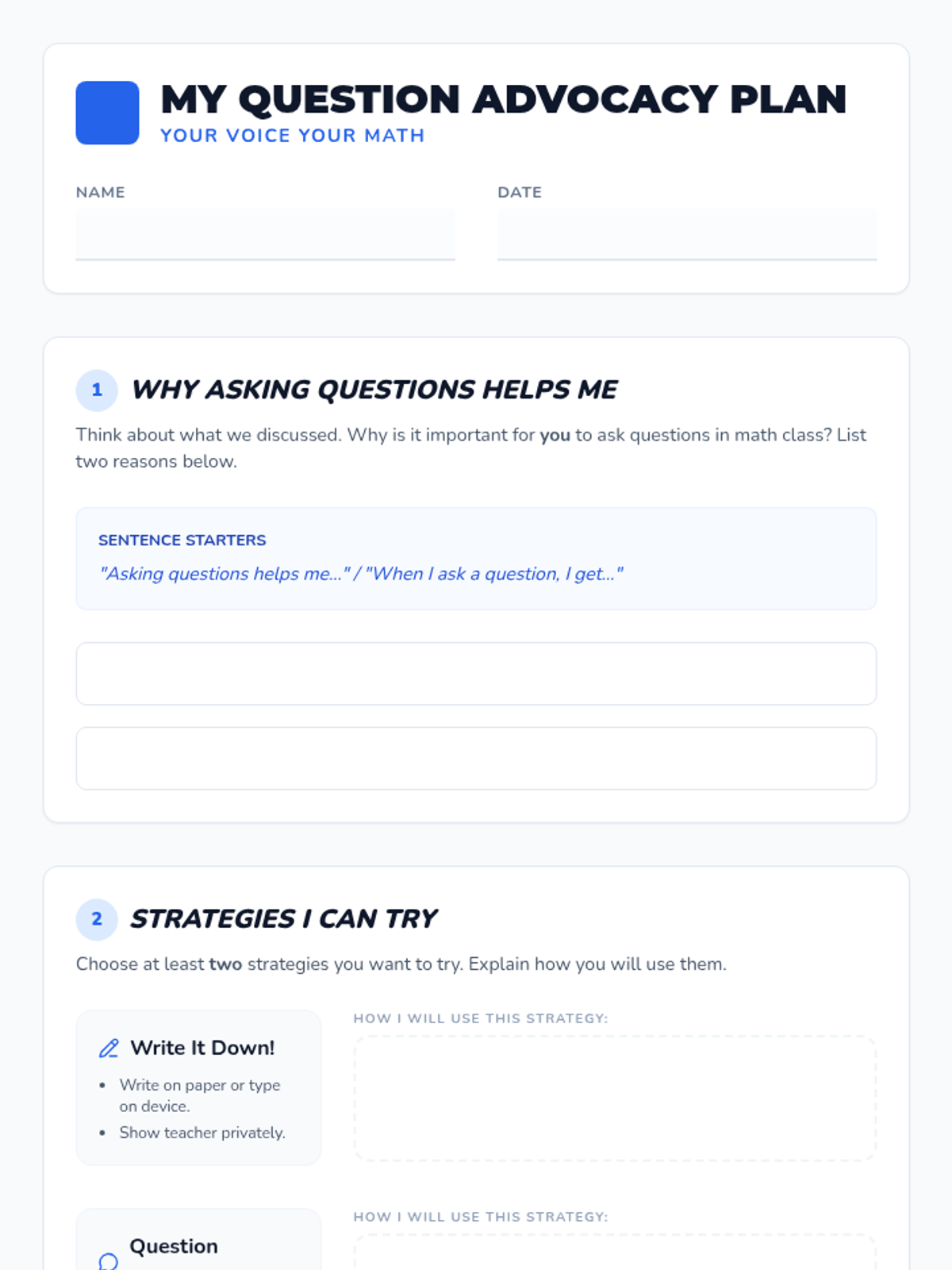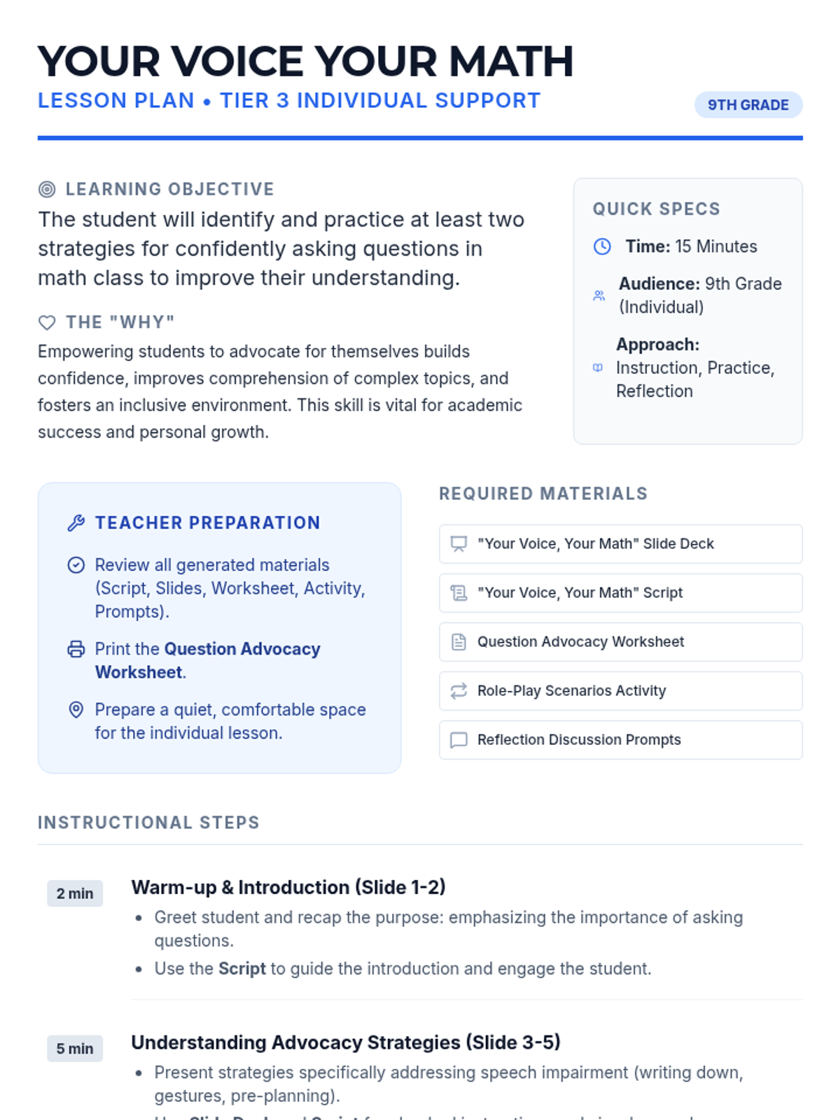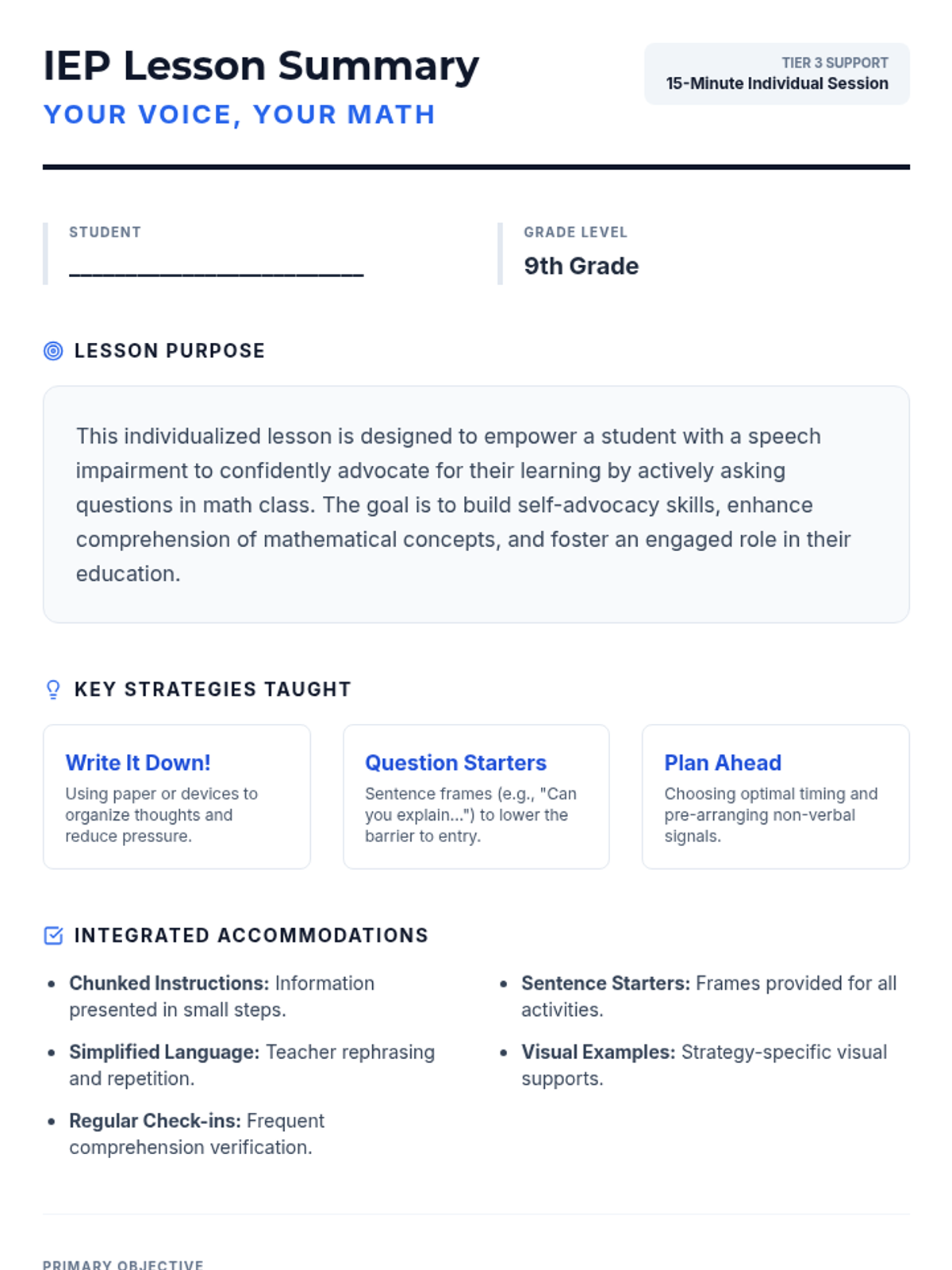 A 15-minute, Tier 3 individual lesson for a 9th-grade student to develop strategies and confidence for asking questions in math class, overcoming communication barriers through self-advocacy.