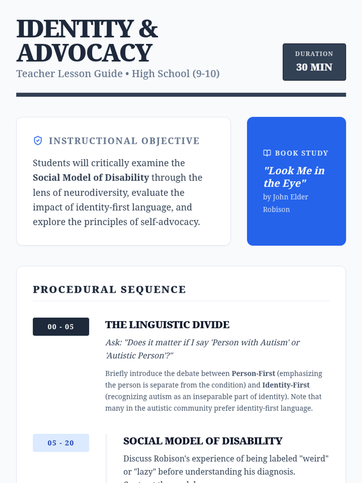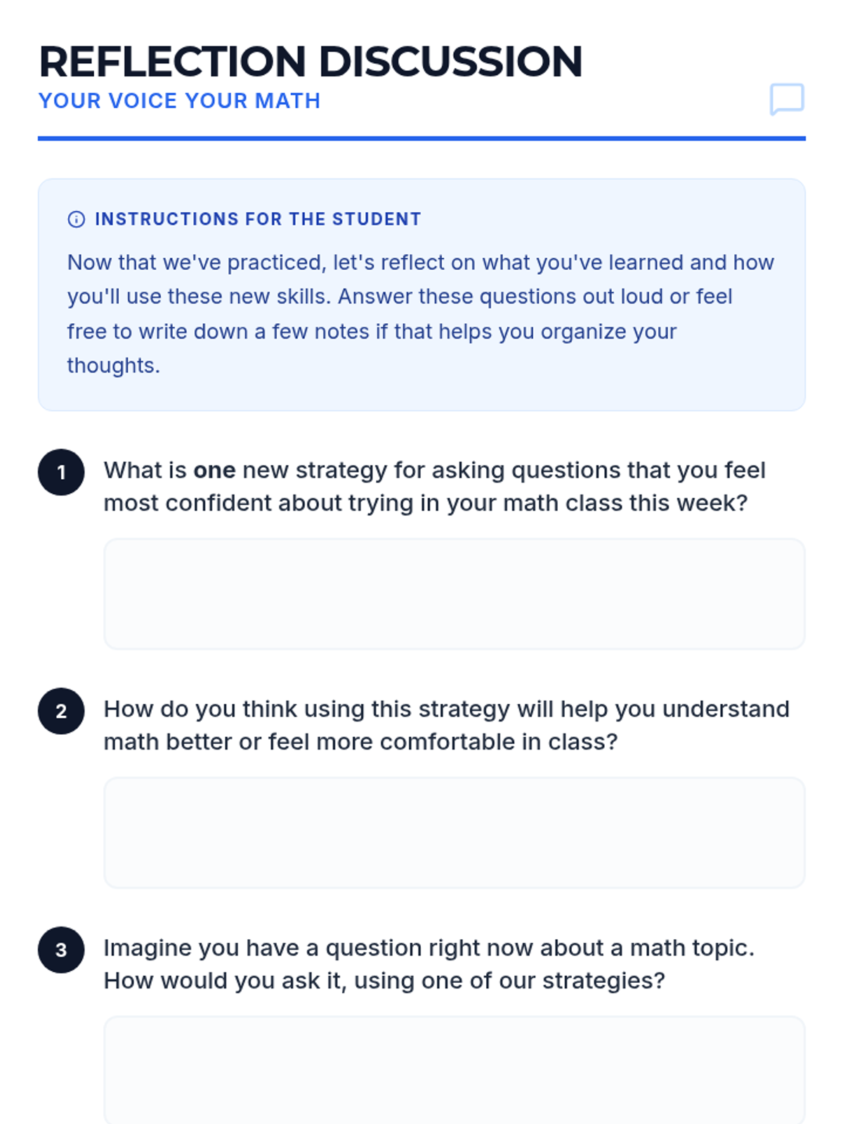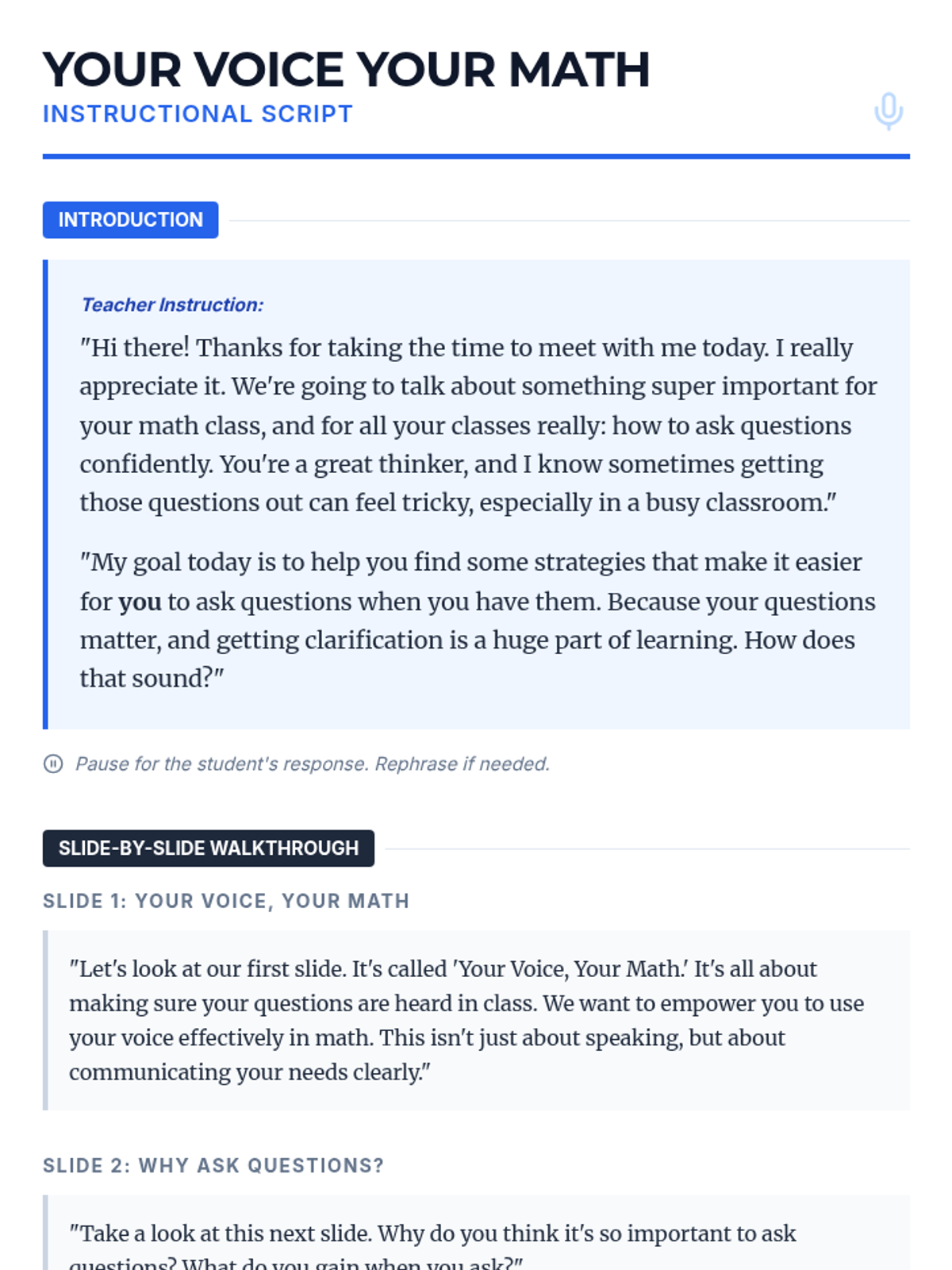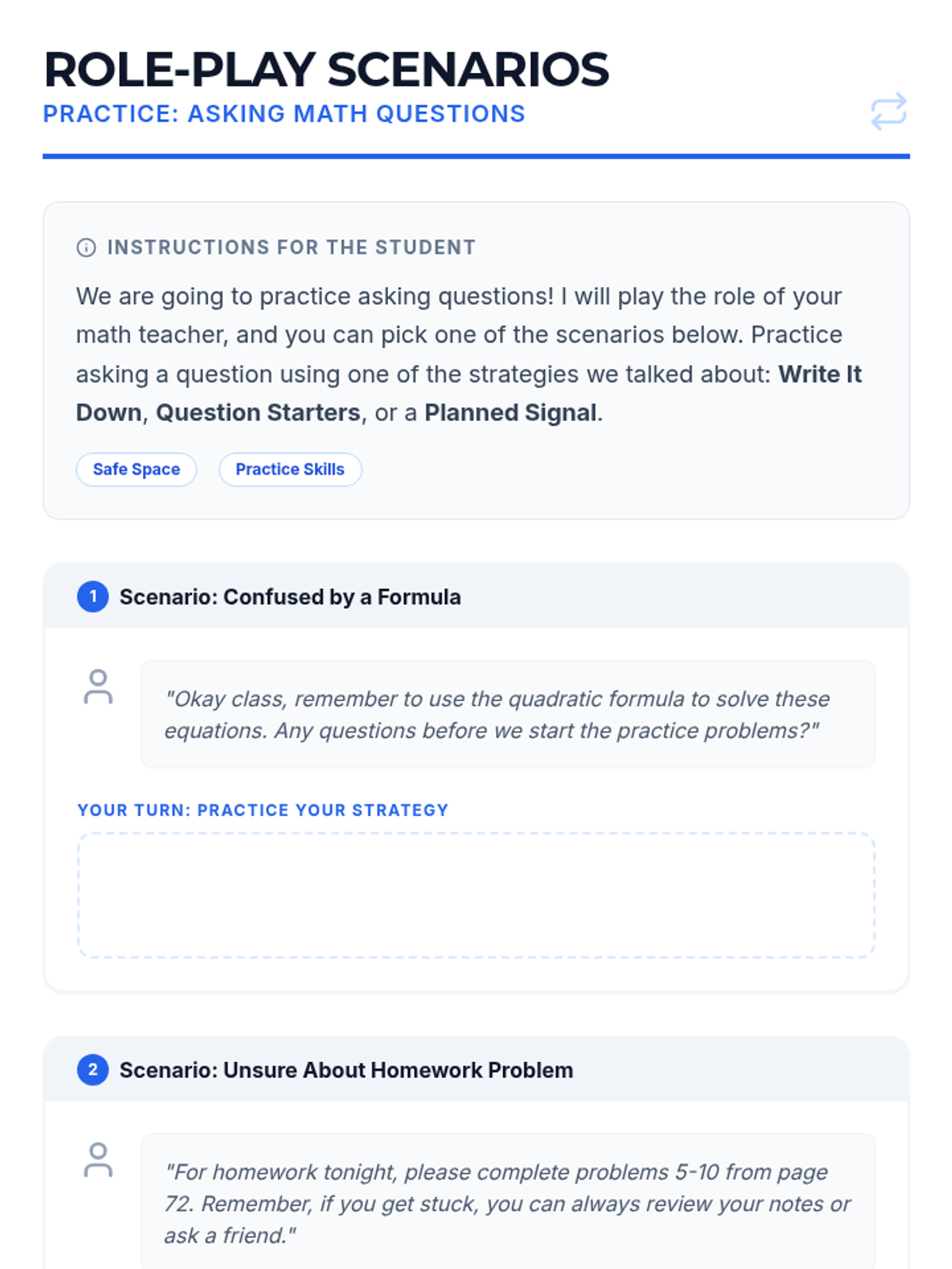 A 15-minute, Tier 3 individual lesson for a 9th-grade student to develop strategies and confidence for asking questions in math class, overcoming communication barriers through self-advocacy.