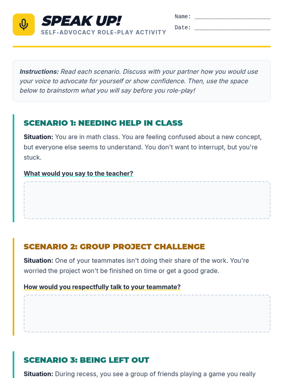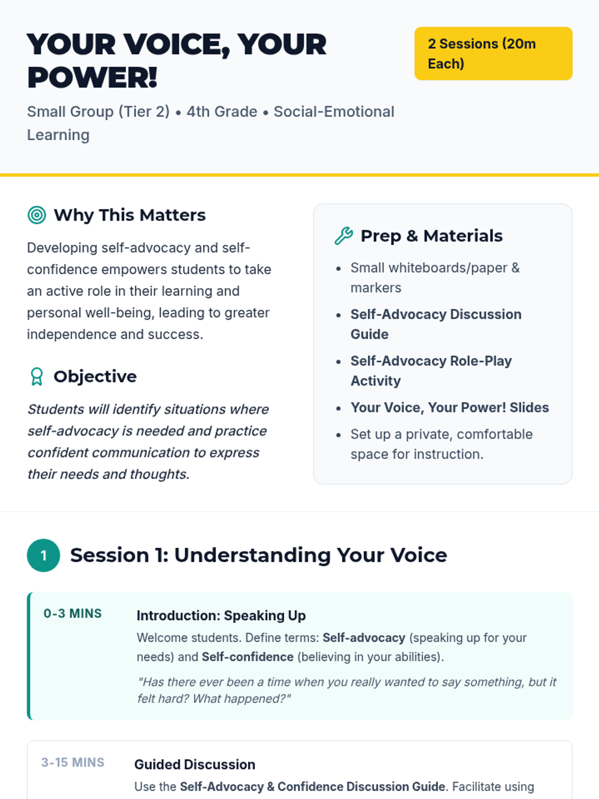 A two-session Tier 2 lesson for 4th graders to build self-advocacy and self-confidence skills through discussion and role-play.