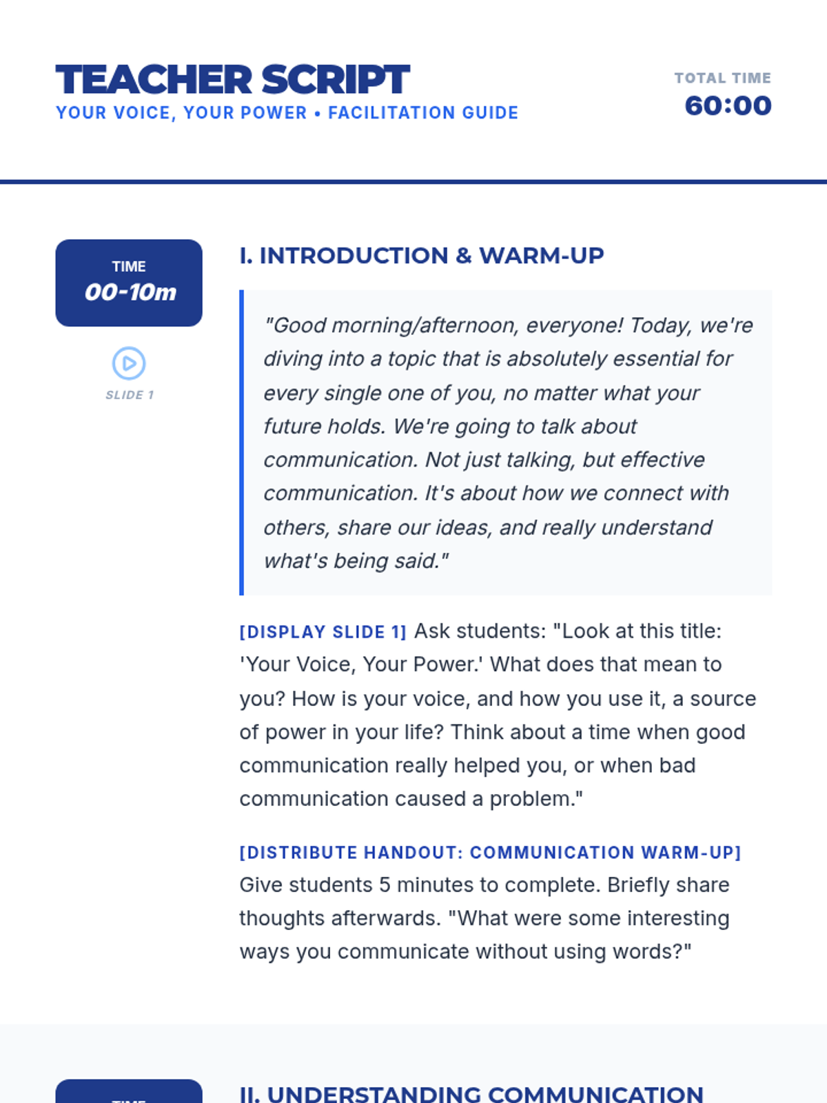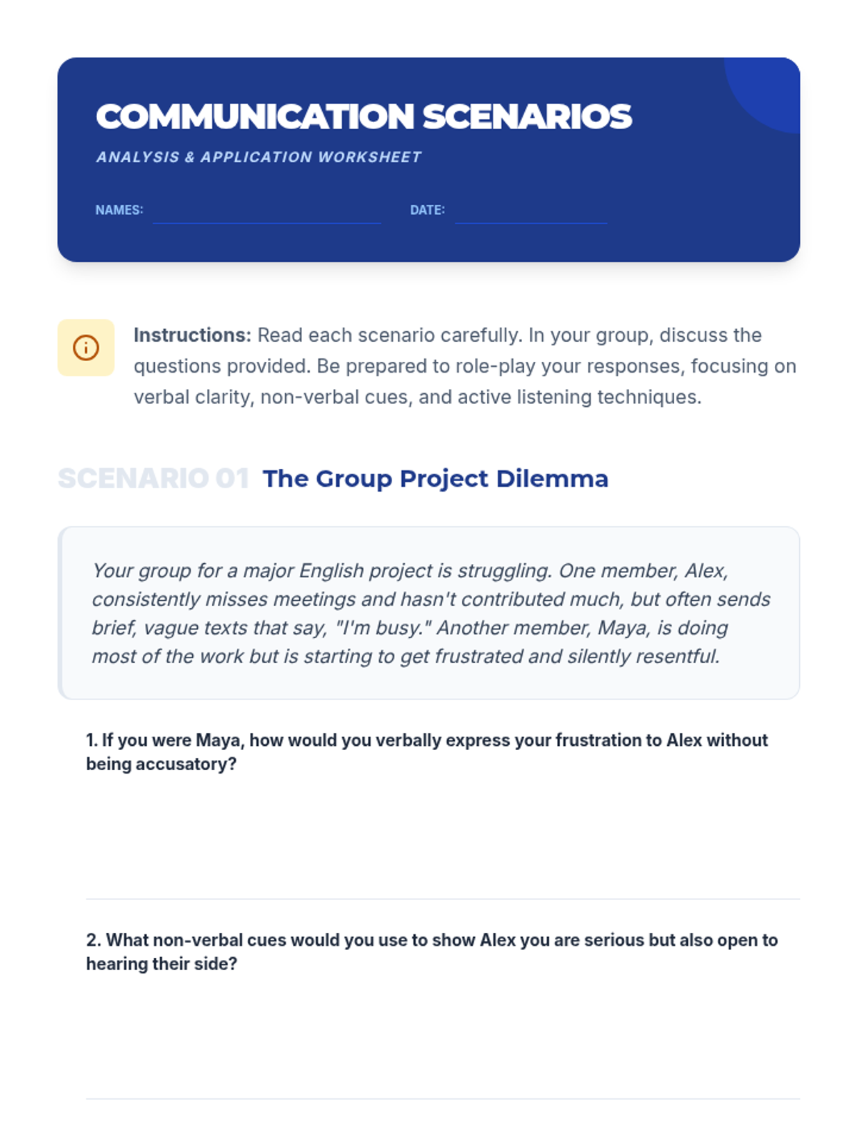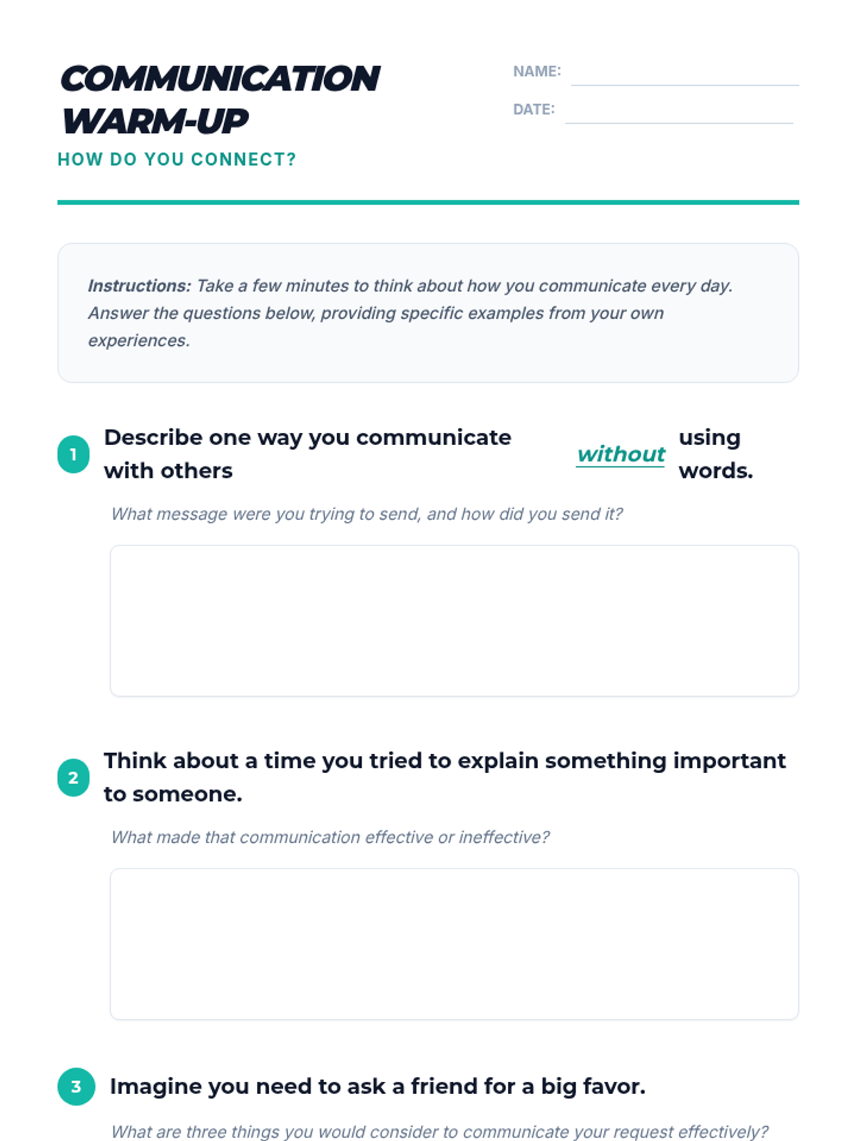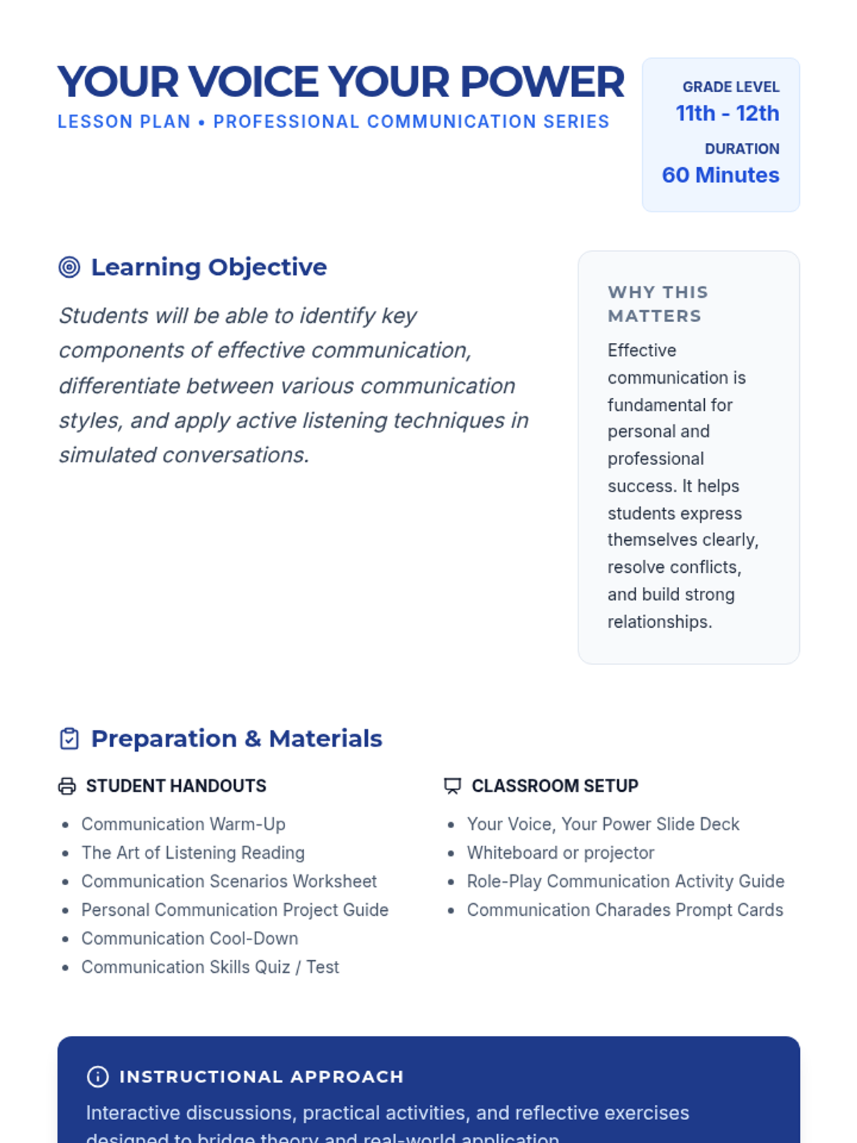 This lesson empowers 11th and 12th-grade students with essential effective communication skills, crucial for success in academics, careers, and personal relationships. Over one 60-minute session, students will explore various communication techniques and practice applying them in real-world scenarios. This lesson is vital for students to articulate their thoughts clearly, listen actively, and navigate diverse social interactions with confidence.
