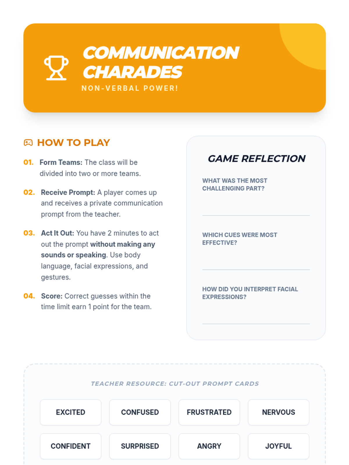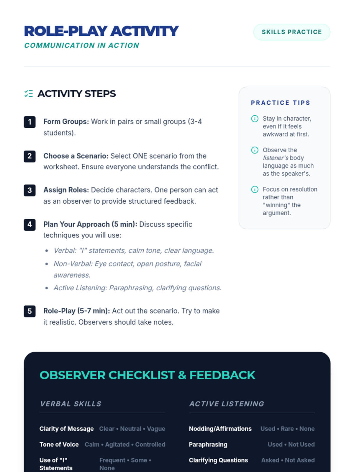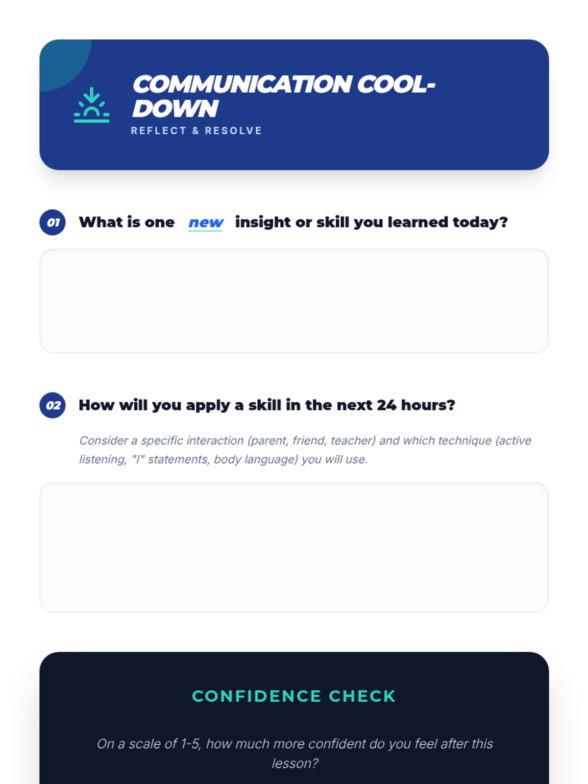 This lesson empowers 11th and 12th-grade students with essential effective communication skills, crucial for success in academics, careers, and personal relationships. Over one 60-minute session, students will explore various communication techniques and practice applying them in real-world scenarios. This lesson is vital for students to articulate their thoughts clearly, listen actively, and navigate diverse social interactions with confidence.