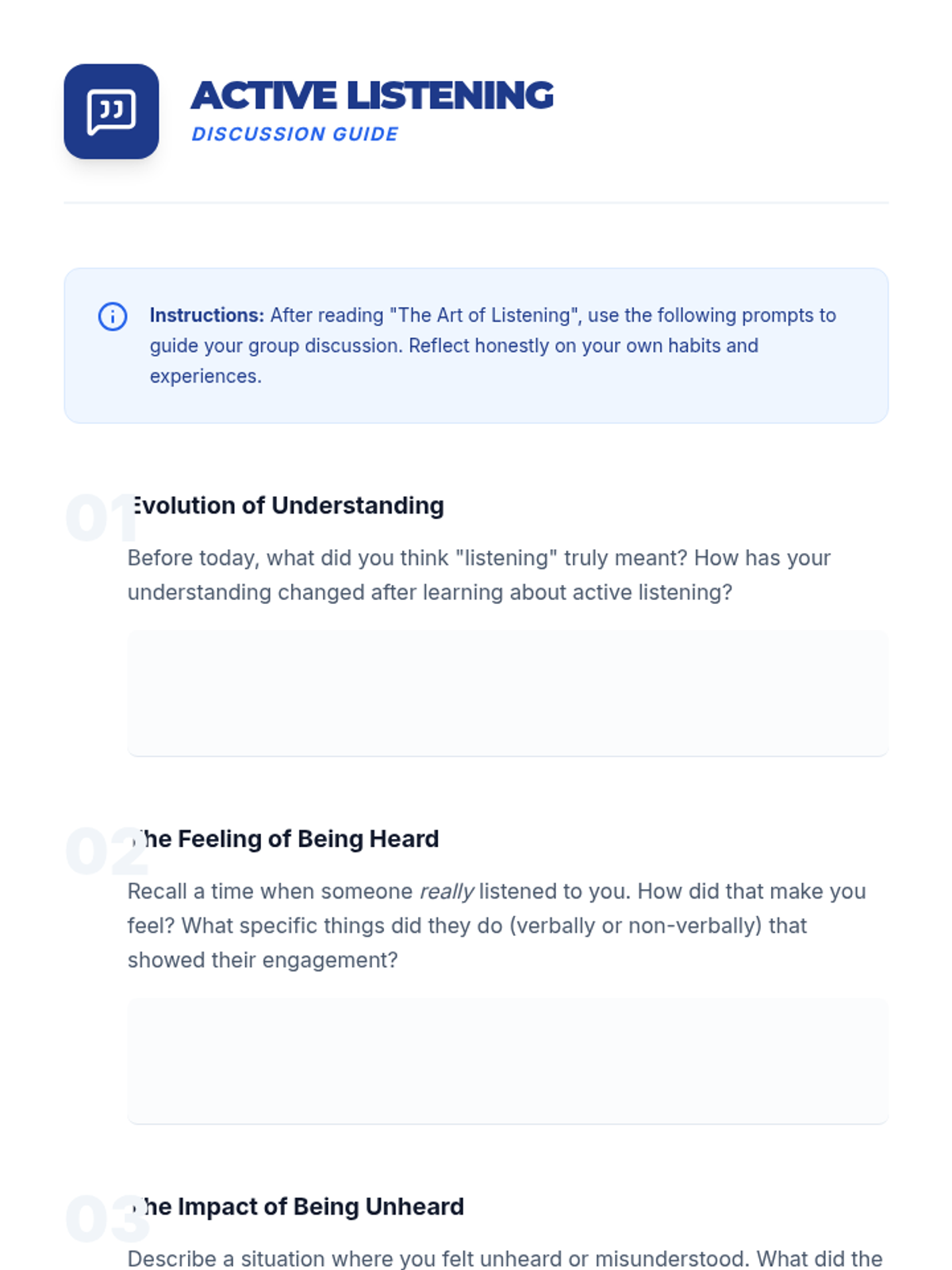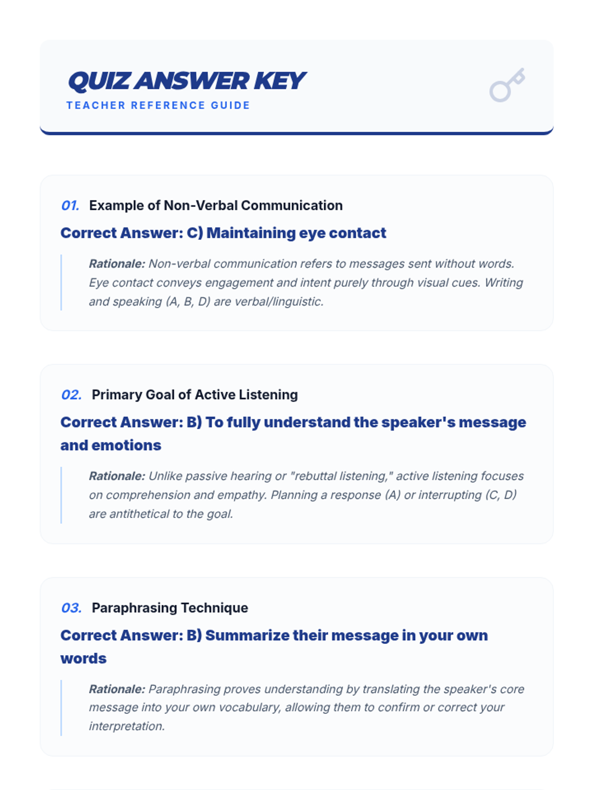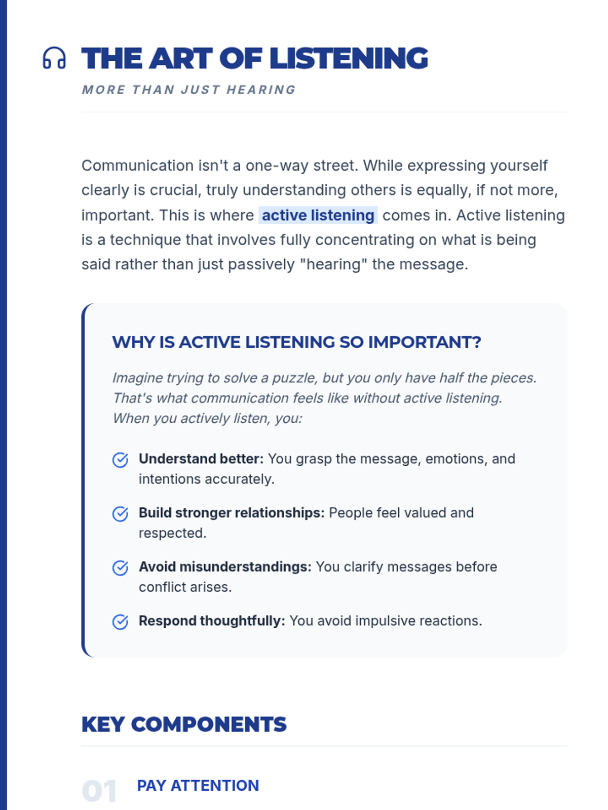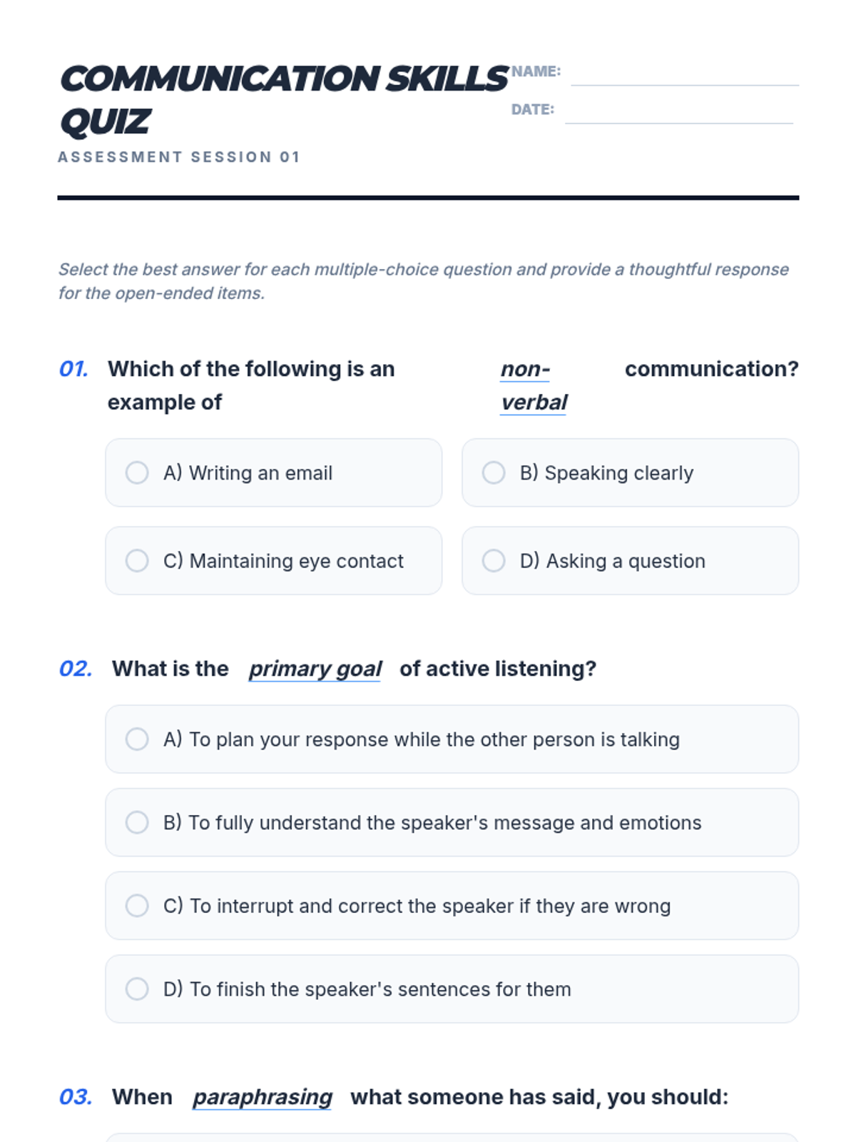 This lesson empowers 11th and 12th-grade students with essential effective communication skills, crucial for success in academics, careers, and personal relationships. Over one 60-minute session, students will explore various communication techniques and practice applying them in real-world scenarios. This lesson is vital for students to articulate their thoughts clearly, listen actively, and navigate diverse social interactions with confidence.