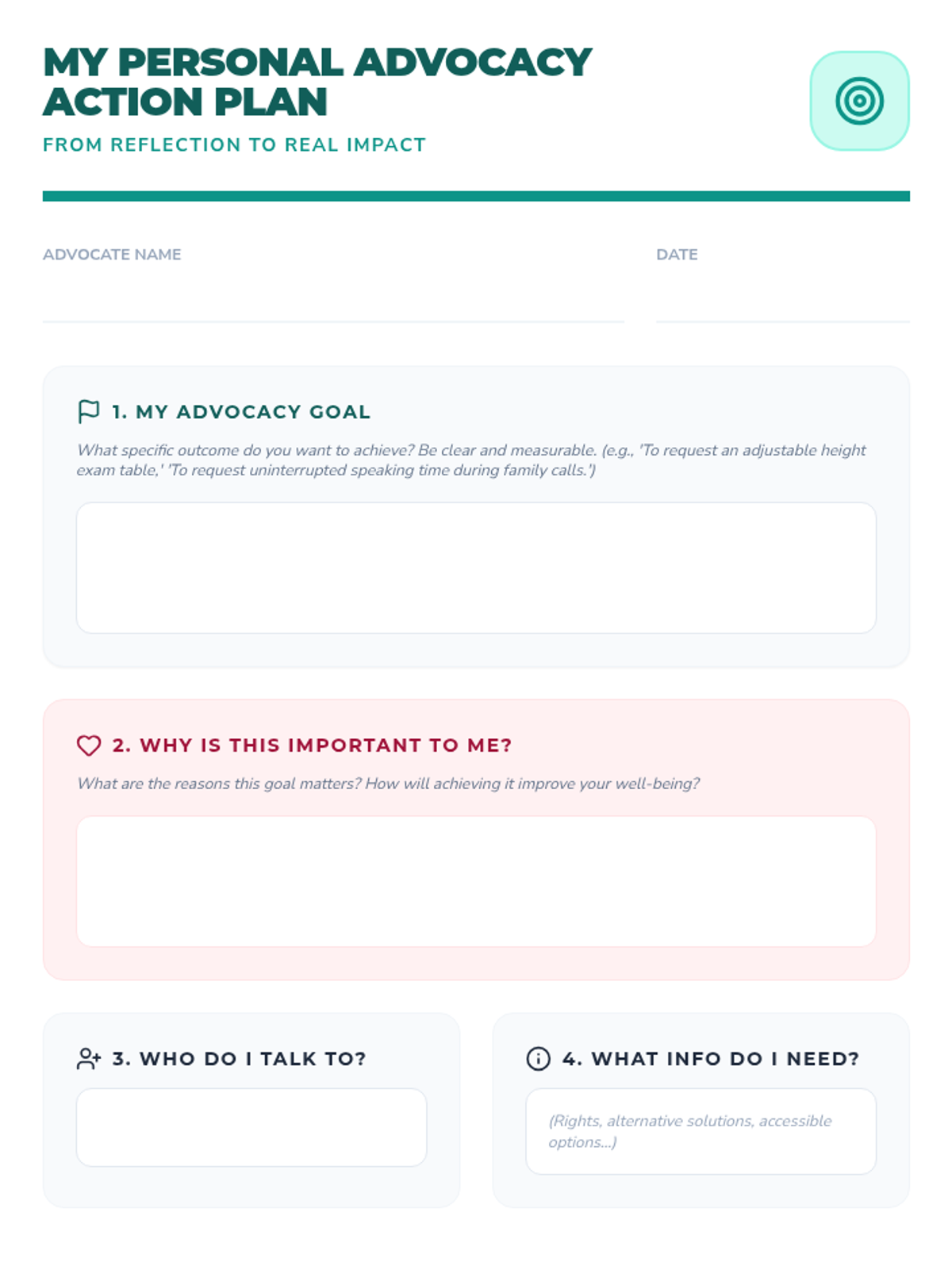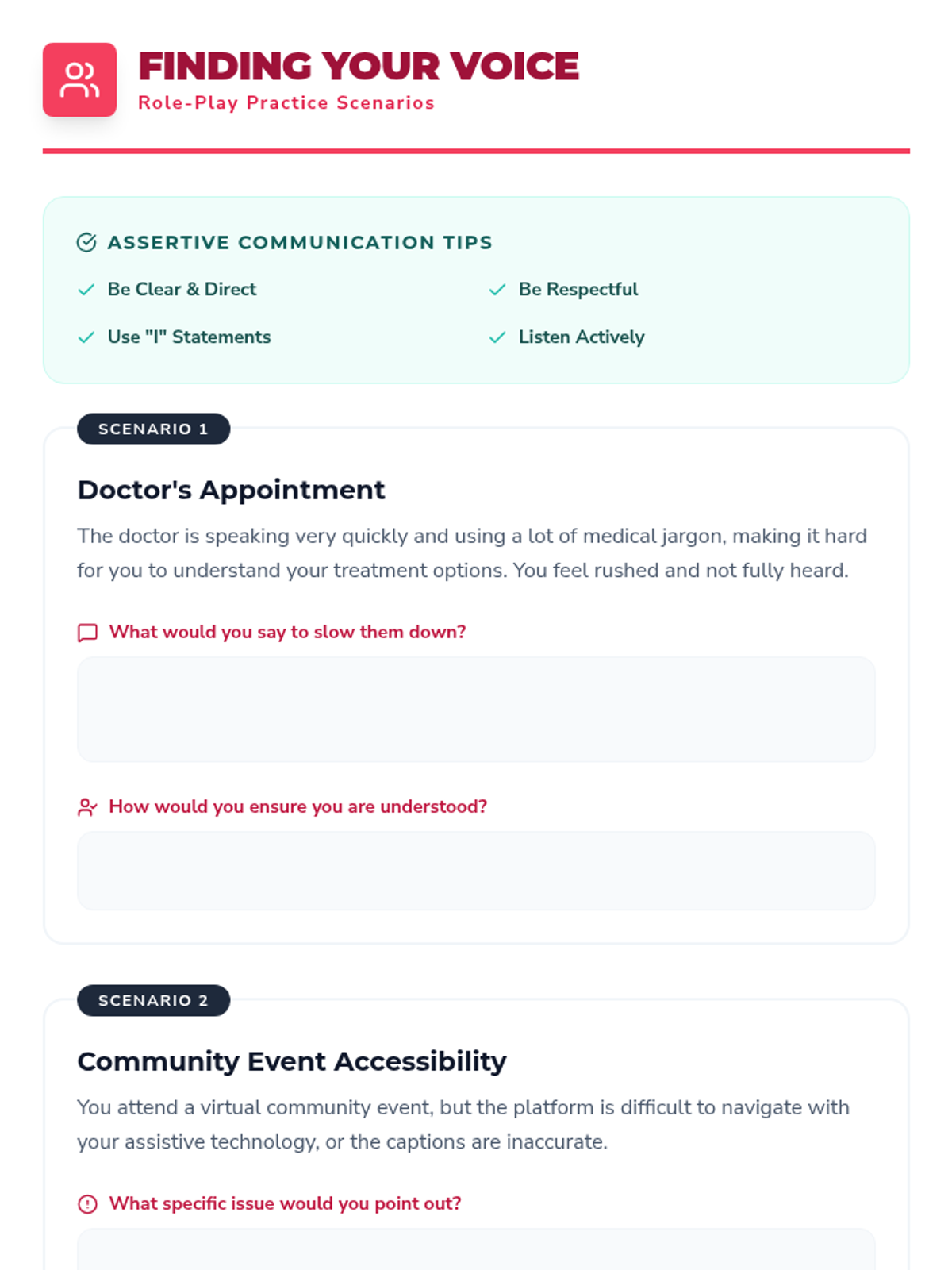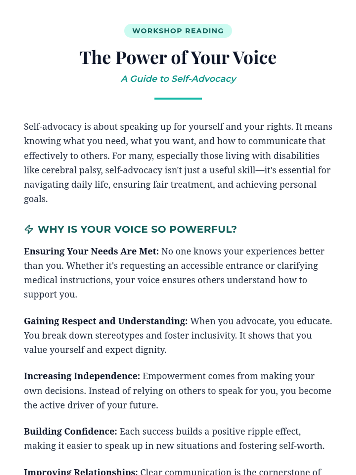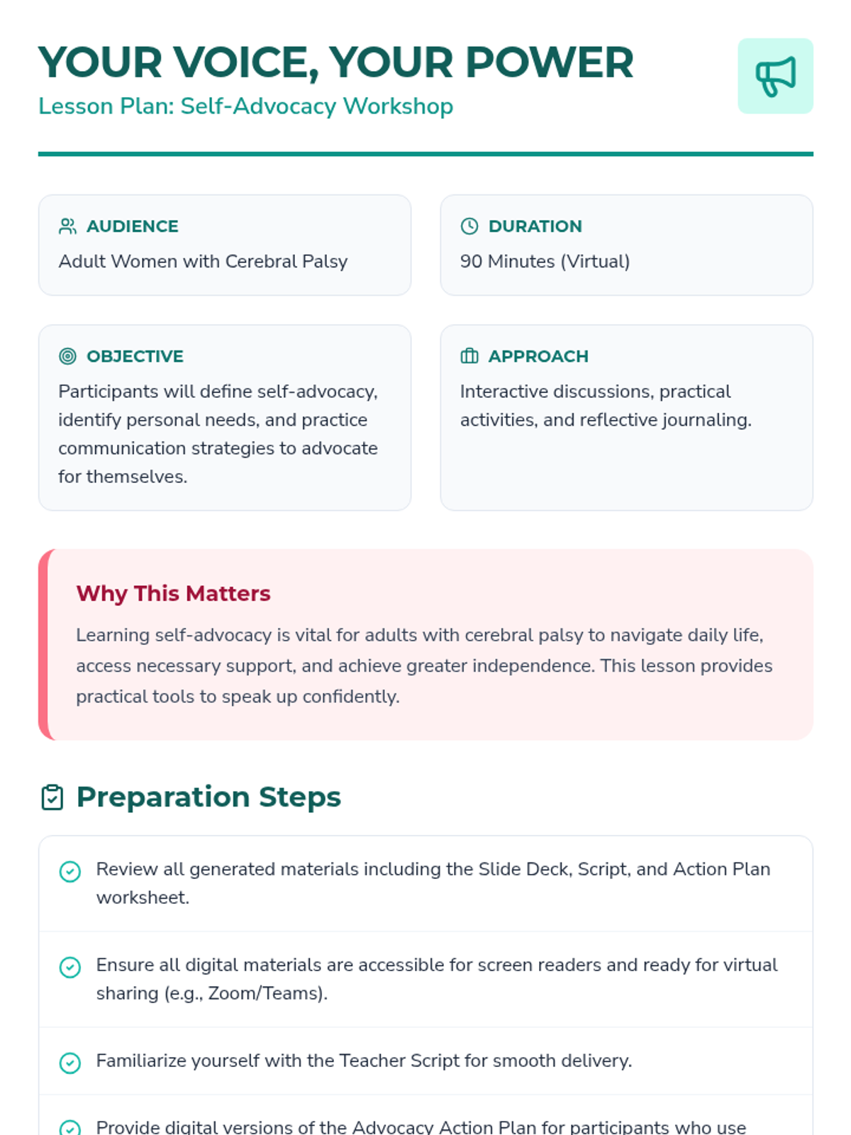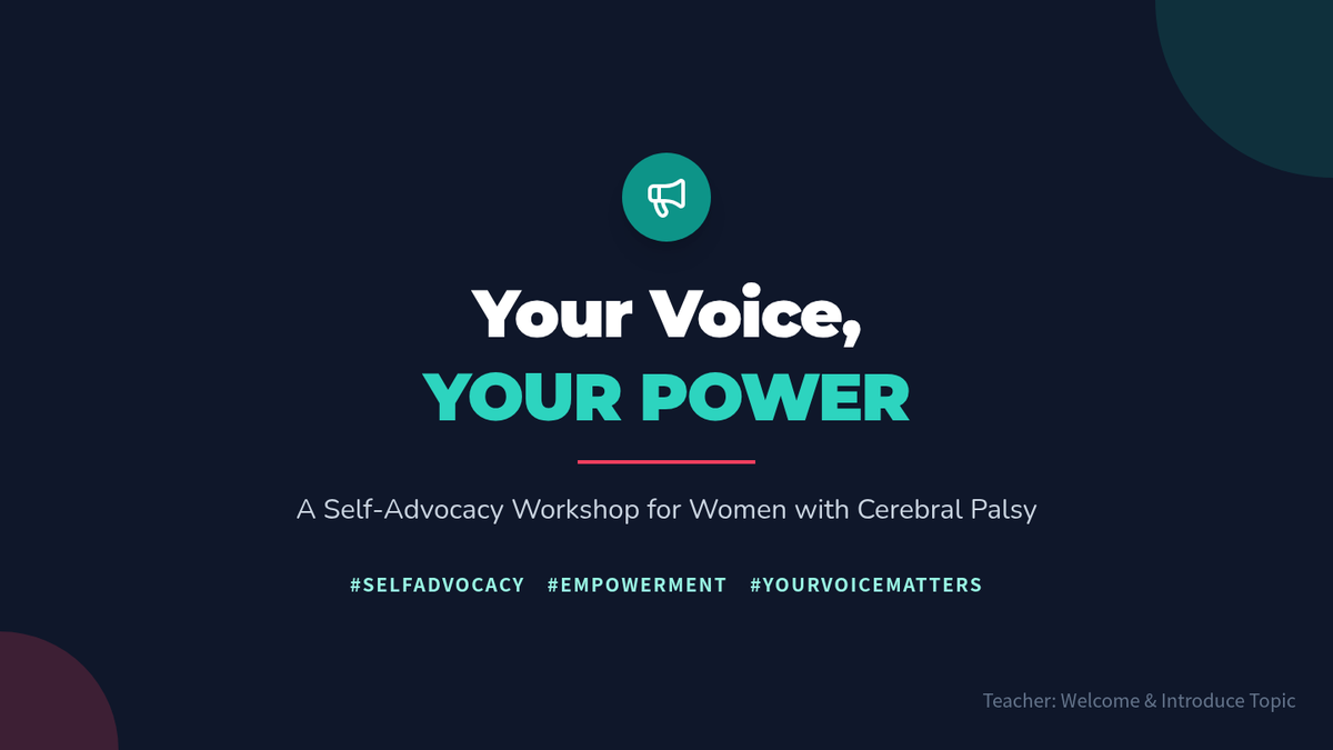 A 90-minute virtual workshop for adult women with cerebral palsy to develop self-advocacy skills, focusing on assertive communication, identifying needs, and creating actionable advocacy plans.