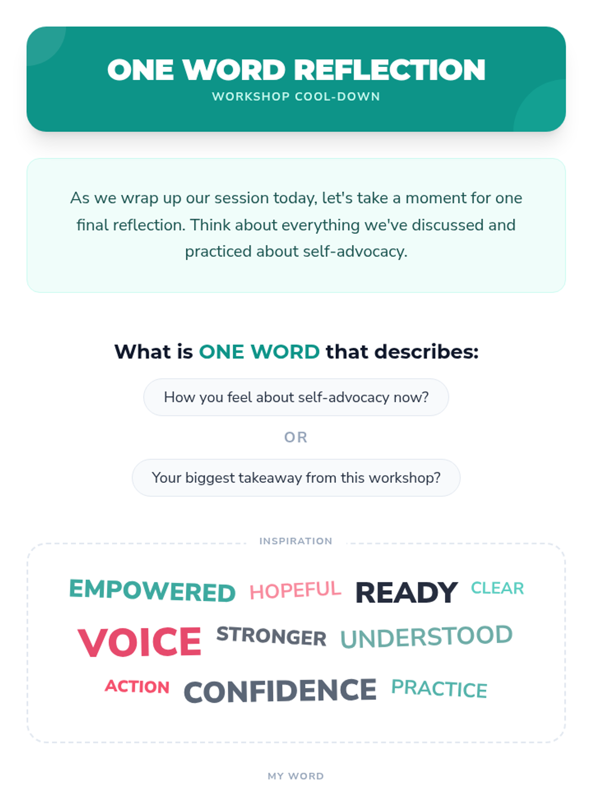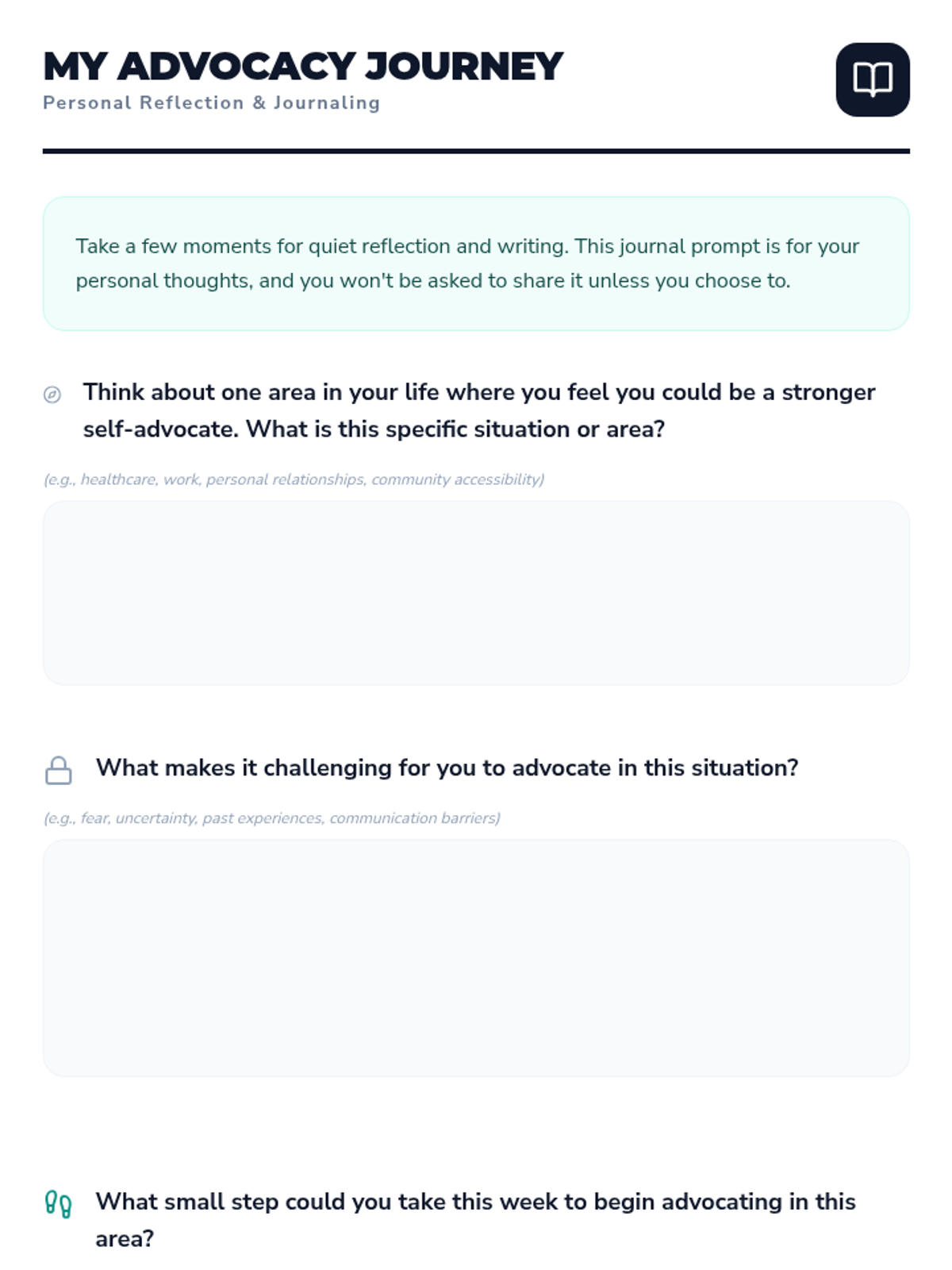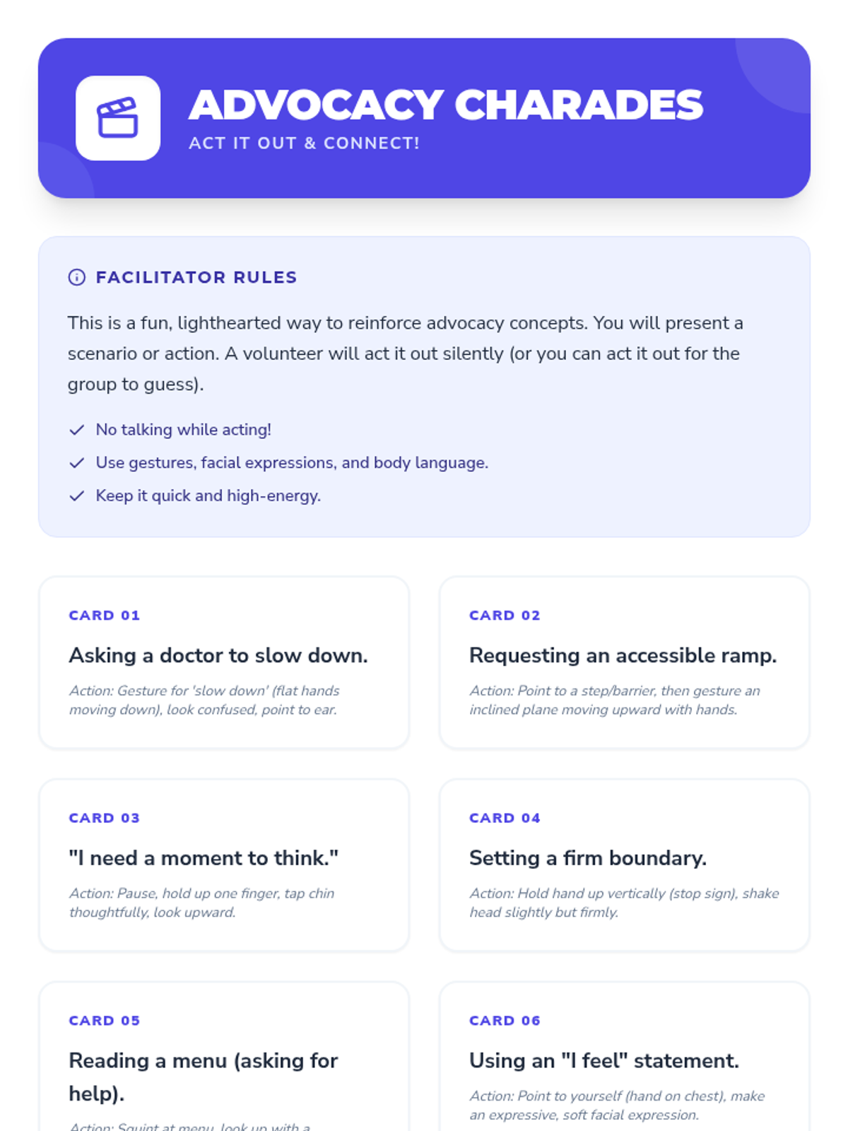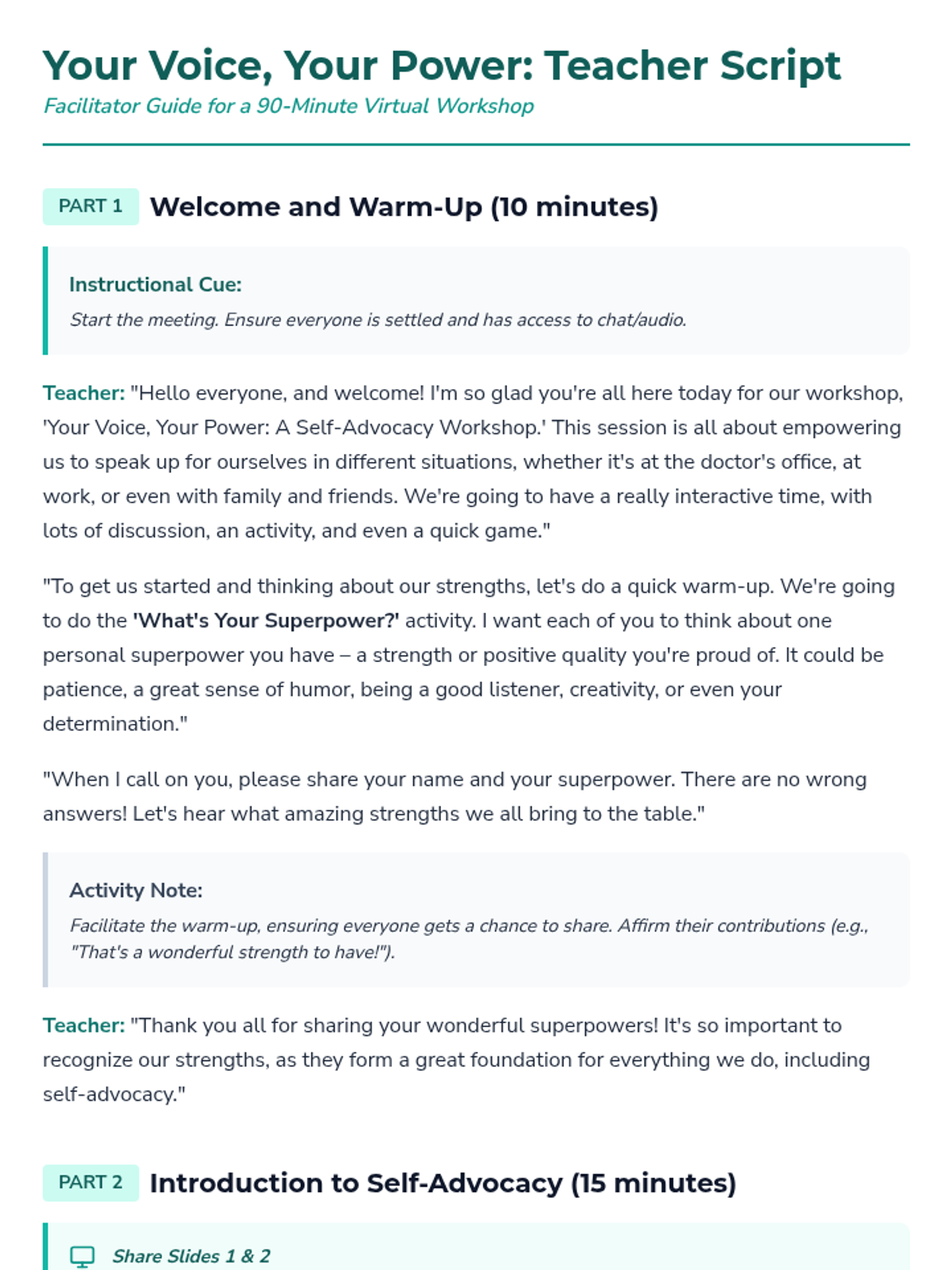 A 90-minute virtual workshop for adult women with cerebral palsy to develop self-advocacy skills, focusing on assertive communication, identifying needs, and creating actionable advocacy plans.