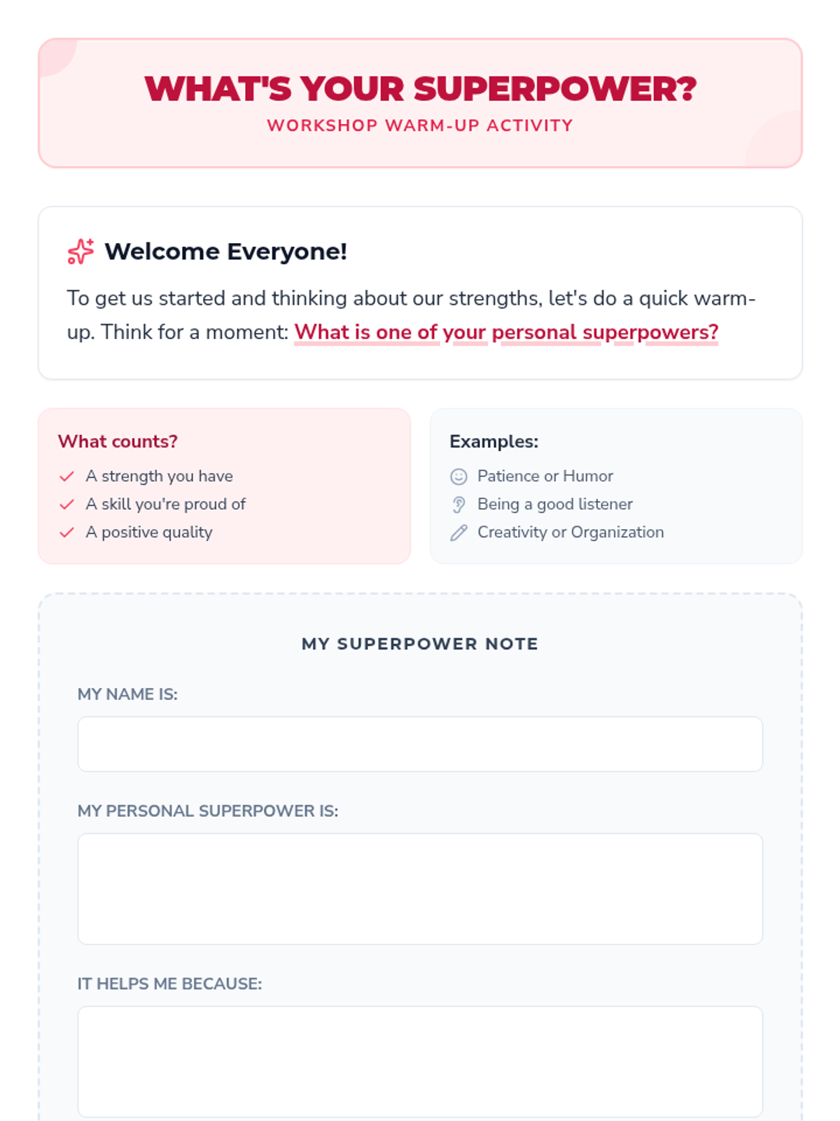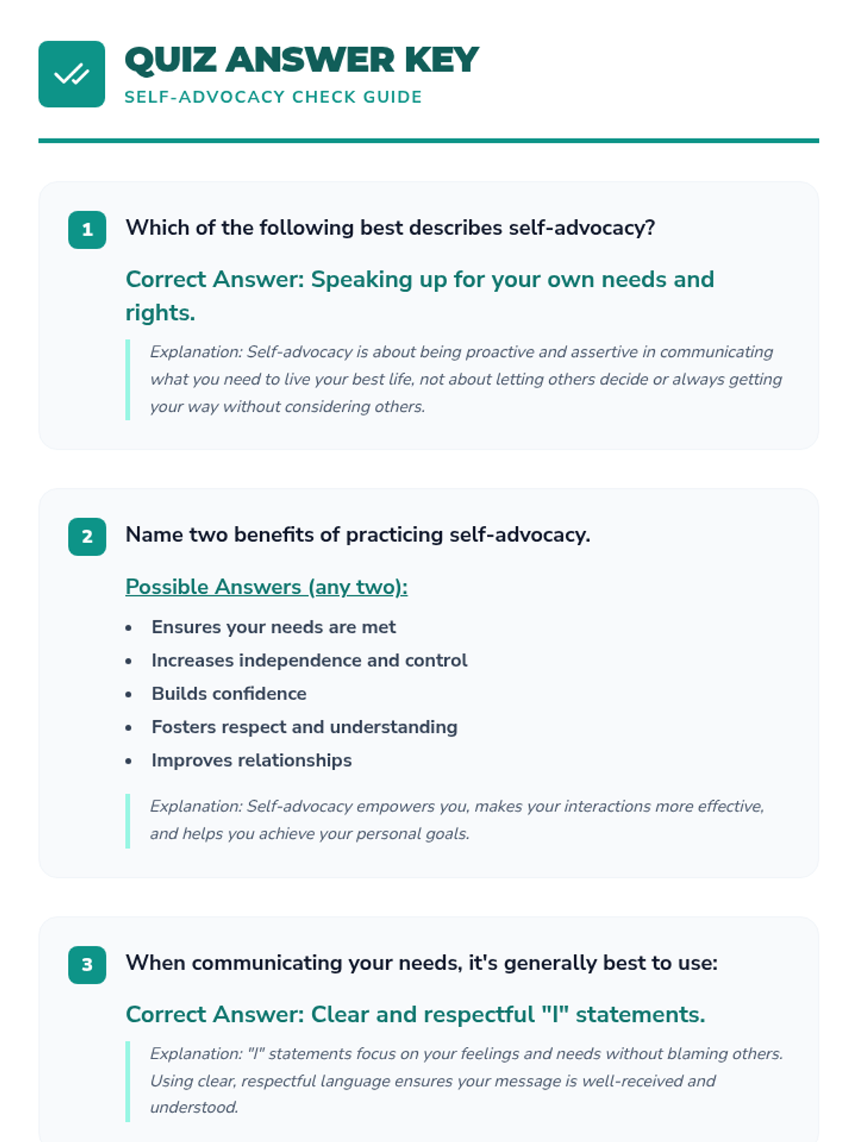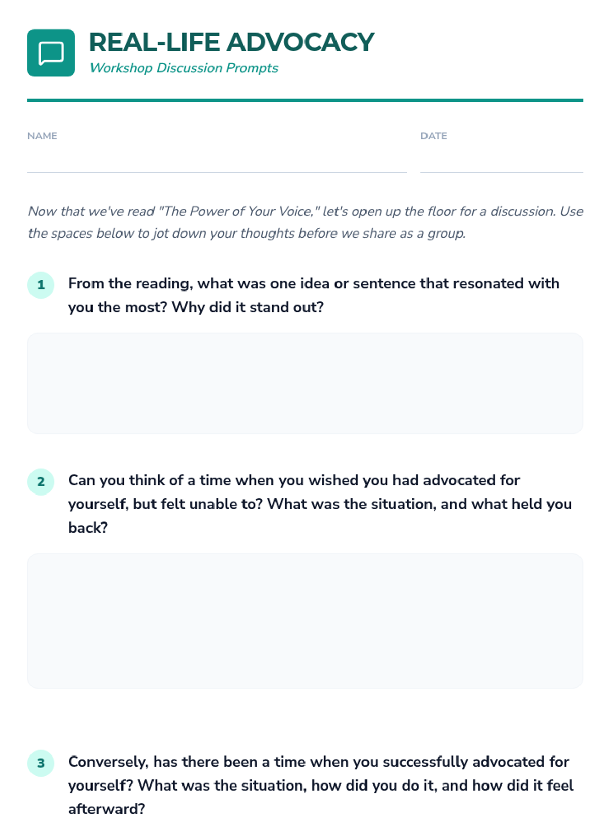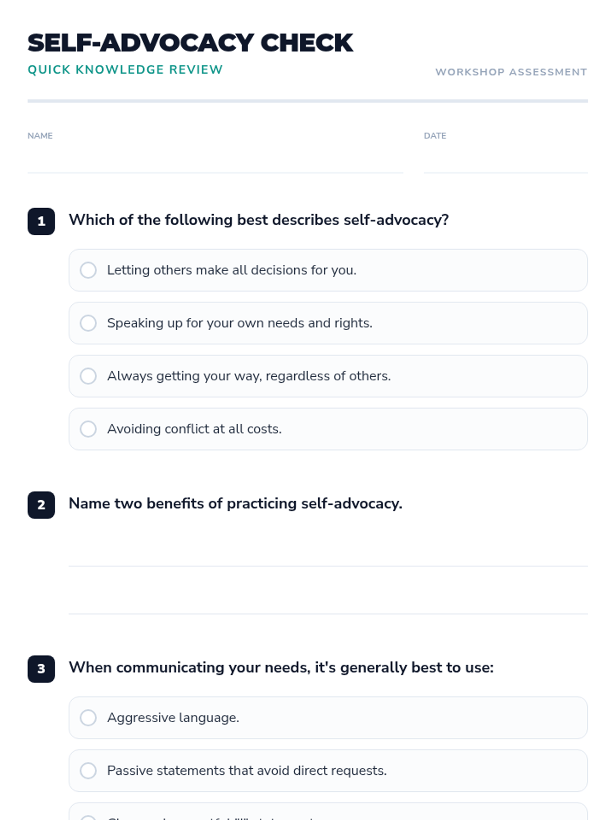 A 90-minute virtual workshop for adult women with cerebral palsy to develop self-advocacy skills, focusing on assertive communication, identifying needs, and creating actionable advocacy plans.