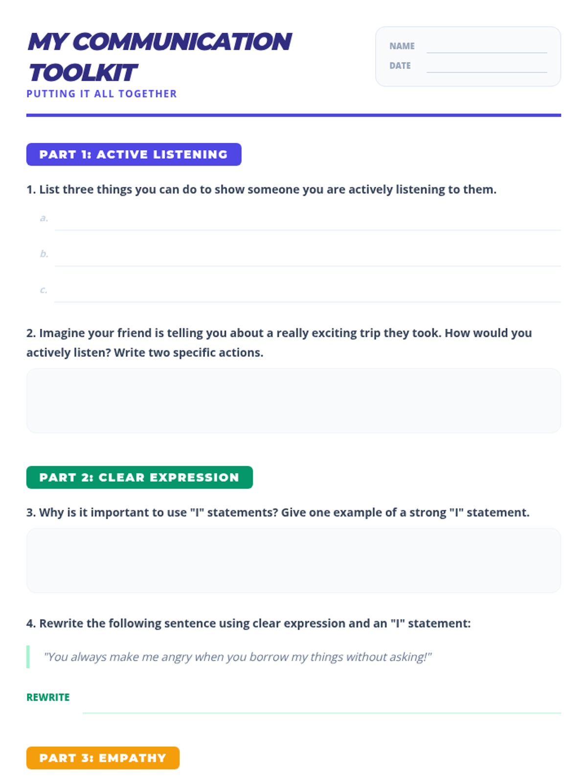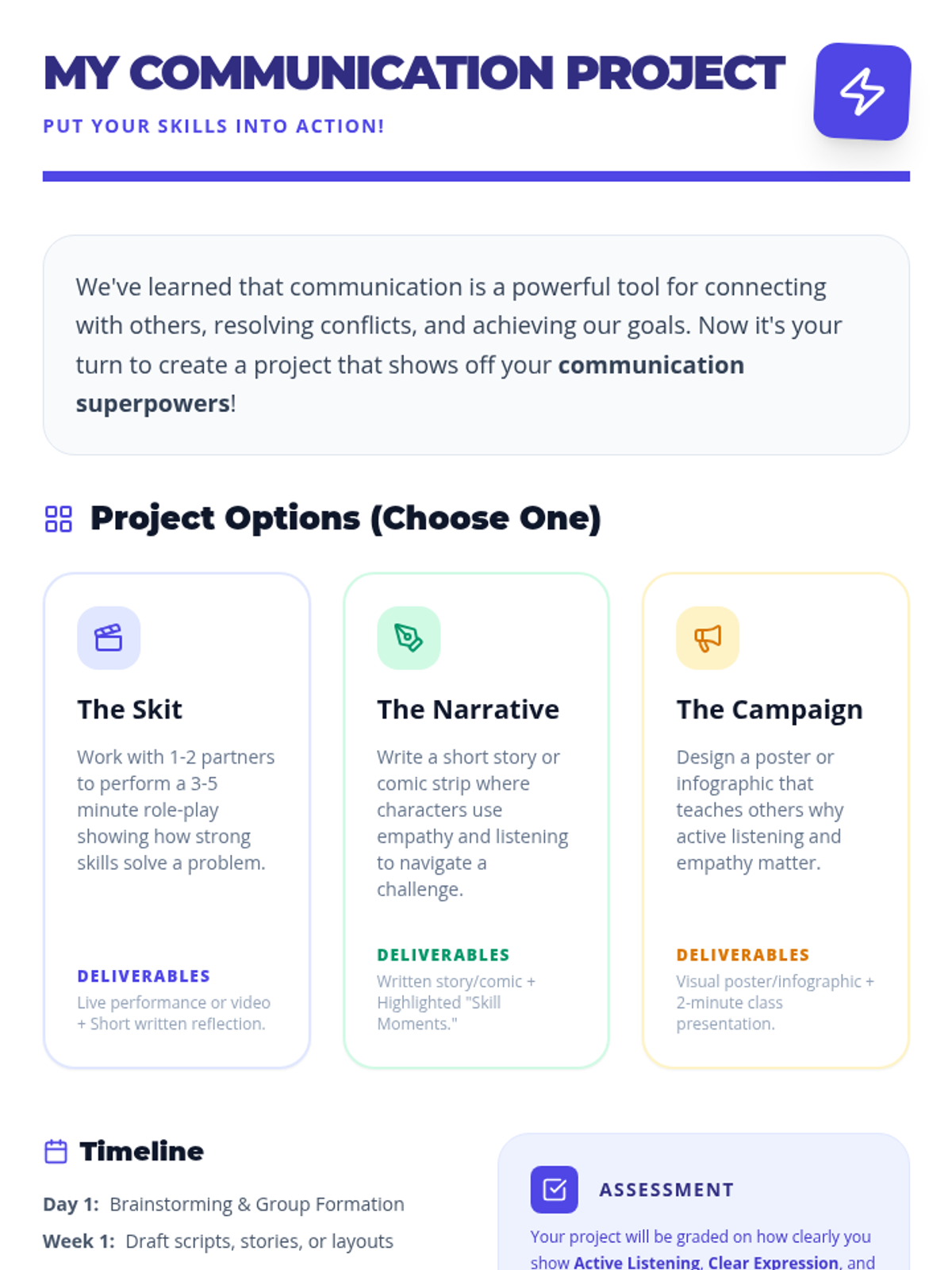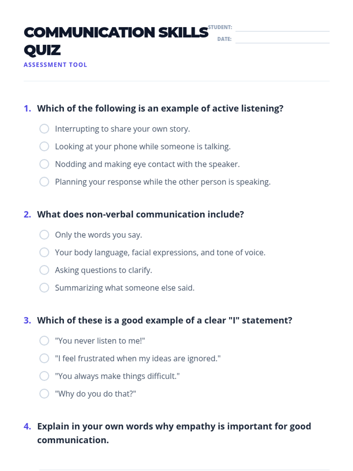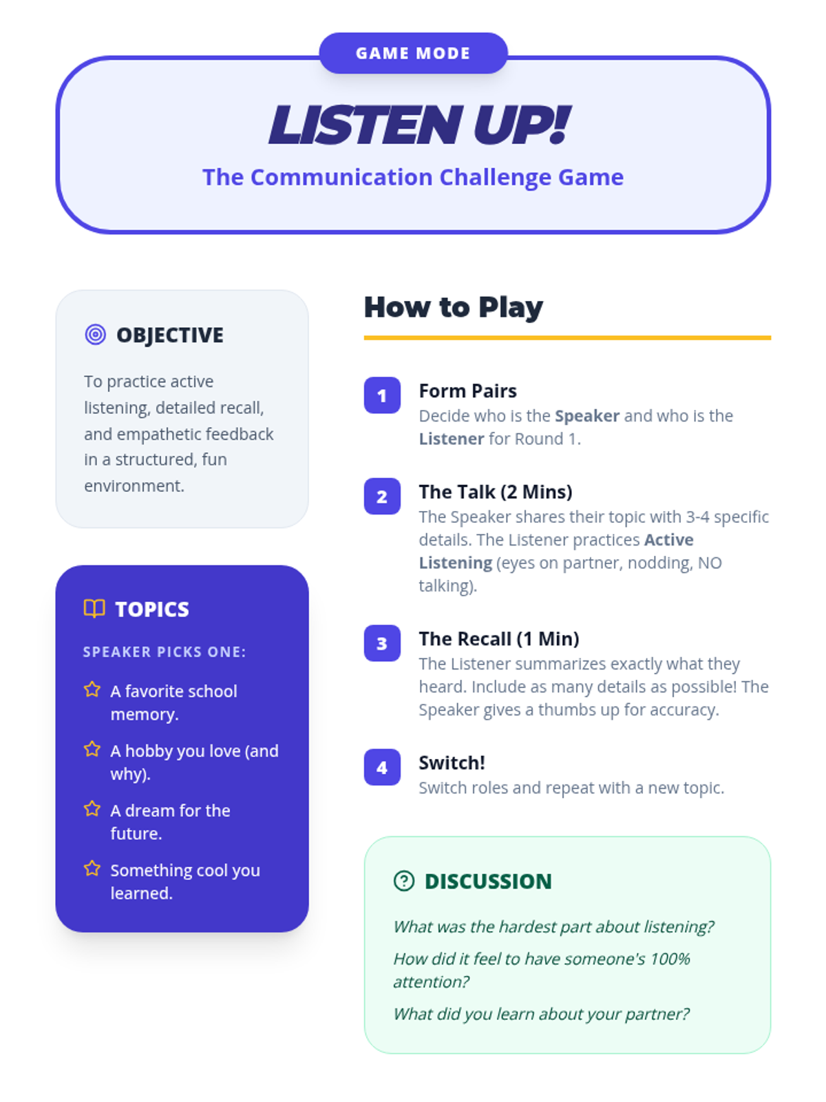 This lesson helps students develop essential communication skills for everyday life through interactive activities, role-playing, and reflection on active listening, clear expression, and empathy.