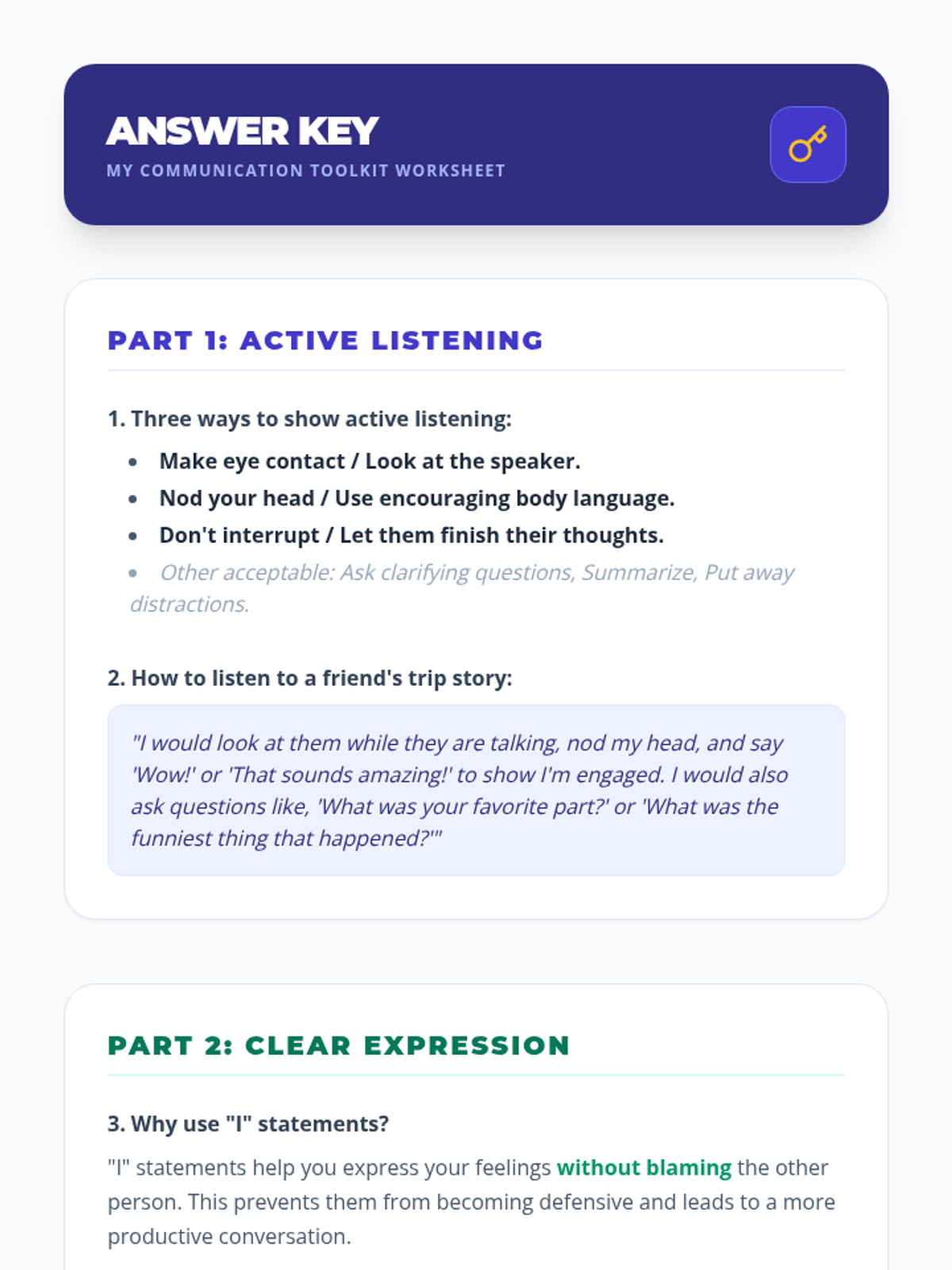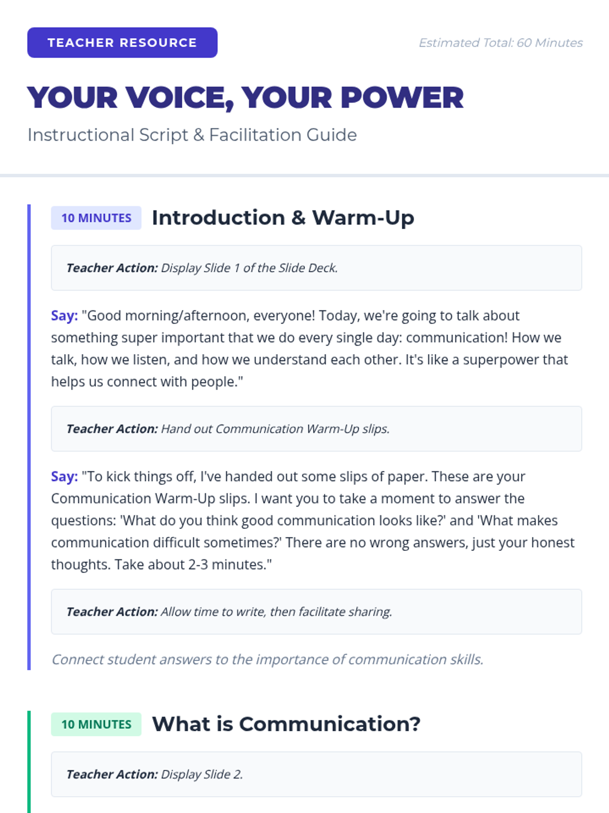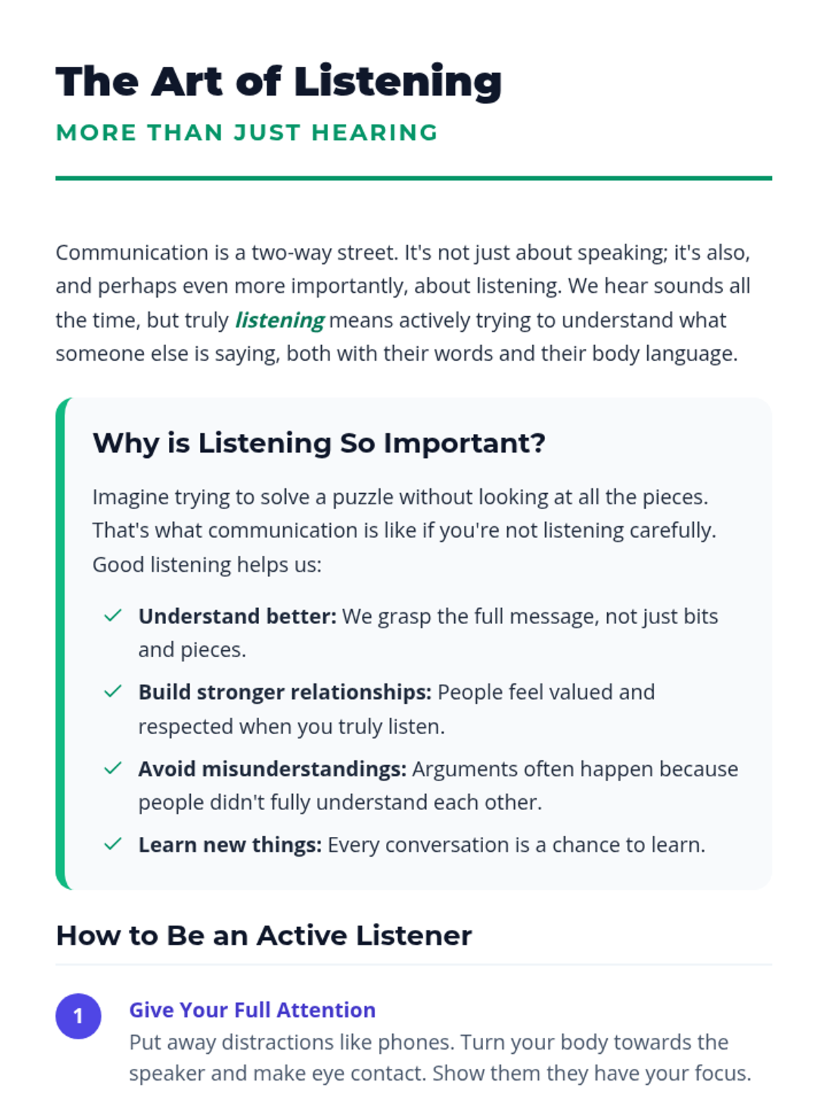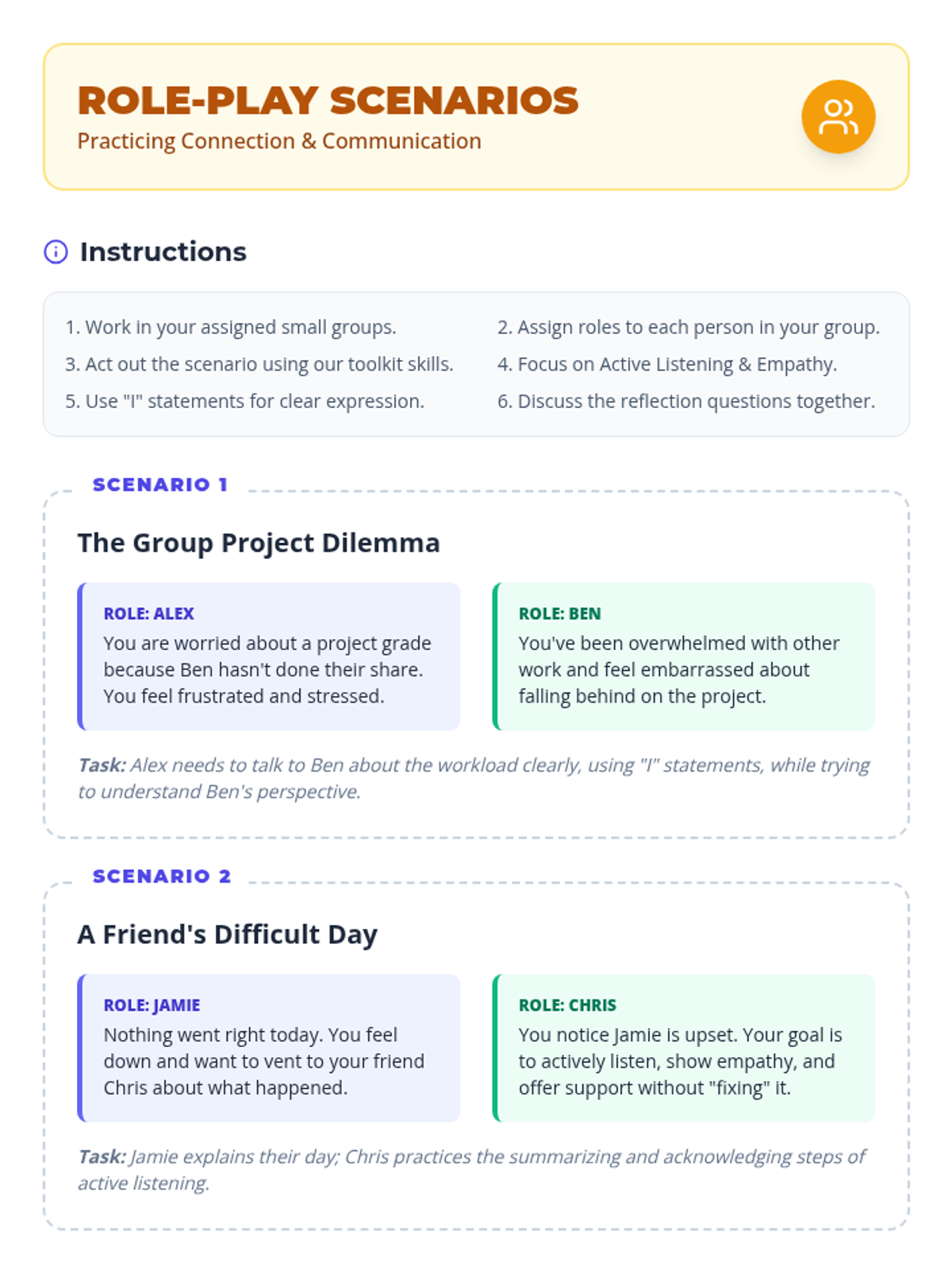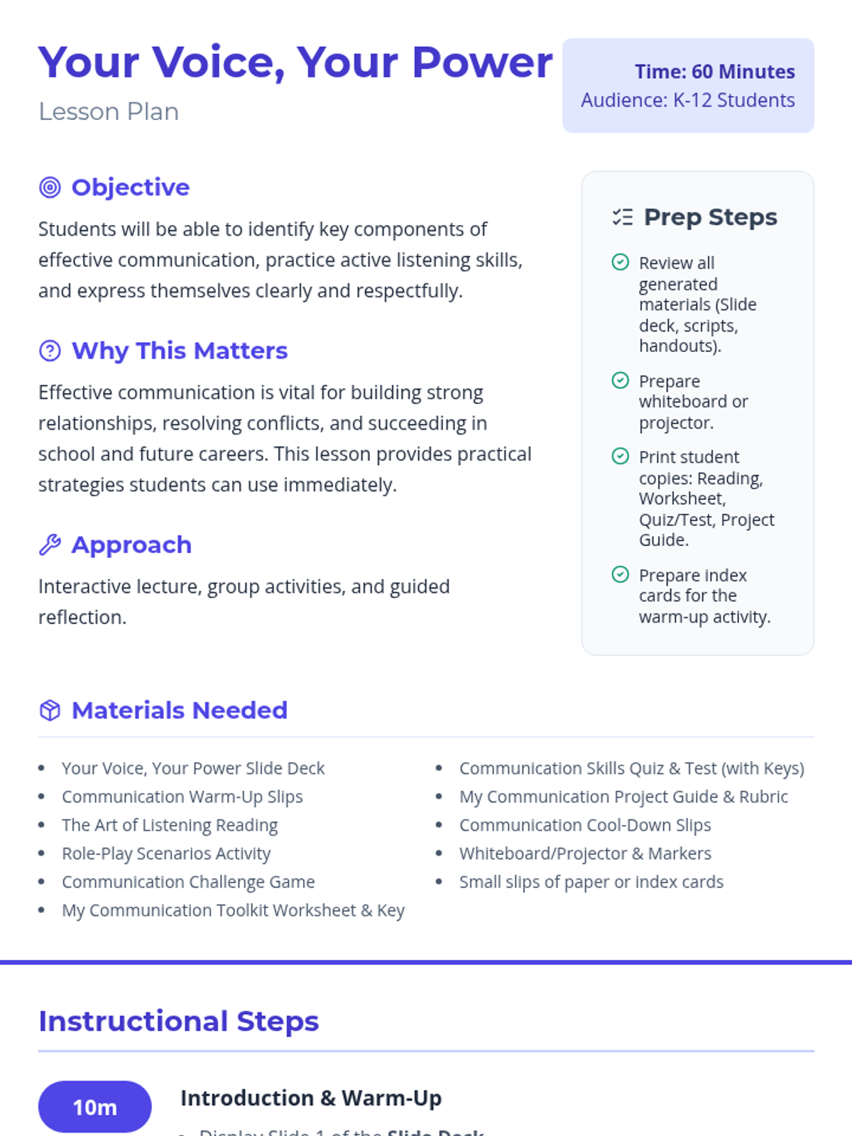 This lesson helps students develop essential communication skills for everyday life through interactive activities, role-playing, and reflection on active listening, clear expression, and empathy.