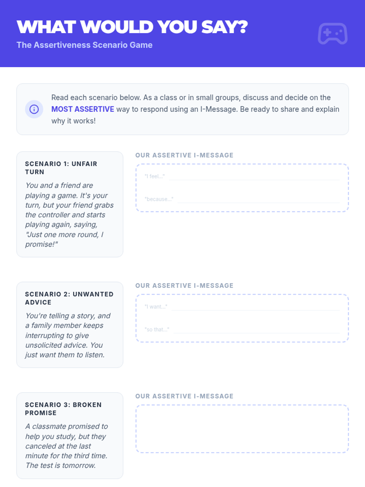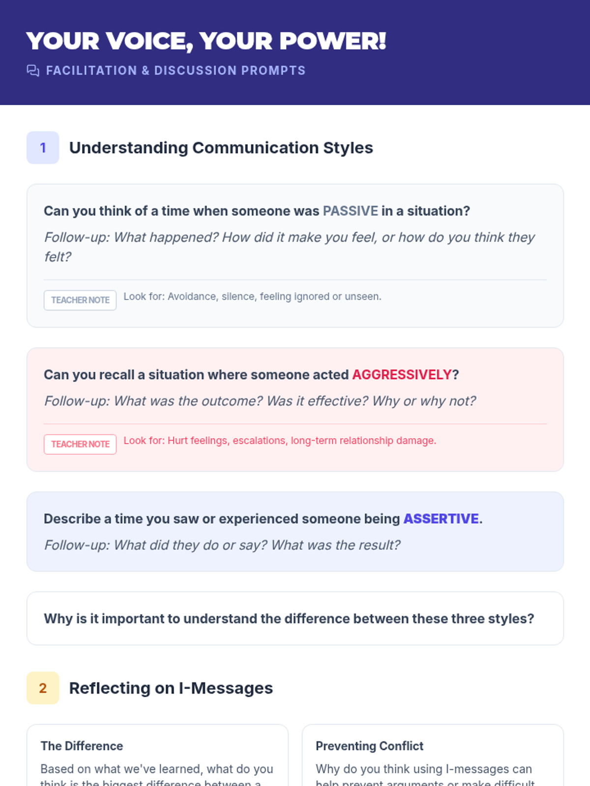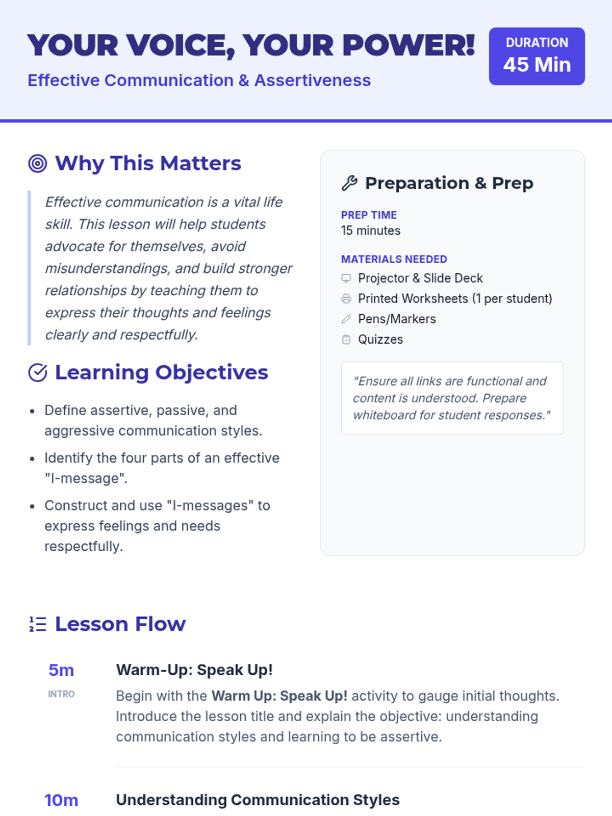 This 45-minute lesson empowers youth to communicate effectively by understanding assertiveness, passivity, and aggression, featuring hands-on practice with 'I-messages'.