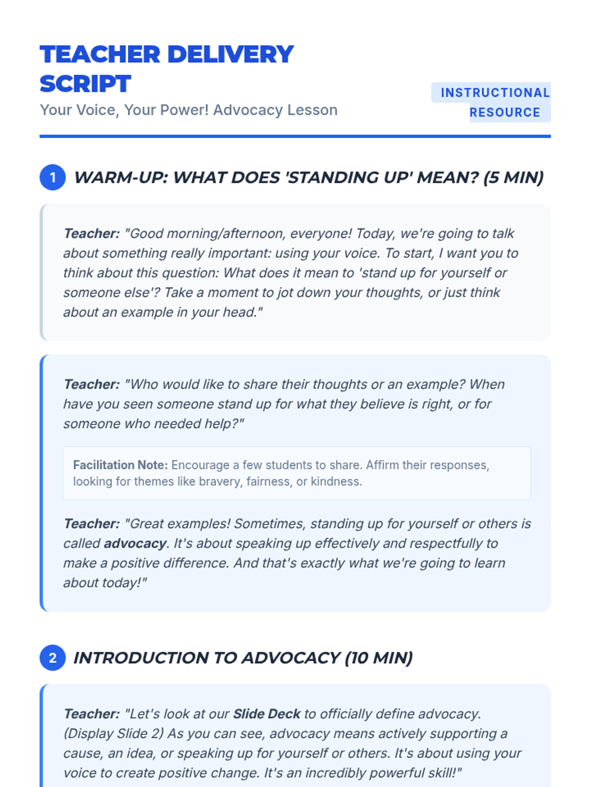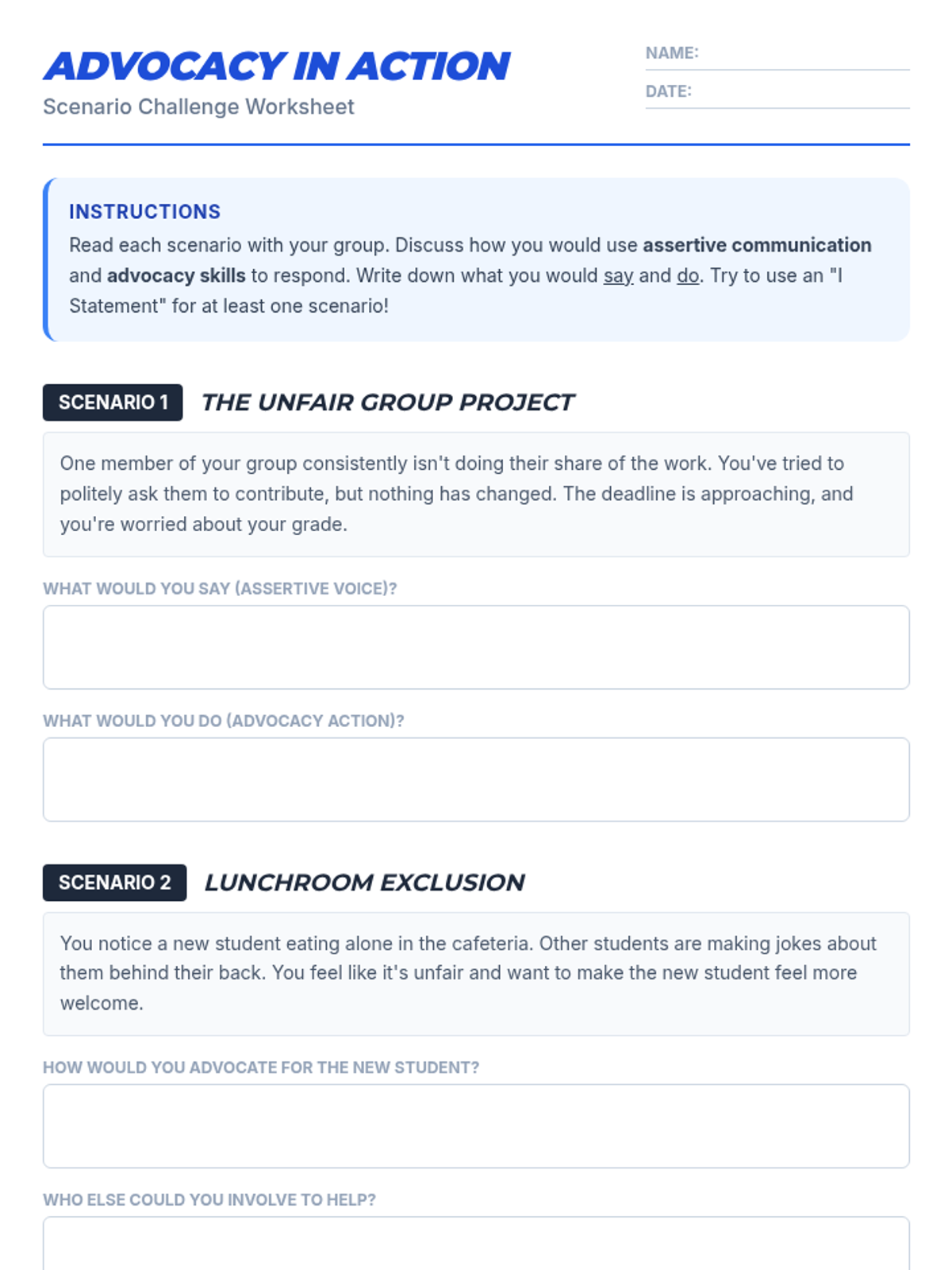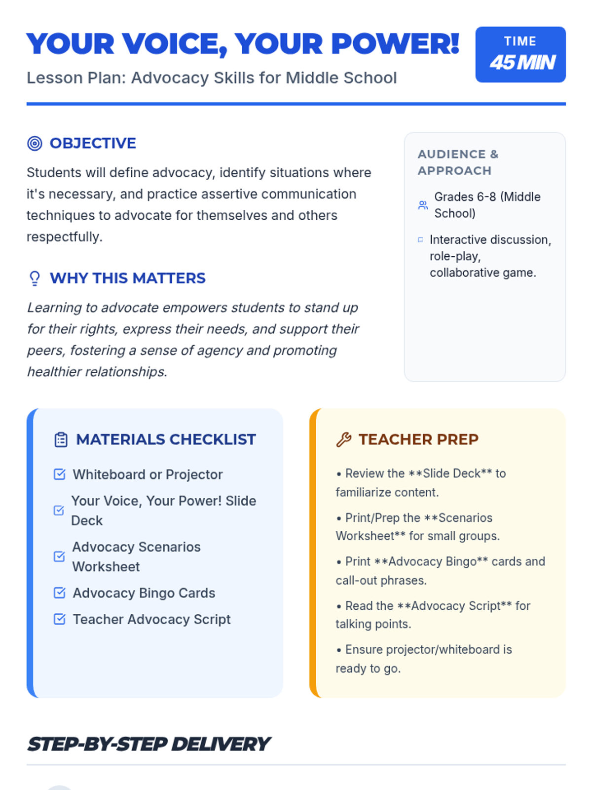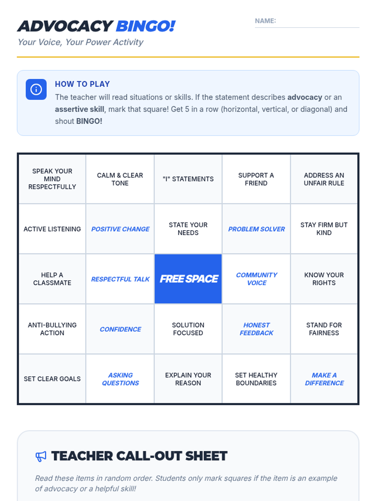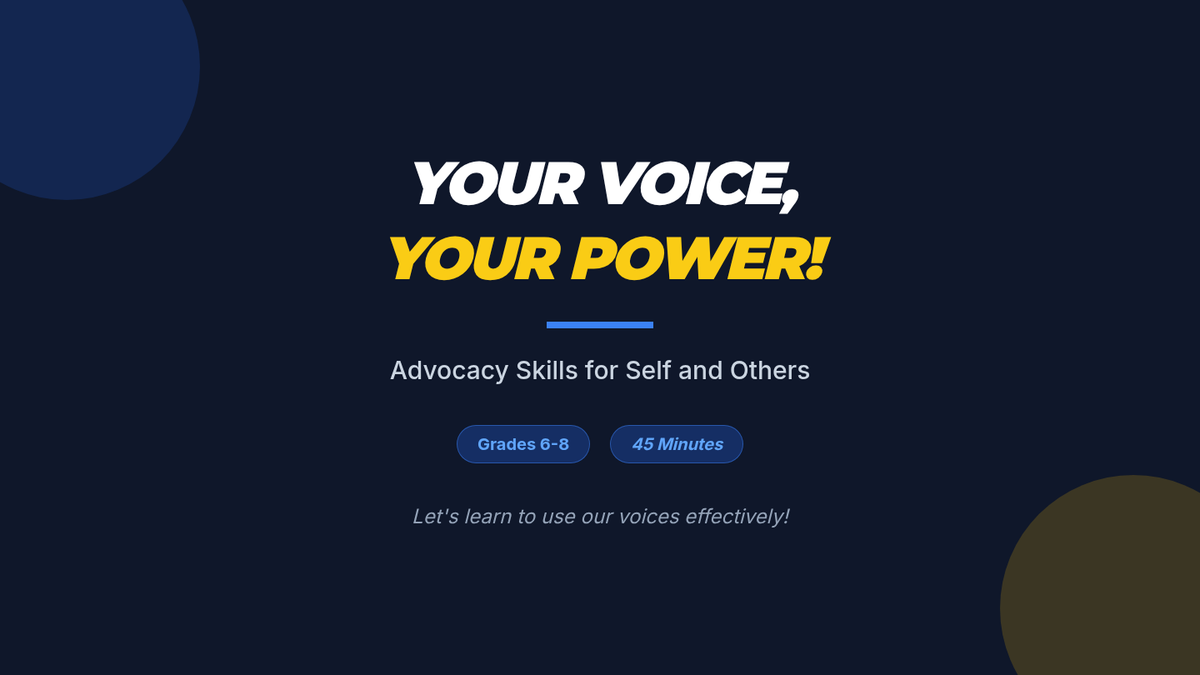 A 45-minute middle school lesson designed to empower students with advocacy skills. Students will learn the difference between passive, aggressive, and assertive communication and practice standing up for themselves and others through scenarios and an interactive bingo game.