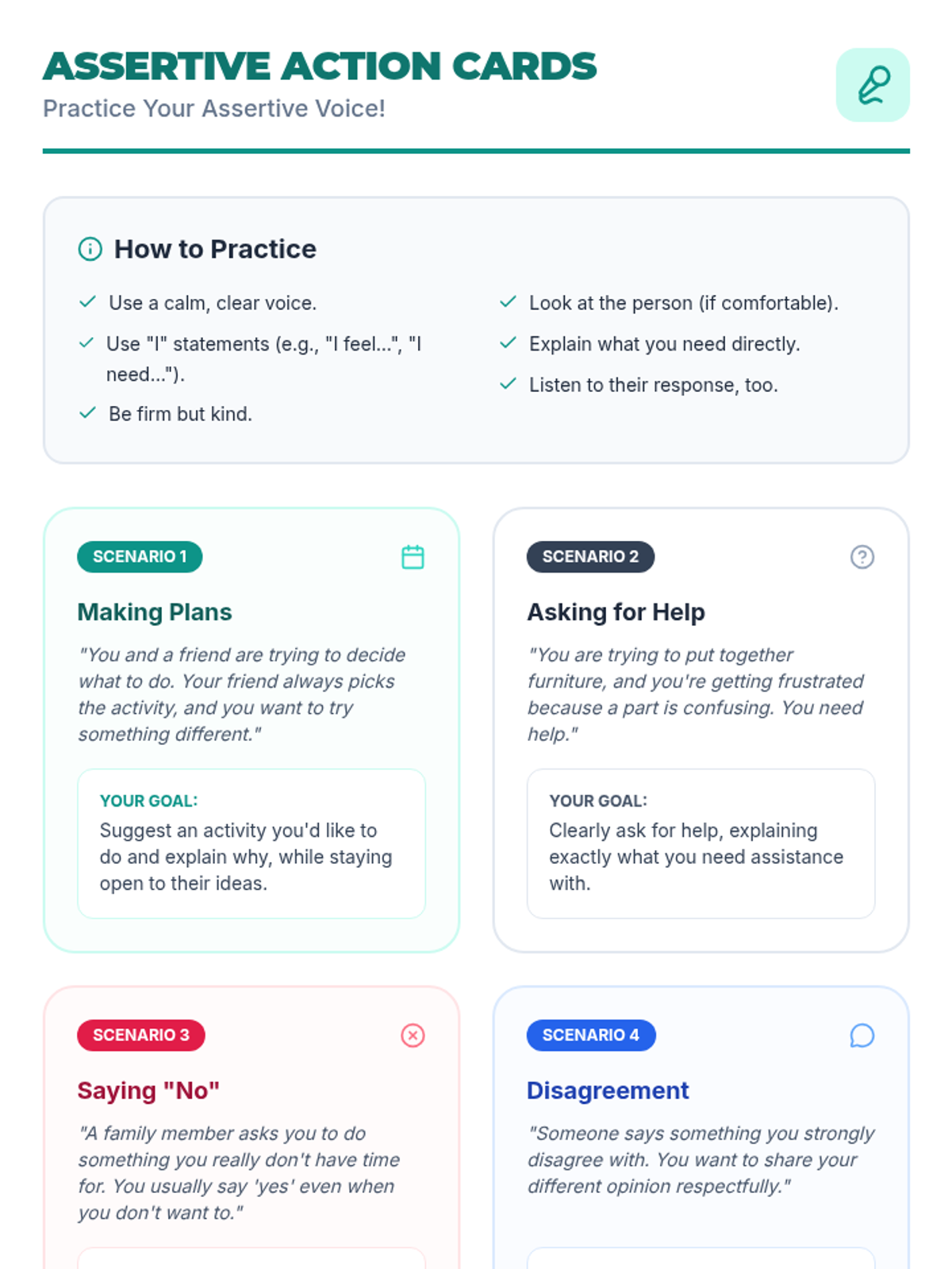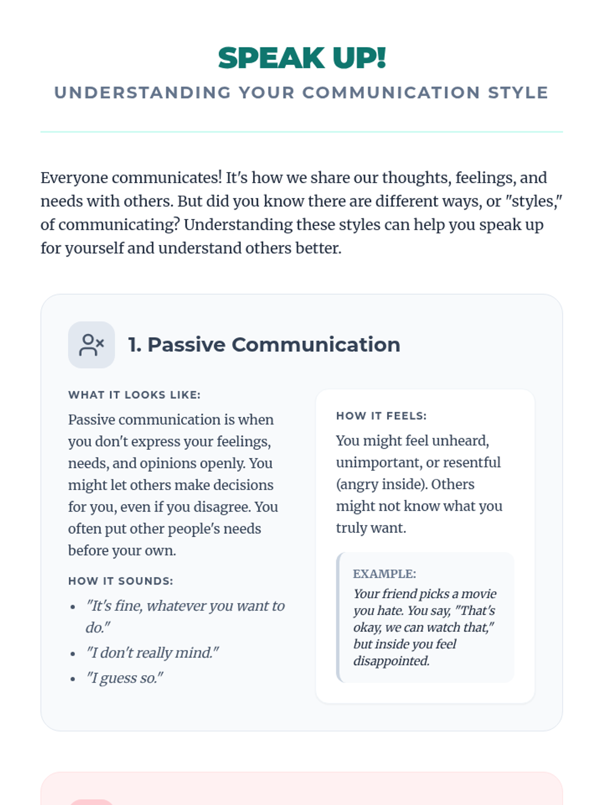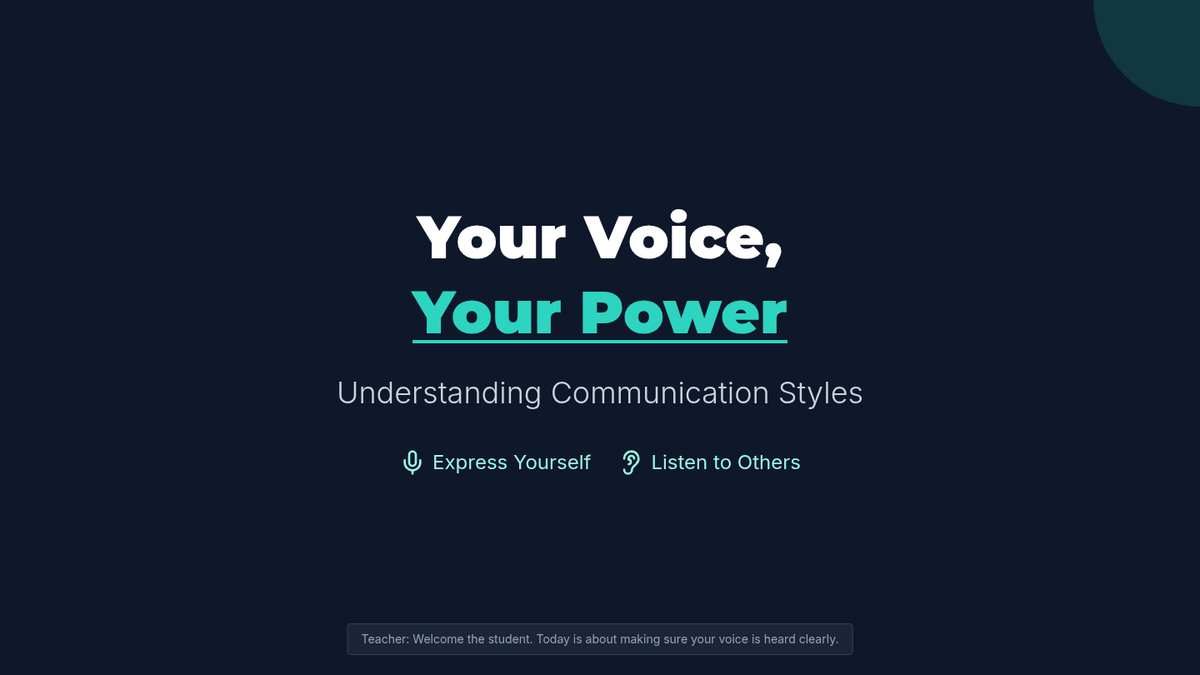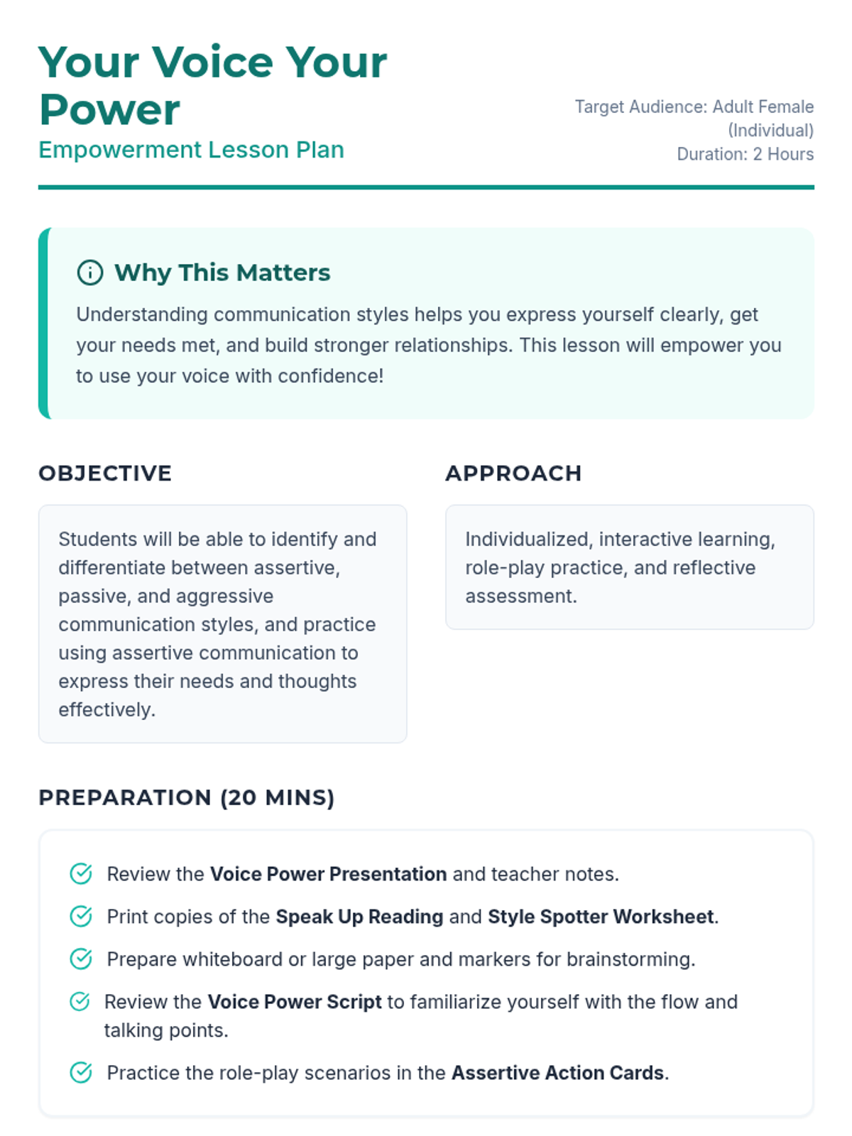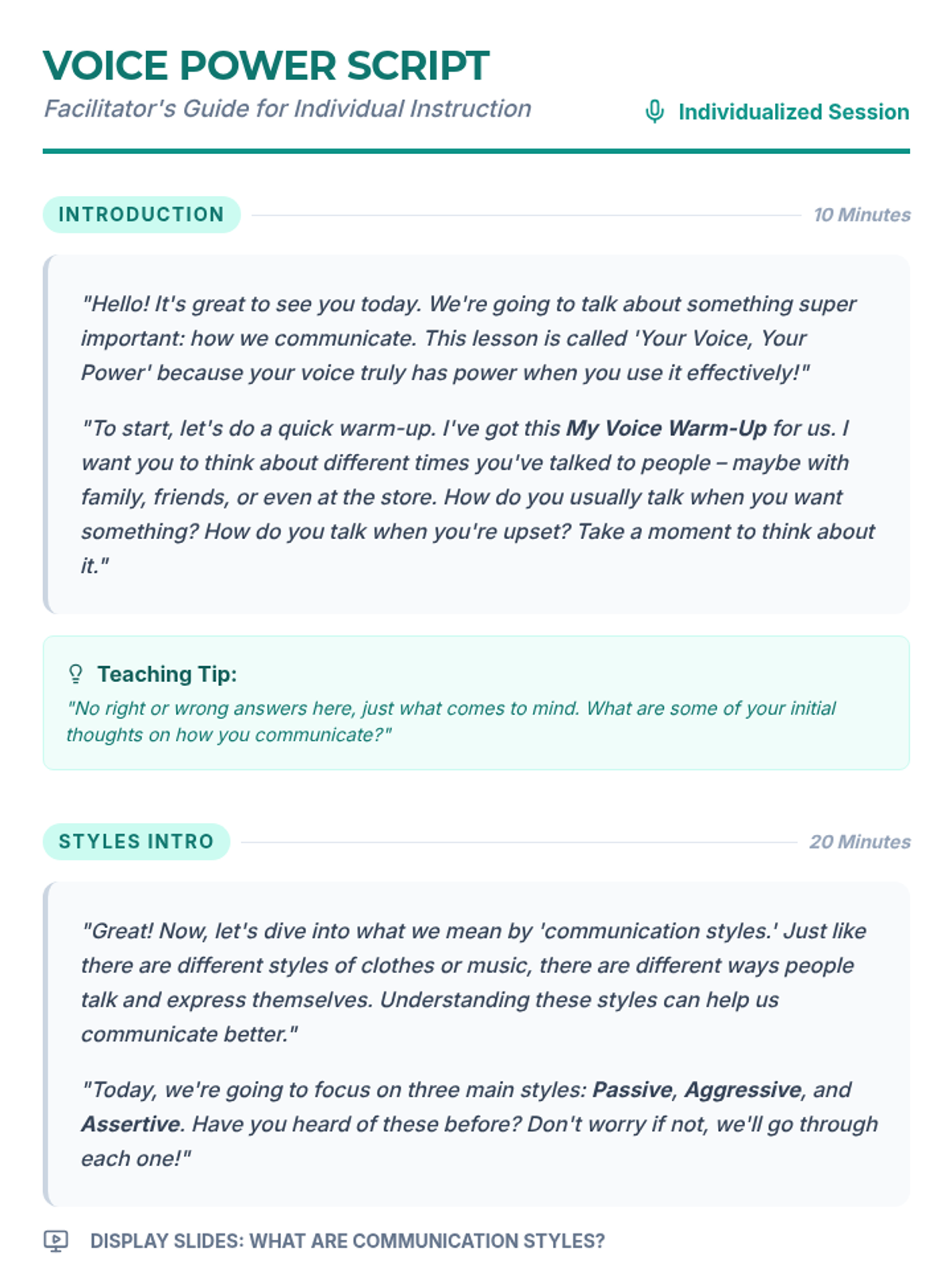 An empowering 2-hour individualized lesson designed for an adult female with disabilities to identify and practice communication styles. The lesson focuses on differentiating between passive, aggressive, and assertive communication to build confidence in expressing needs.