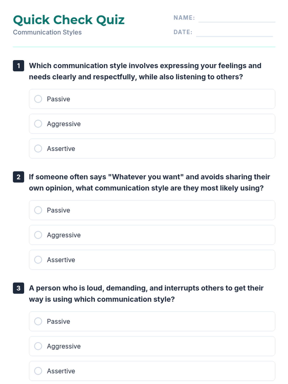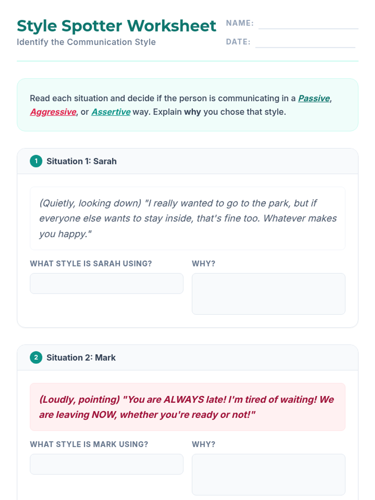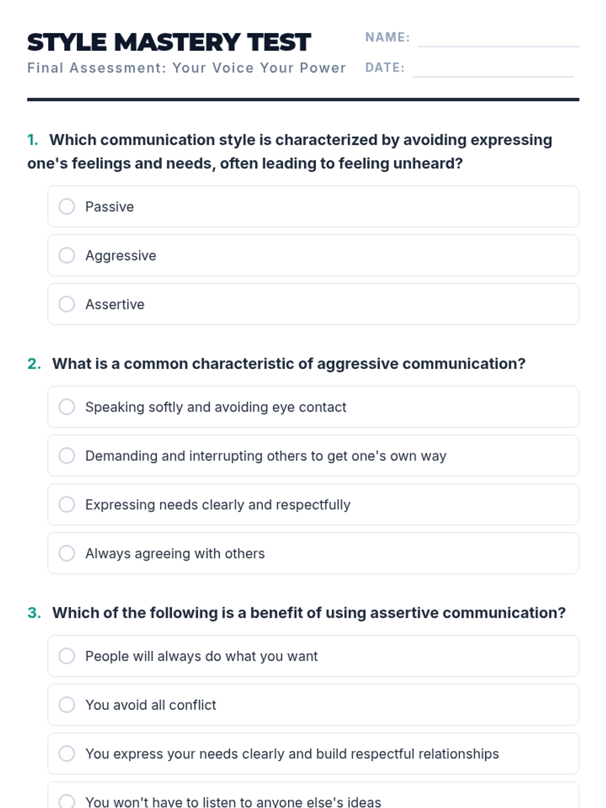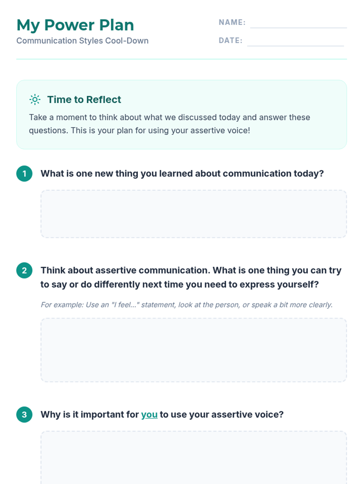An empowering 2-hour individualized lesson designed for an adult female with disabilities to identify and practice communication styles. The lesson focuses on differentiating between passive, aggressive, and assertive communication to build confidence in expressing needs.