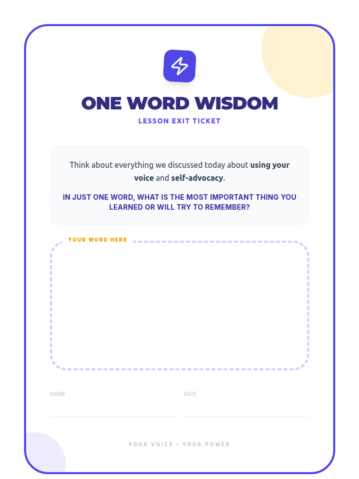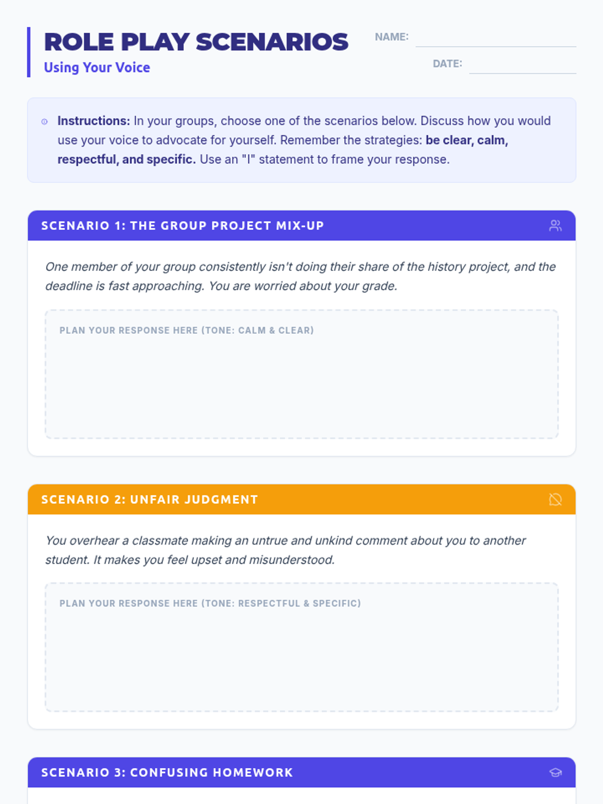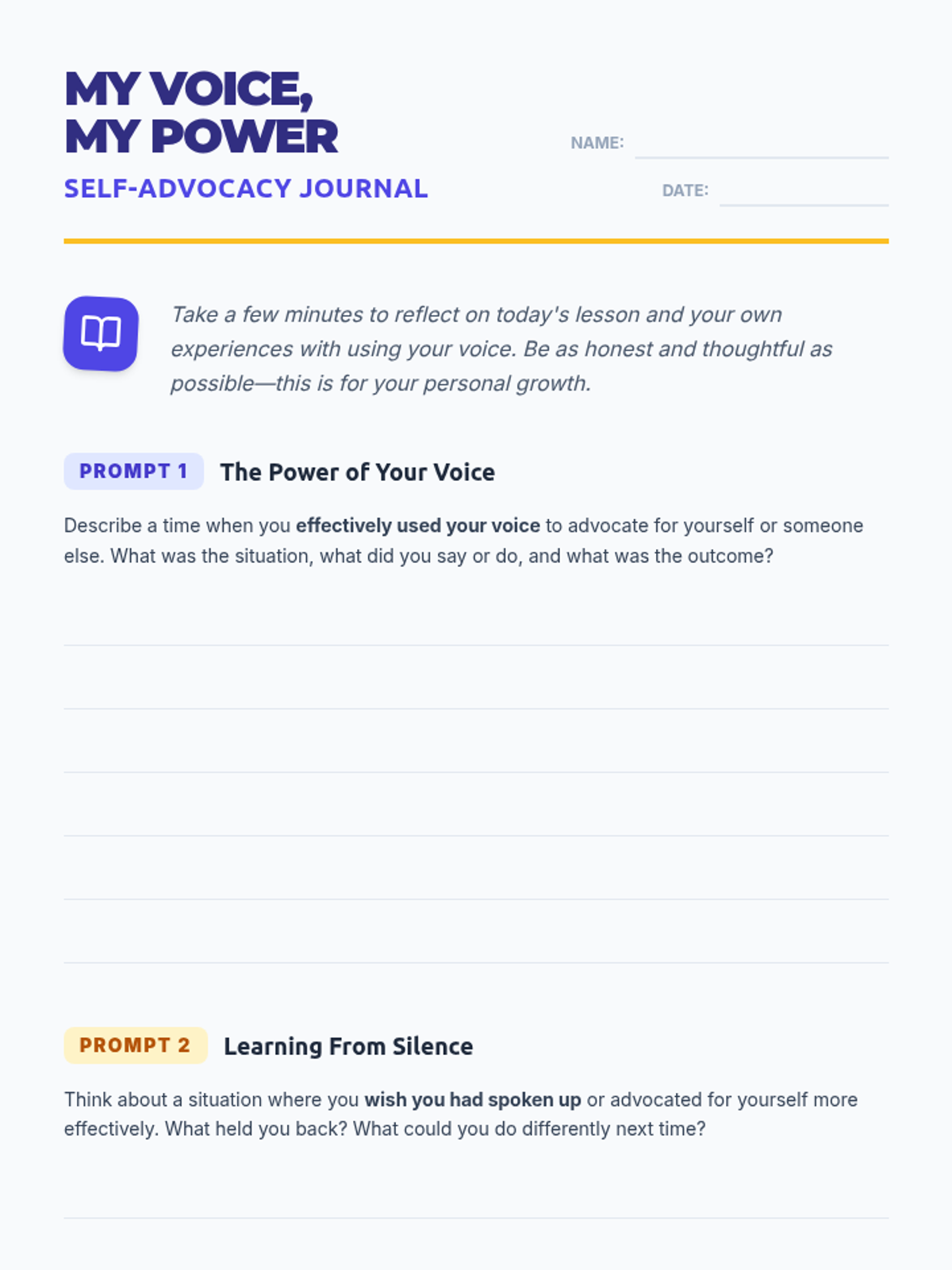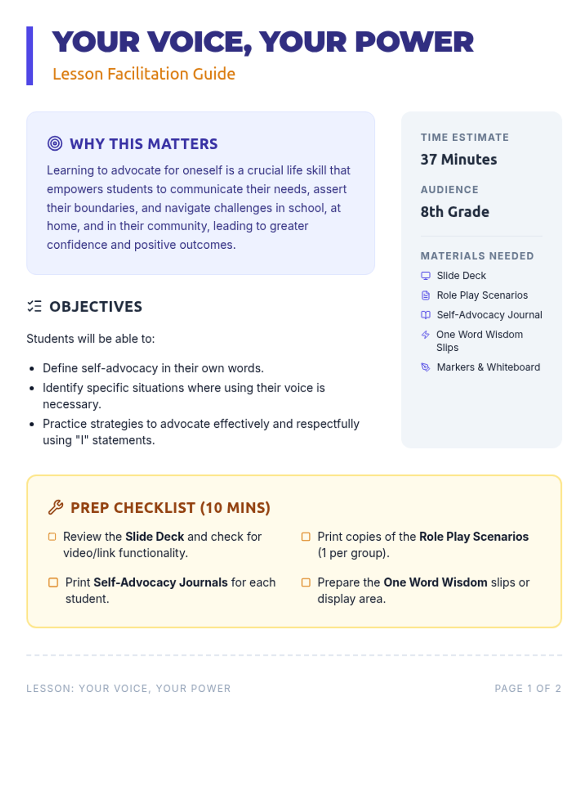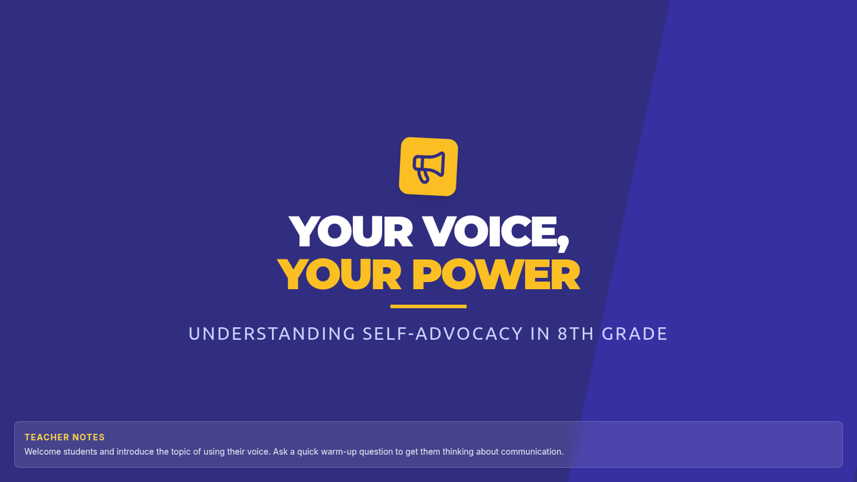 This lesson empowers 8th-grade students to understand the importance of self-advocacy and provides practical strategies for effectively using their voice in various situations. Students will learn how to confidently express their needs and opinions, fostering greater independence and communication skills.