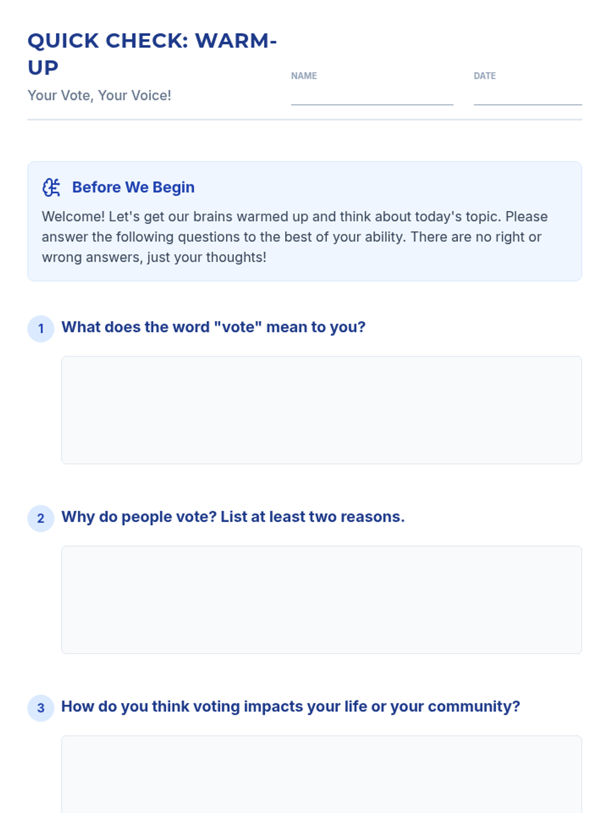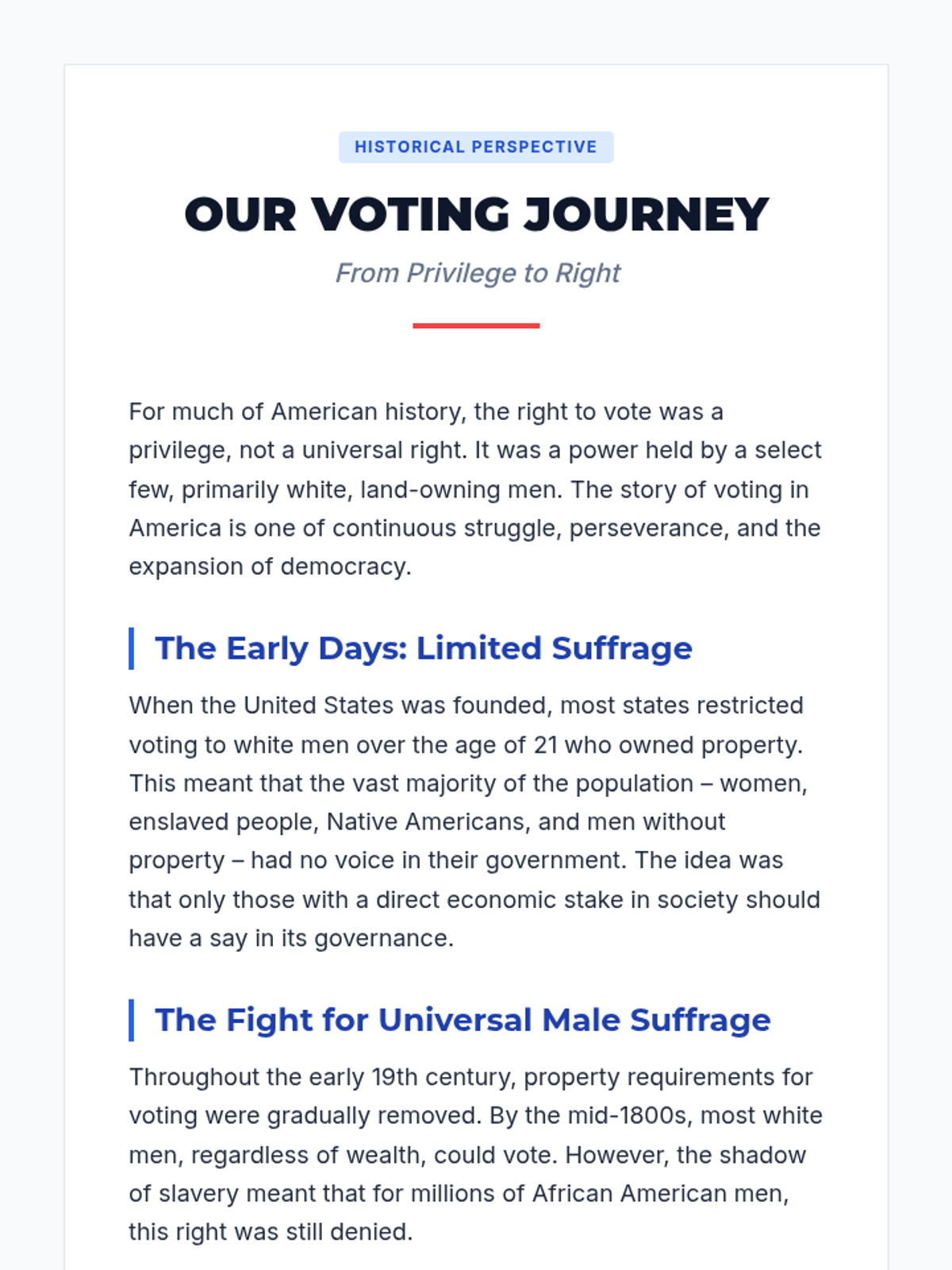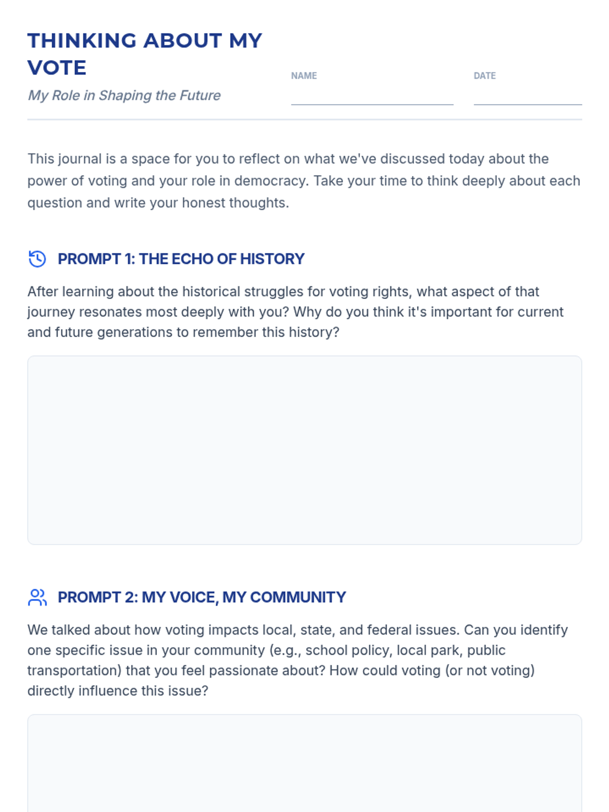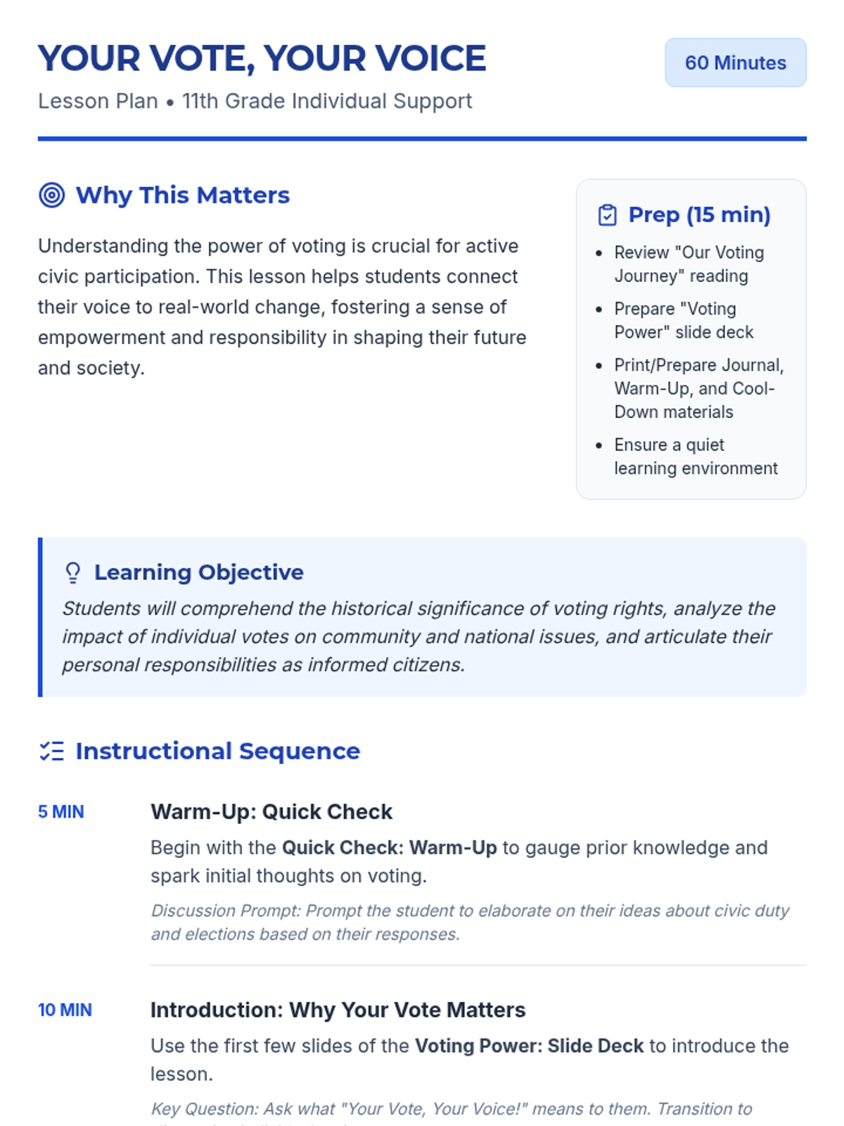 This lesson empowers 11th-grade students to understand the impact of voting on their lives and communities, covering historical struggles for voting rights and the responsibilities of informed citizenship.