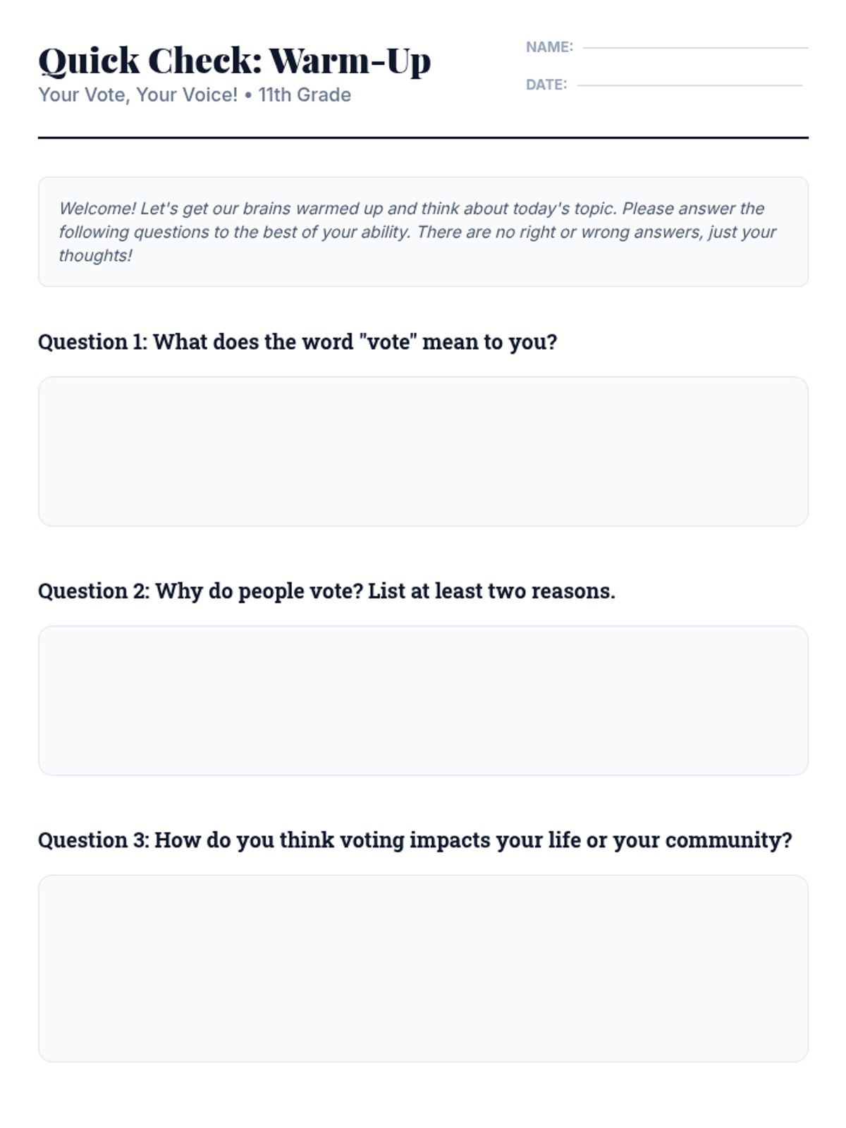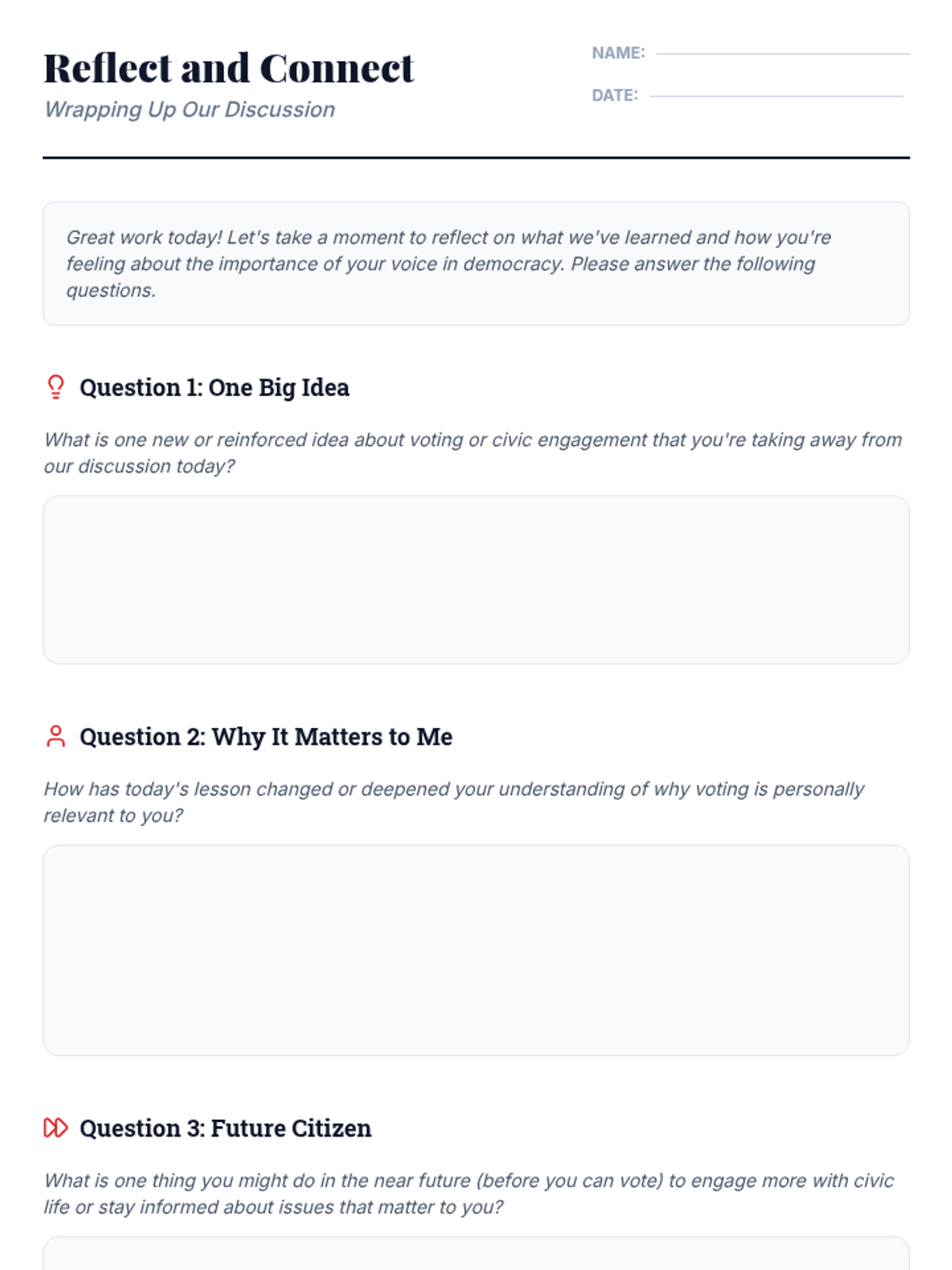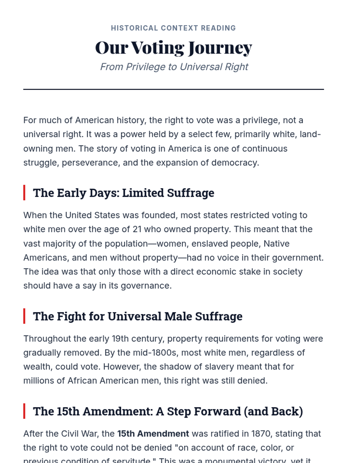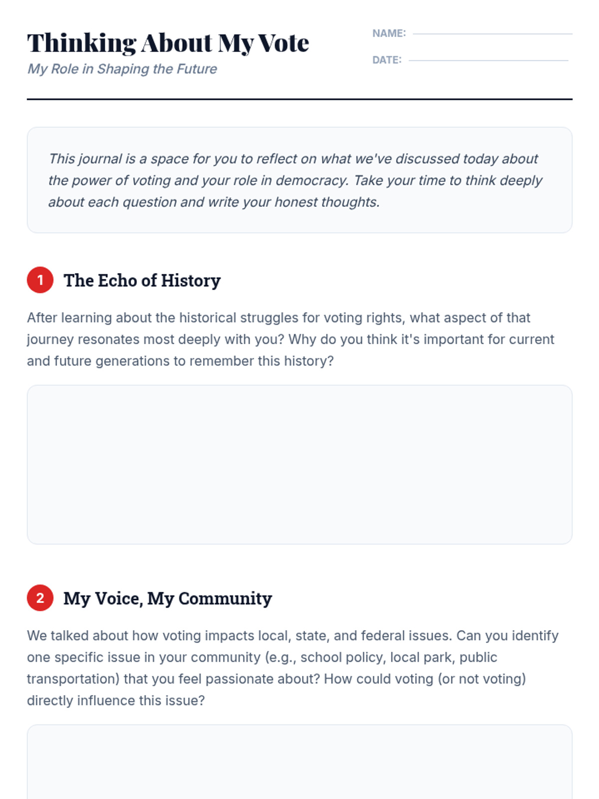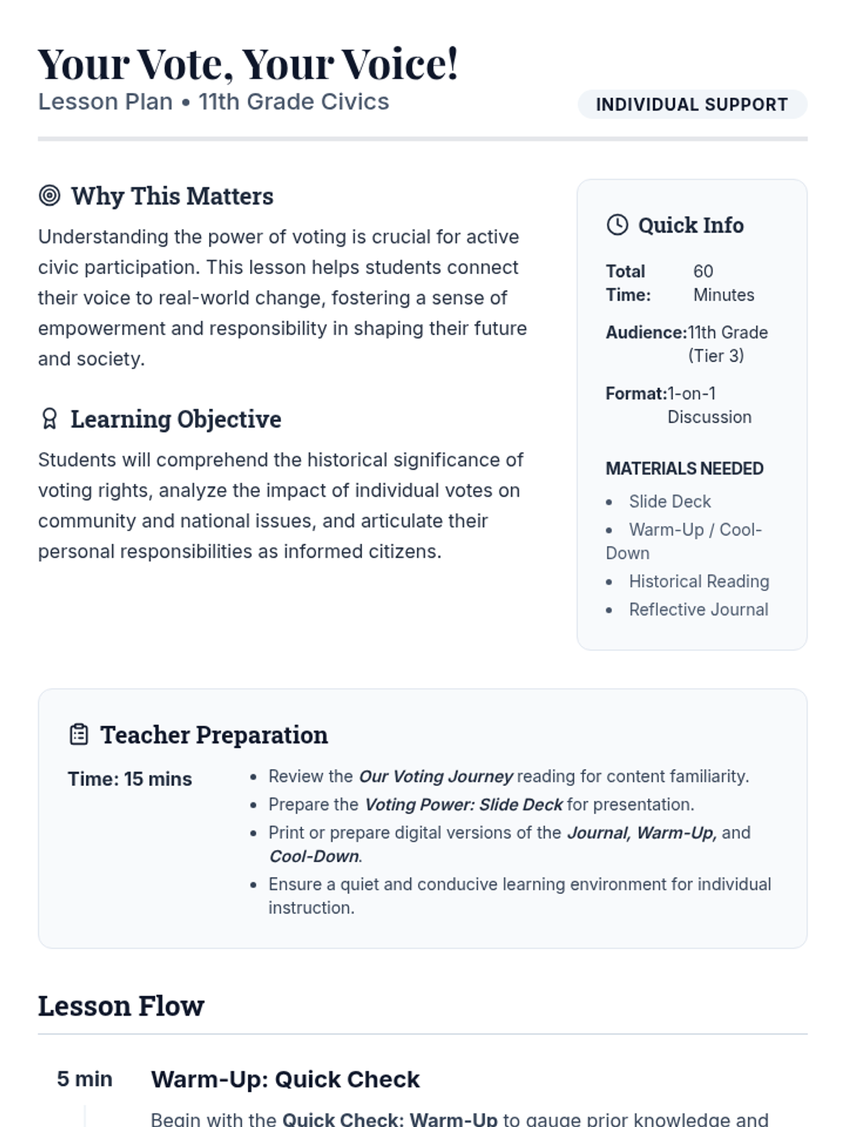 This 60-minute individual support lesson empowers 11th-grade students to understand the impact of voting. It covers historical struggles for suffrage, the responsibilities of citizenship, and how individual participation shapes democracy through personal reflection and discussion.