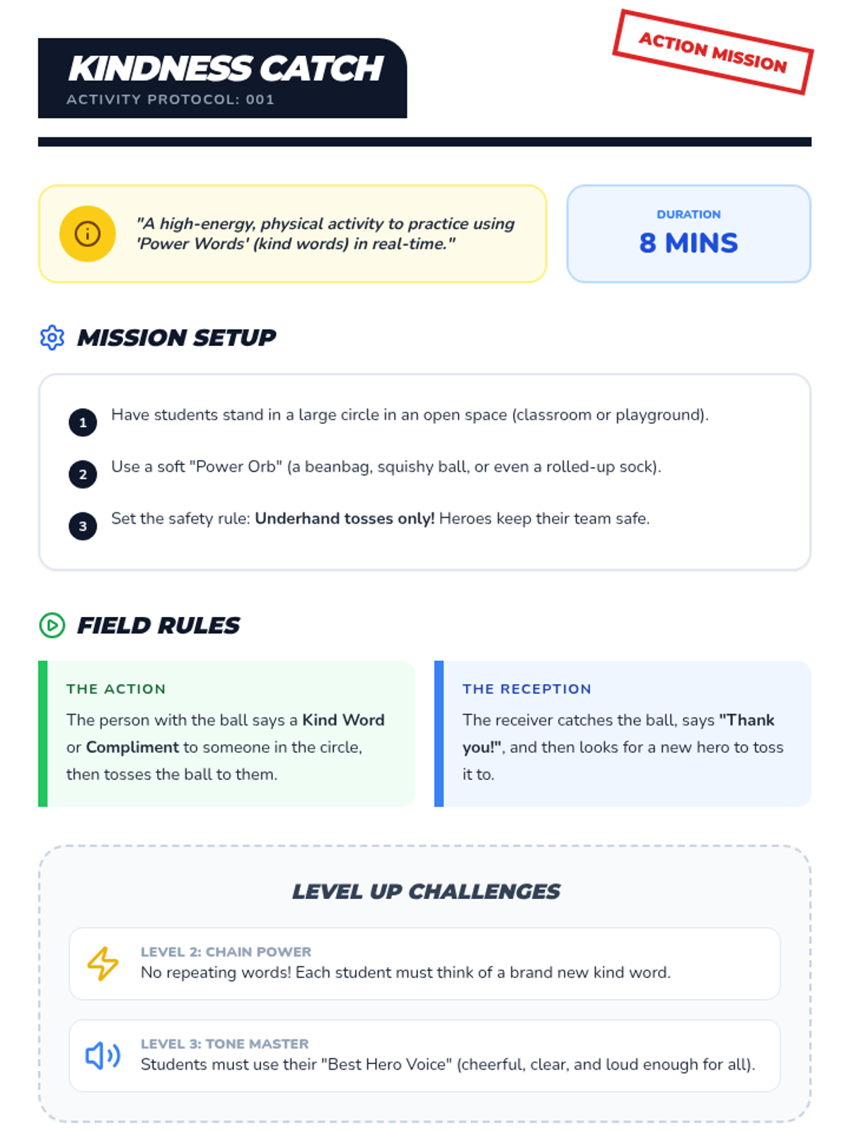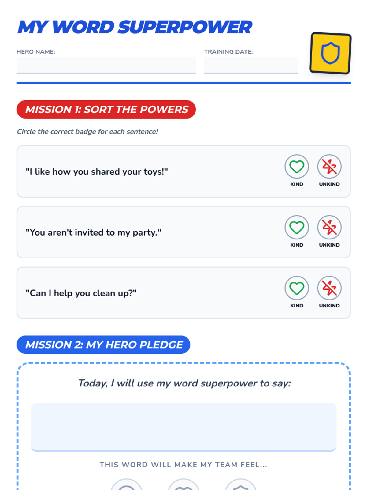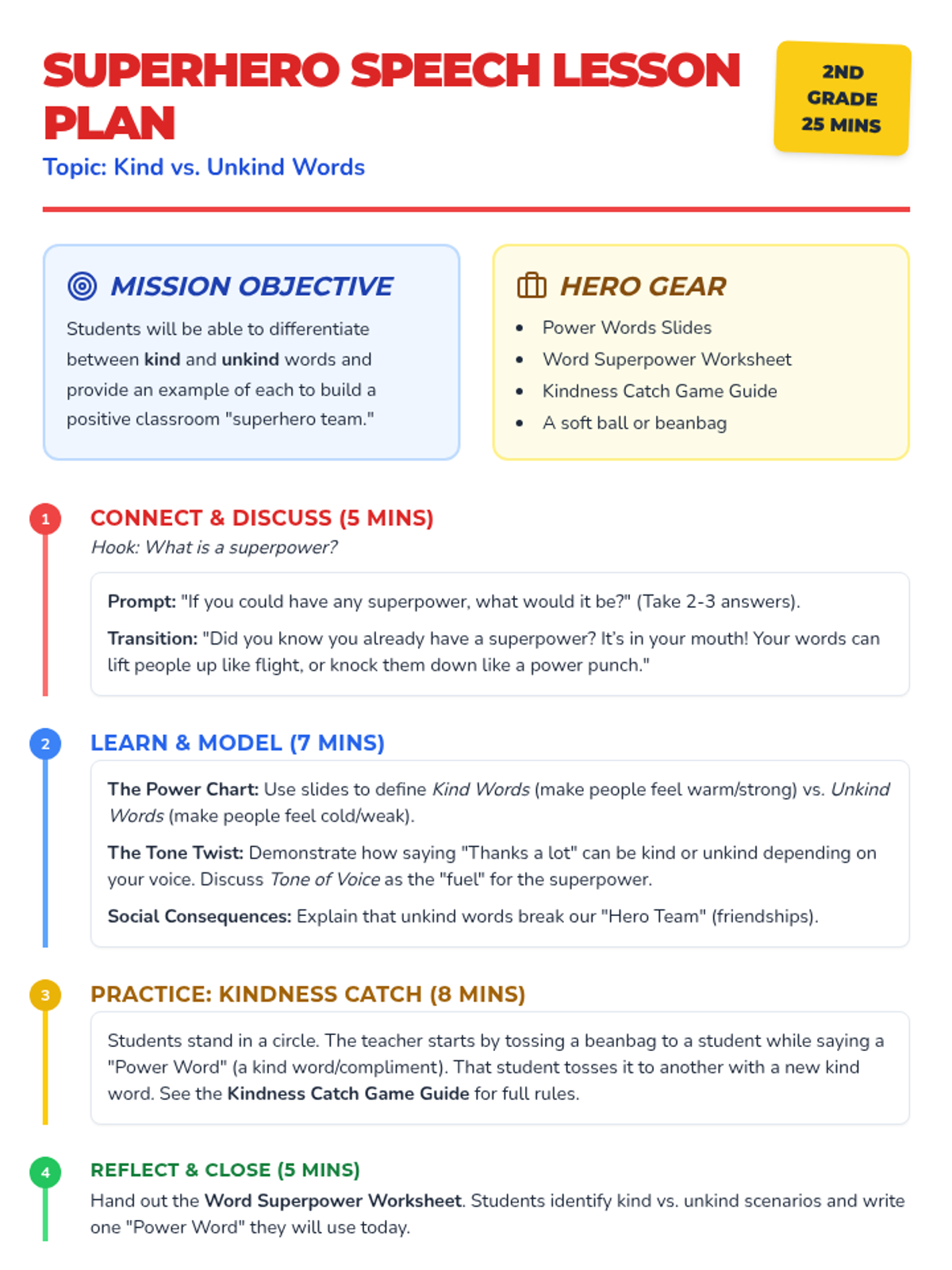 A 25-minute lesson for 2nd graders to discover the impact of their words, using a superhero theme to teach the difference between kind and hurtful language and the power of tone.