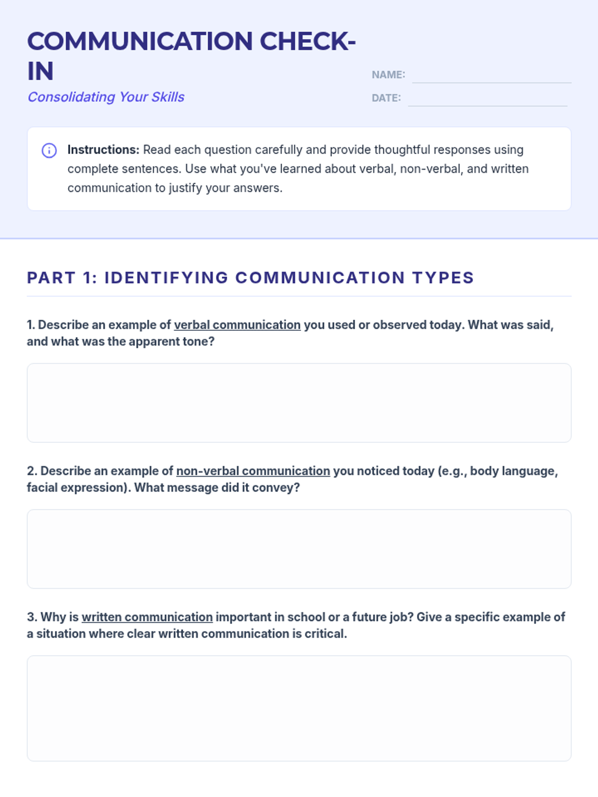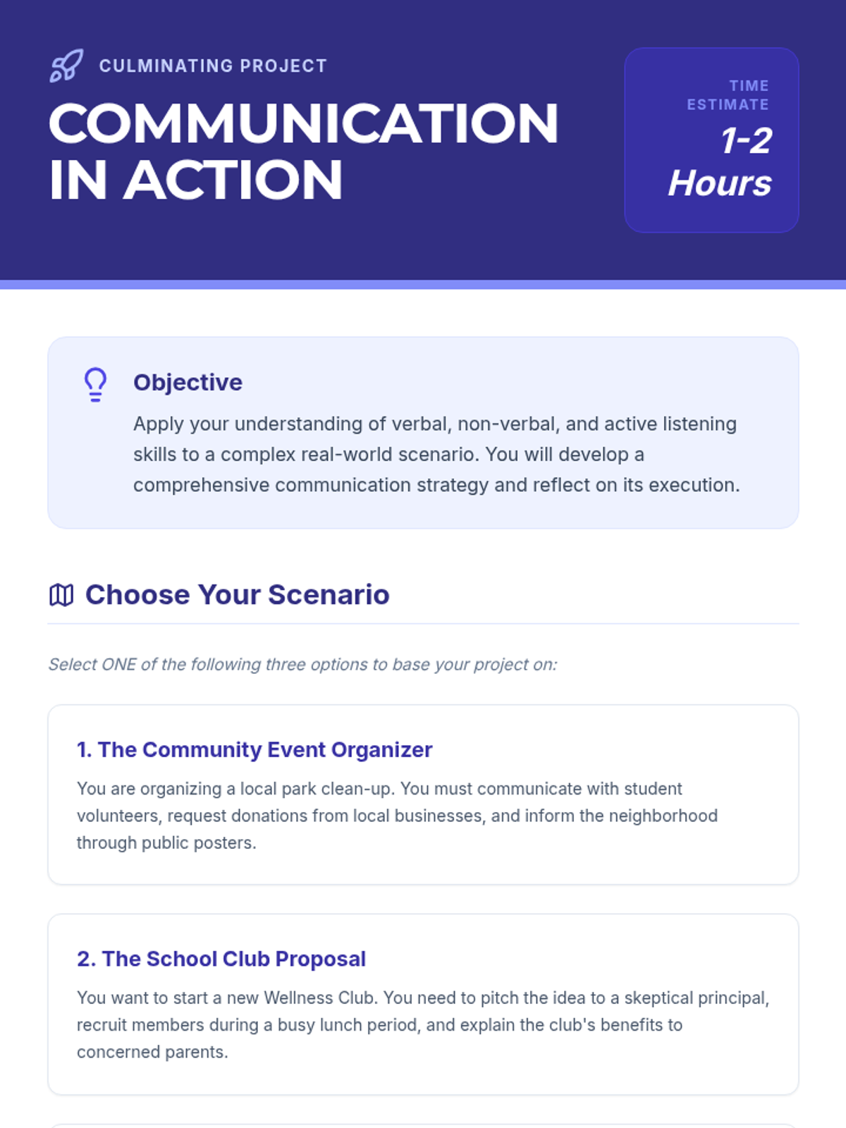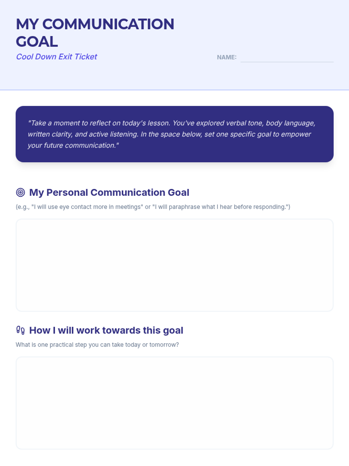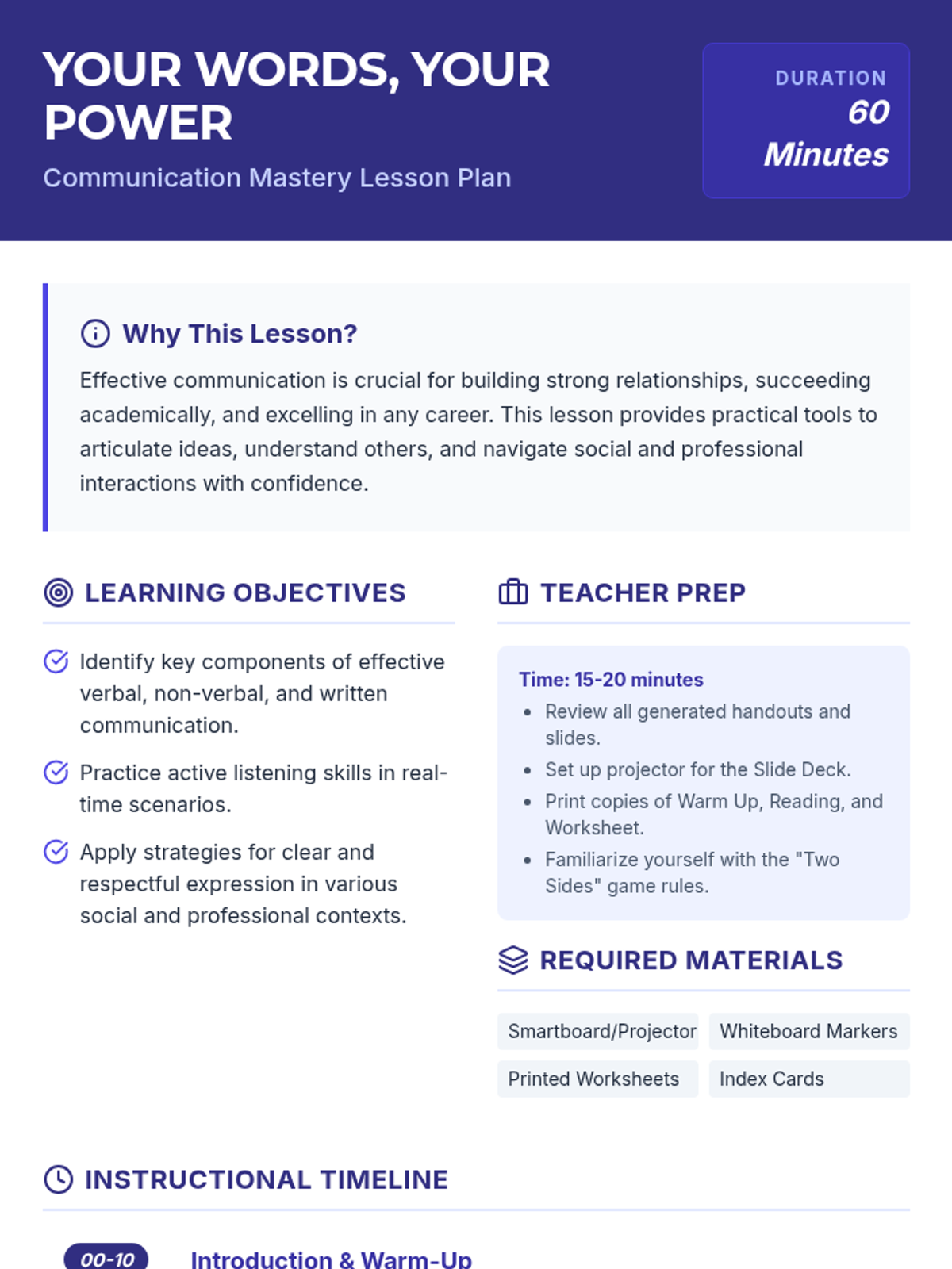 A 60-minute lesson empowering students with verbal, non-verbal, and written communication skills essential for academic and professional success.