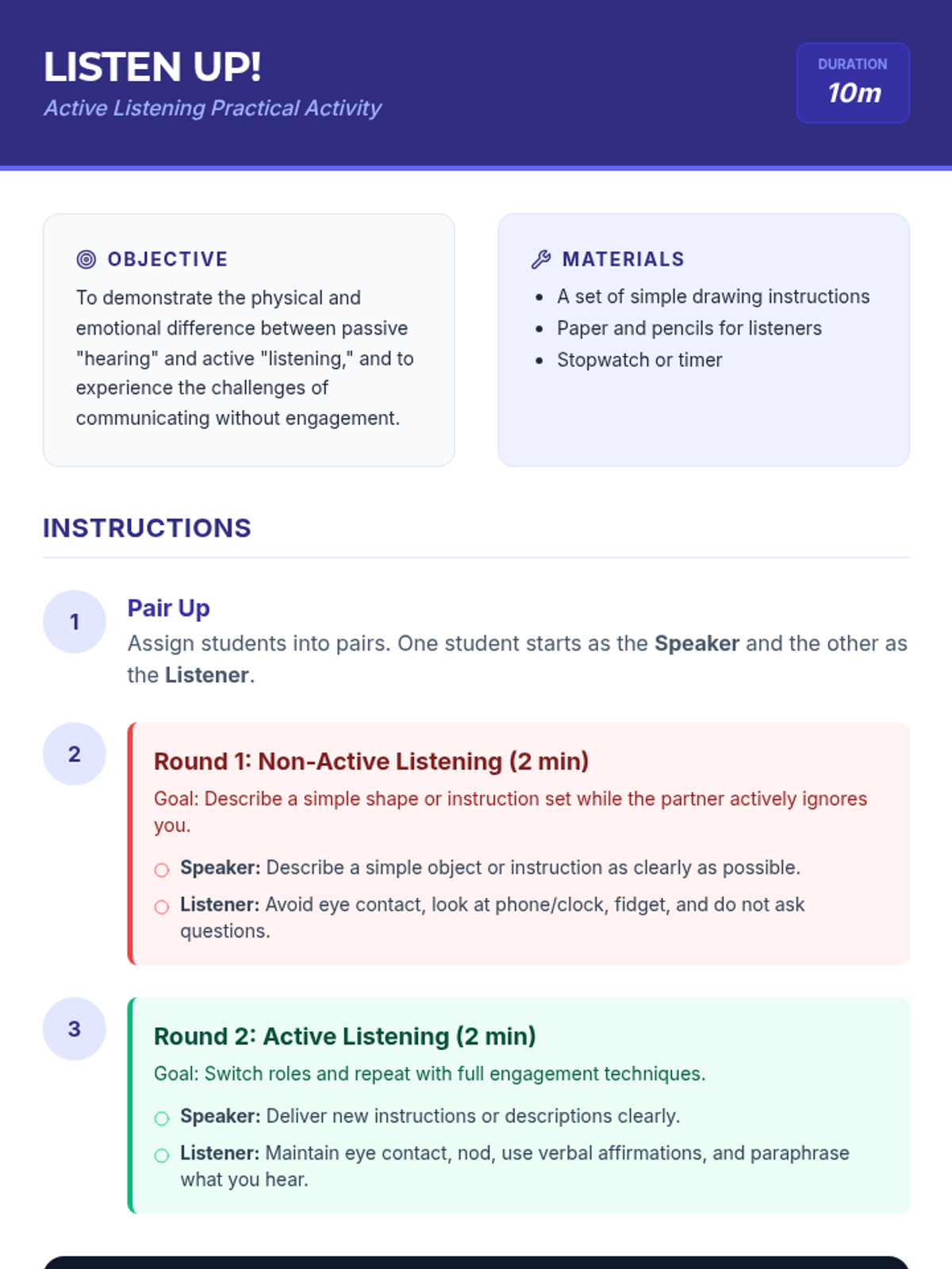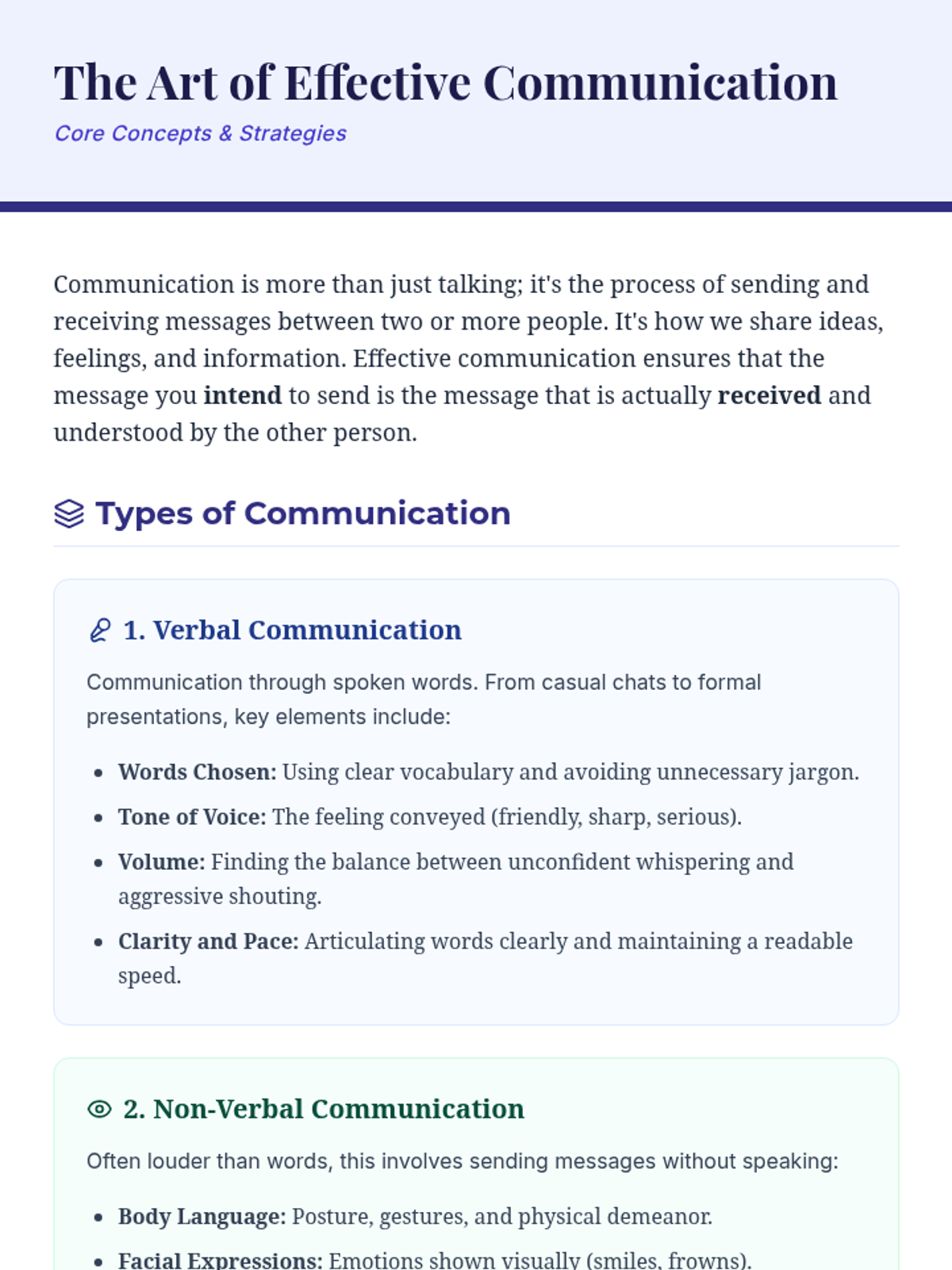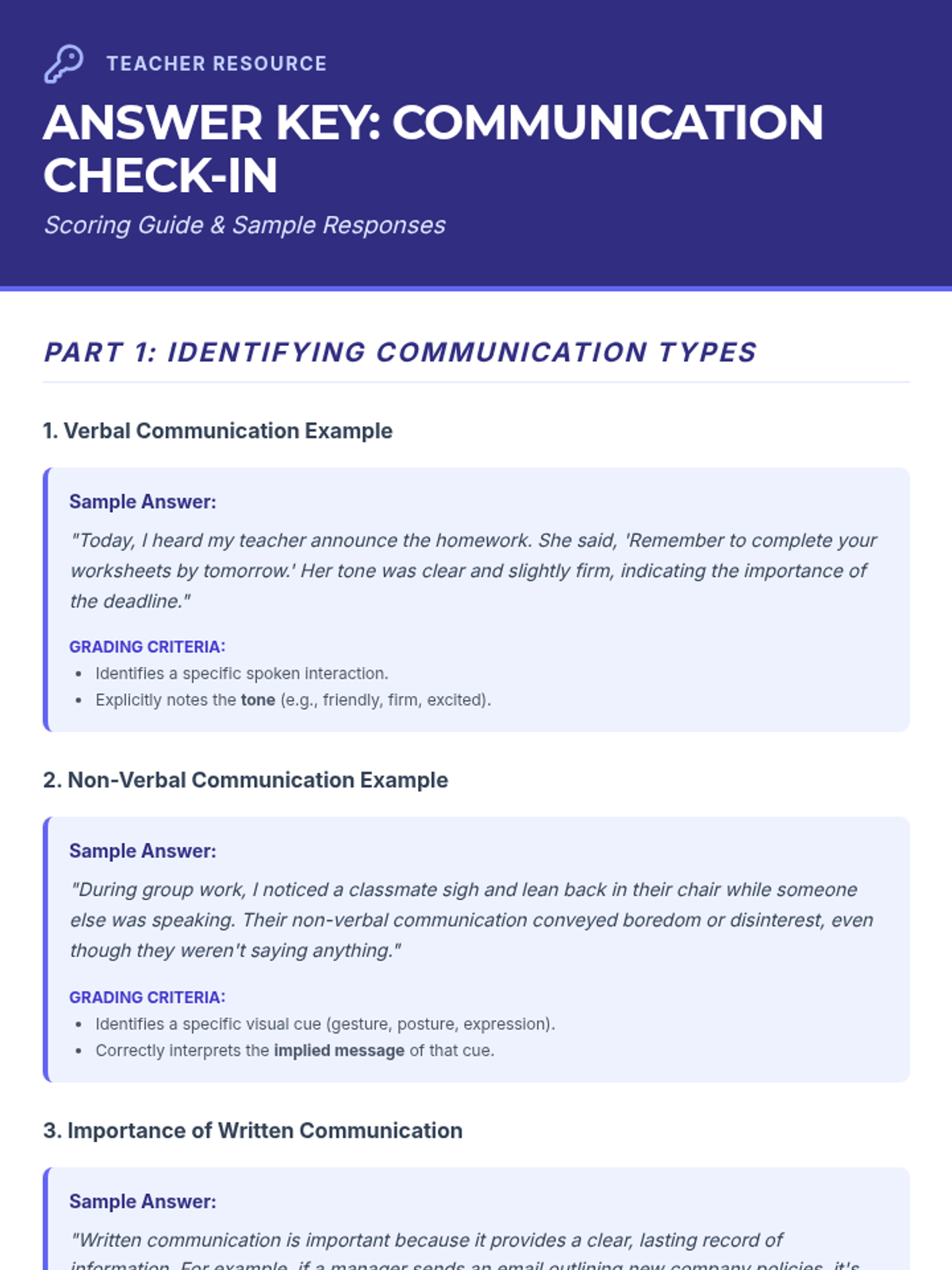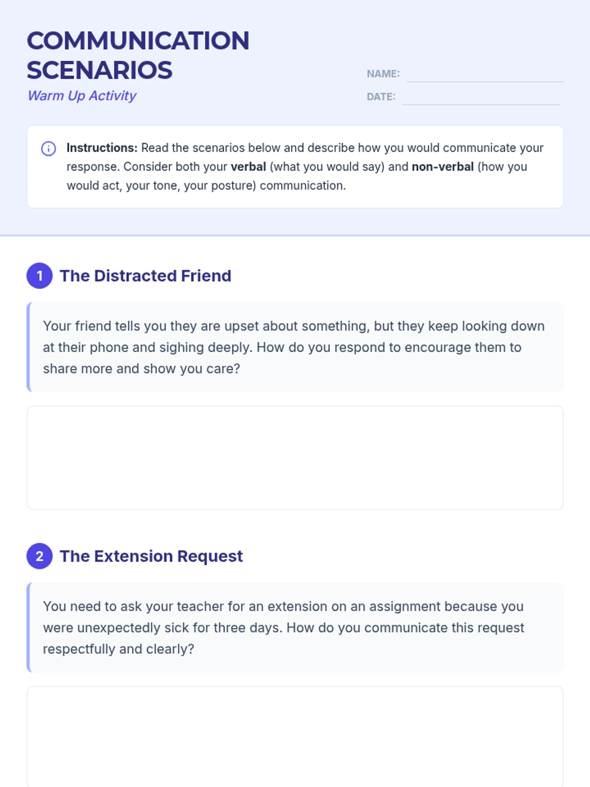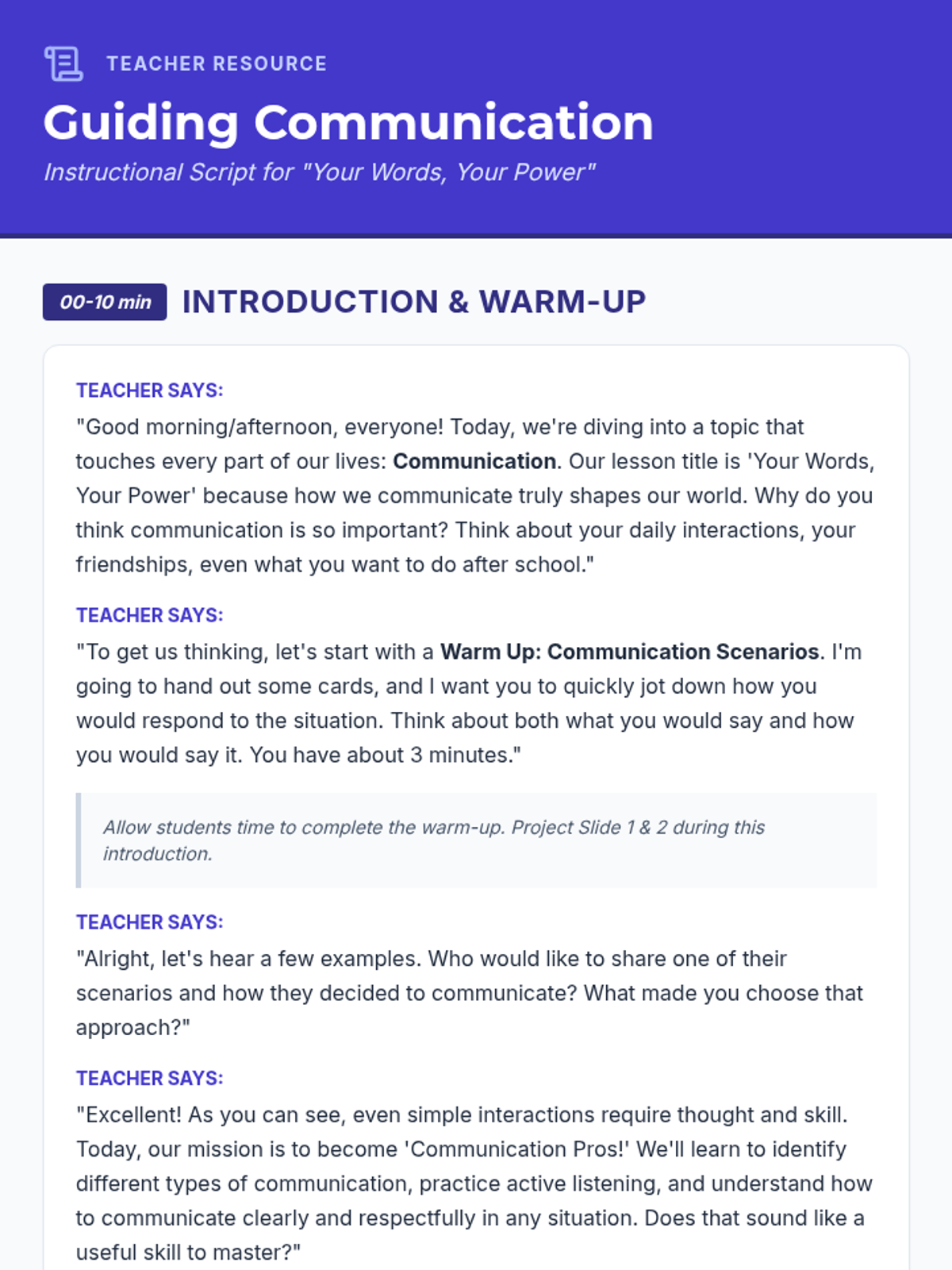 A 60-minute lesson empowering students with verbal, non-verbal, and written communication skills essential for academic and professional success.