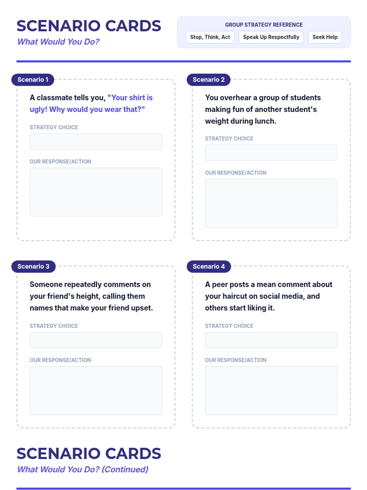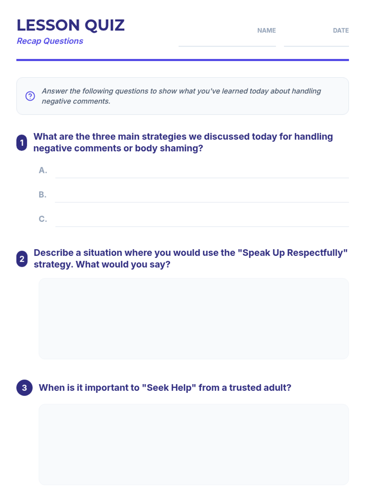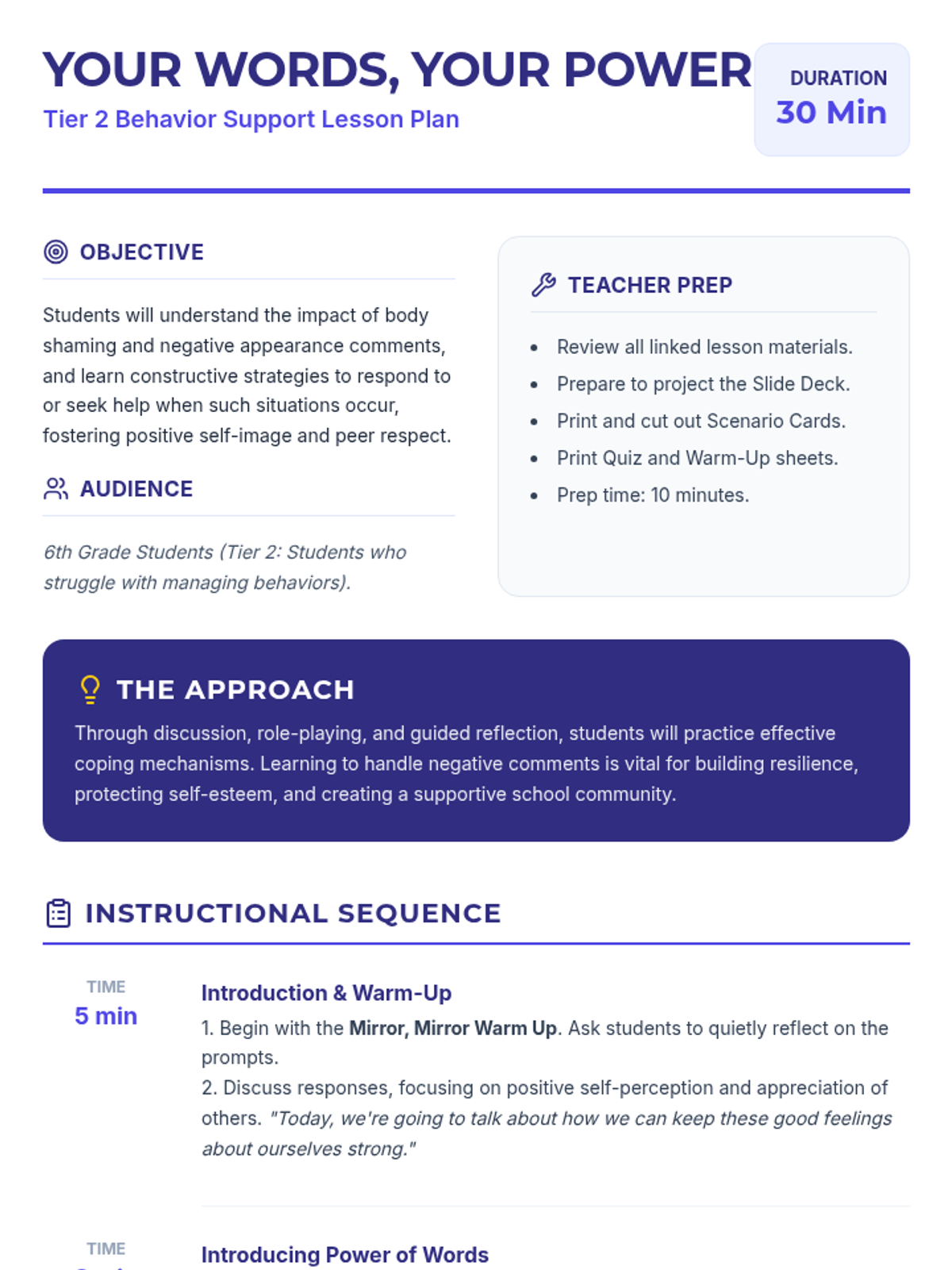 A 30-minute Tier 2 lesson for 6th graders focused on managing reactions to body shaming and negative comments. Students learn three key strategies—Stop, Think, Act; Speak Up Respectfully; and Seek Help—to build resilience and foster a respectful school environment.