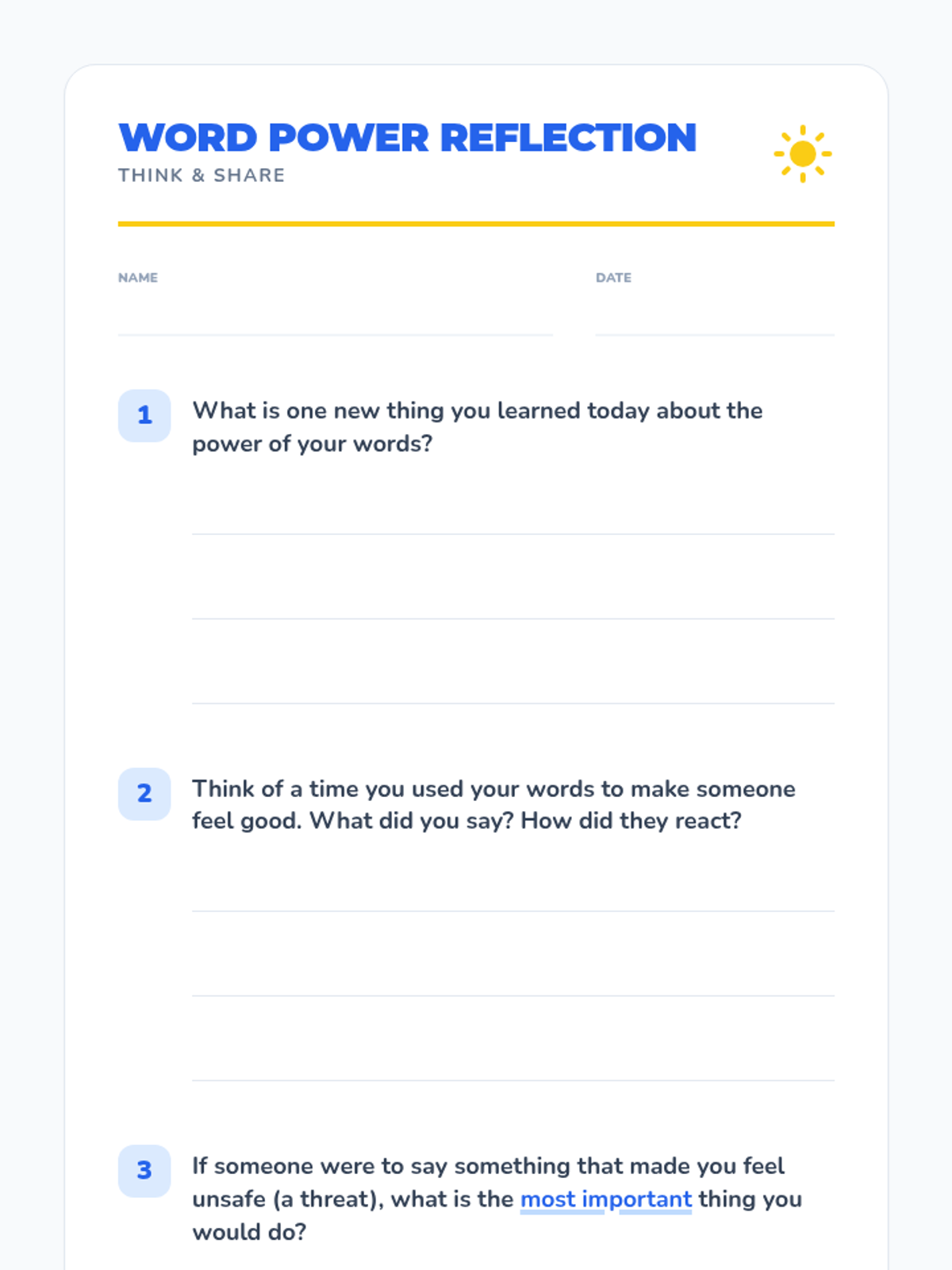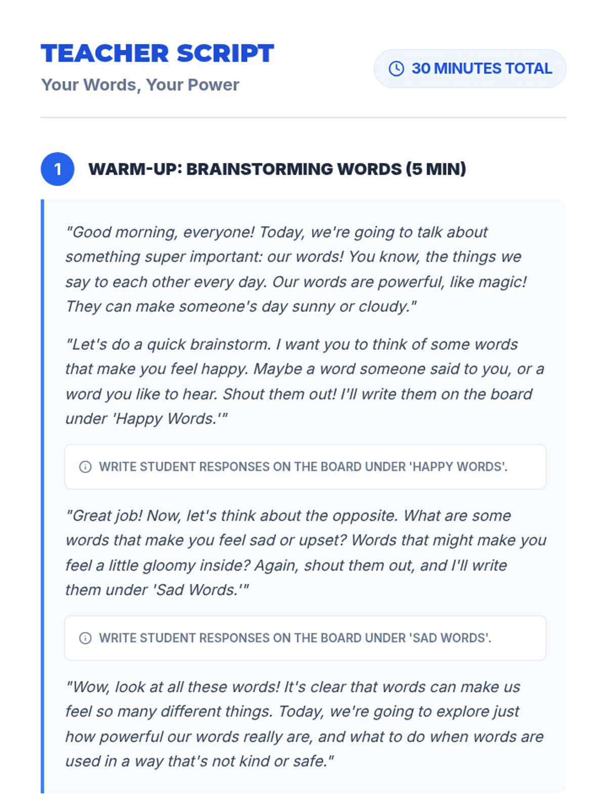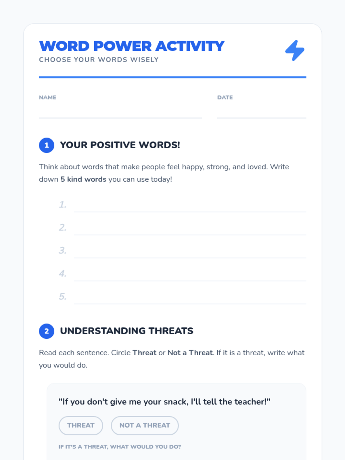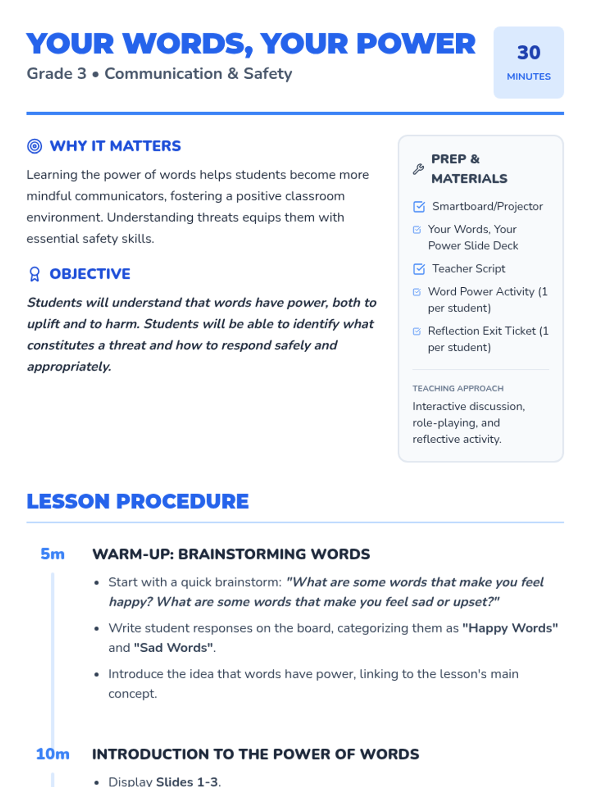 A 30-minute 3rd-grade lesson on the power of words, distinguishing between positive/negative speech and identifying/responding to threats.