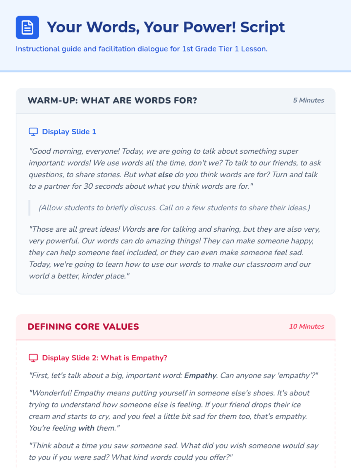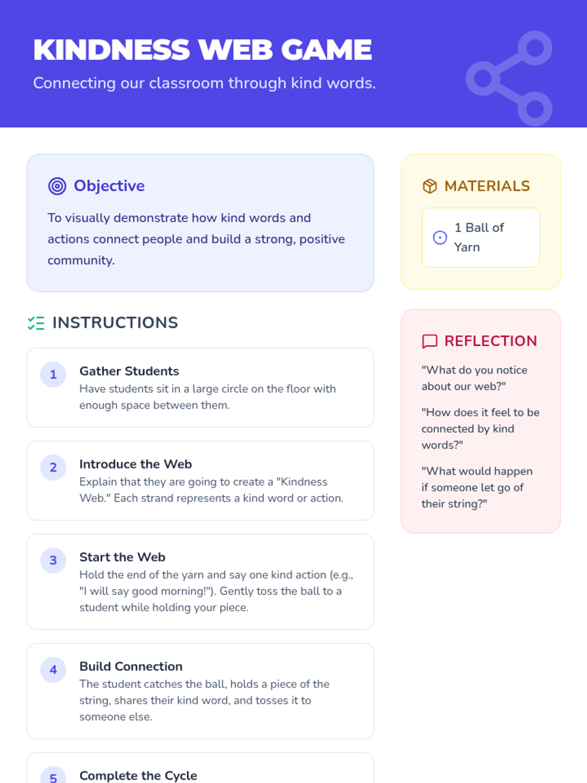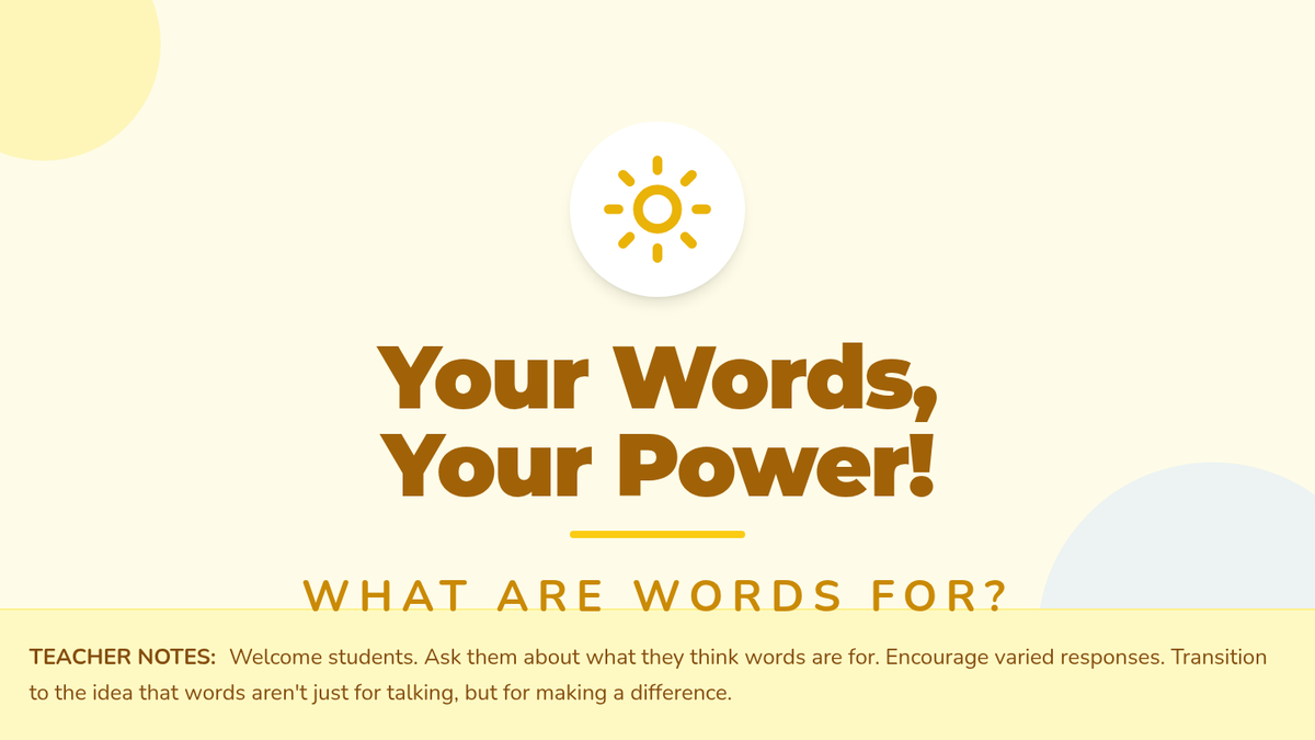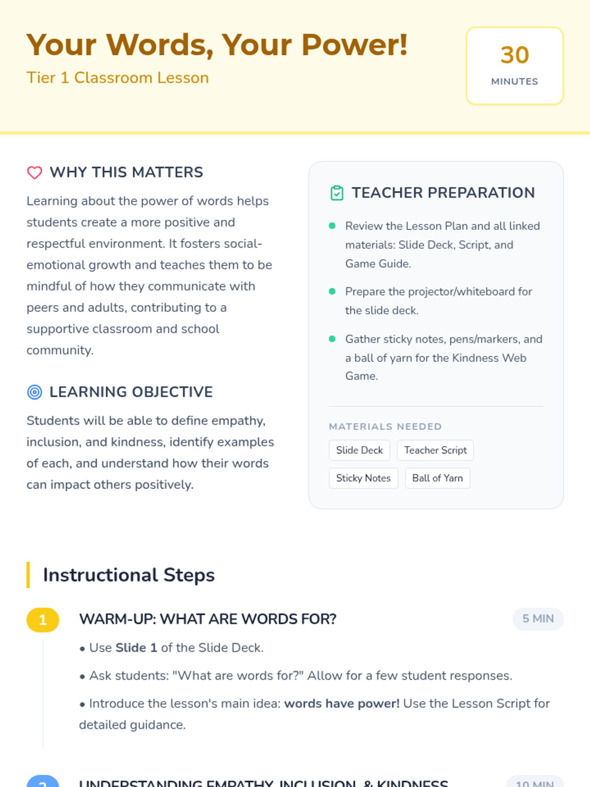 A 30-minute Tier 1 classroom lesson for 1st graders focused on empathy, inclusion, and kindness. Students explore how their words impact others through discussion, a slide presentation, and a collaborative yarn-web activity.
