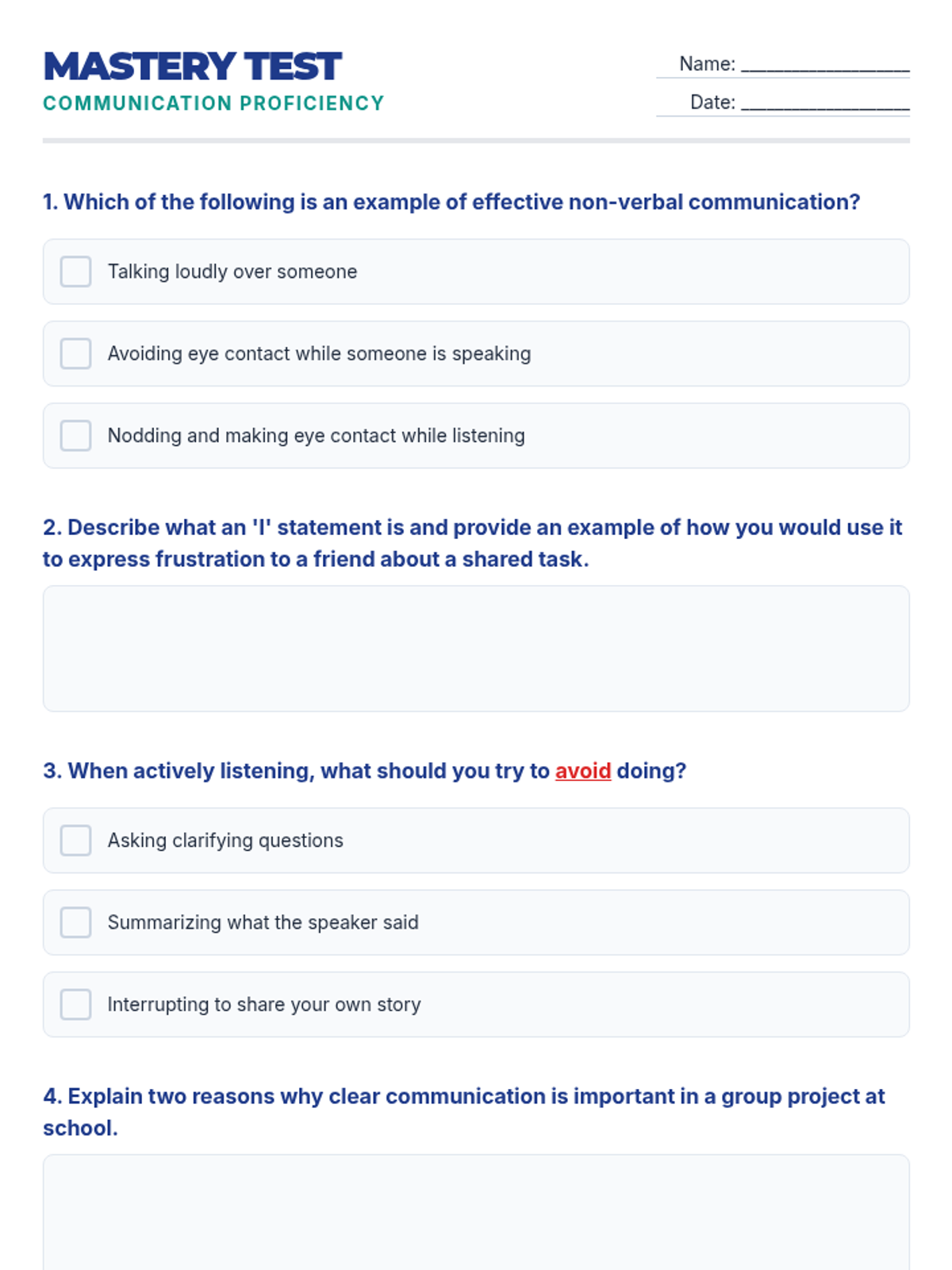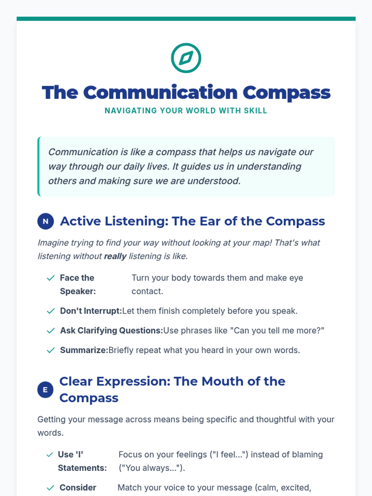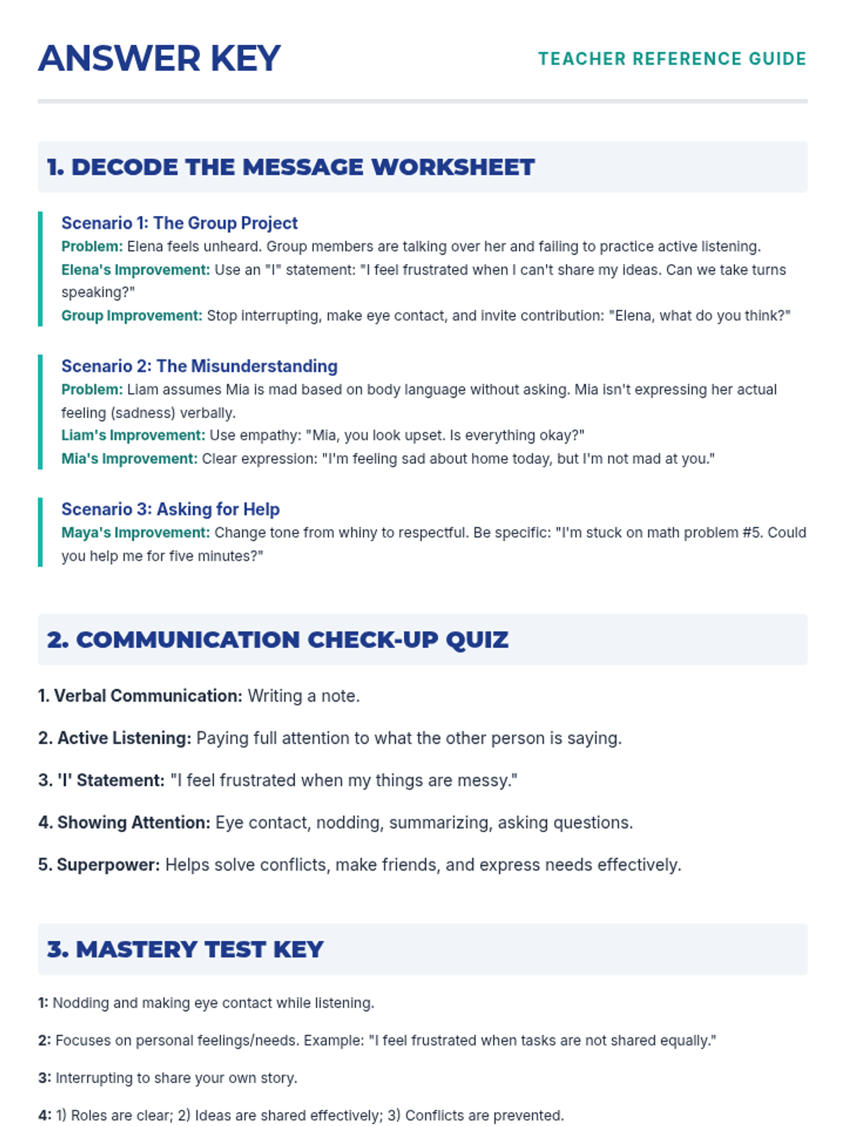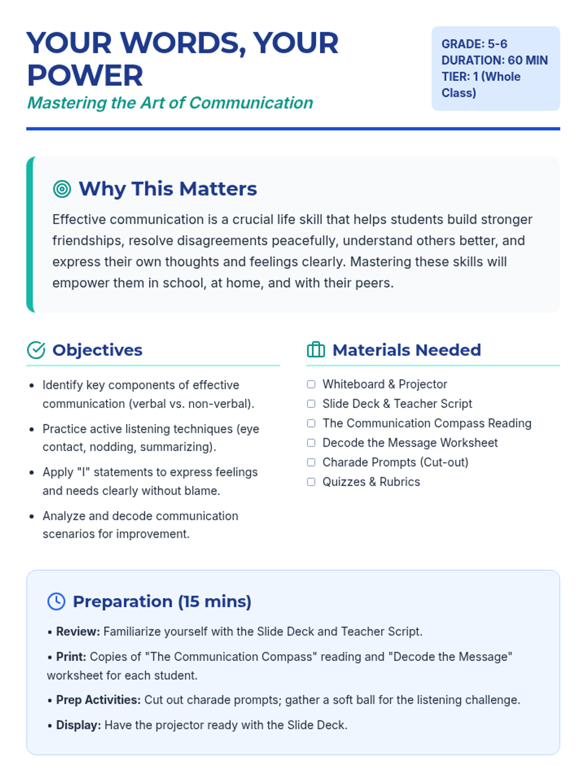 A 1-hour Tier 1 lesson for 5th and 6th graders to develop essential communication skills, including active listening, clear expression using 'I' statements, and understanding non-verbal cues.