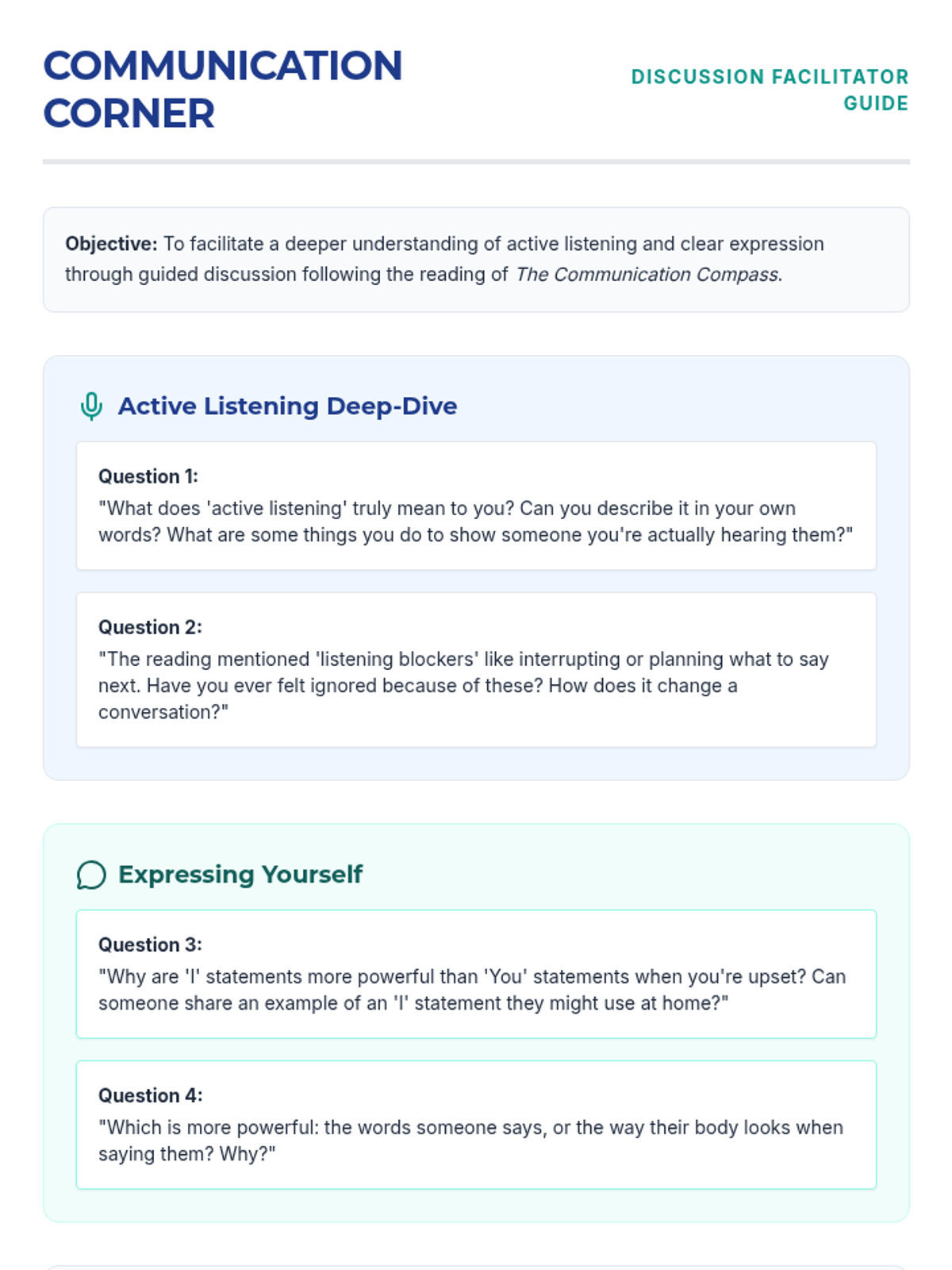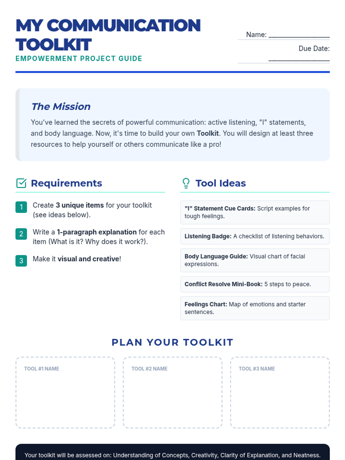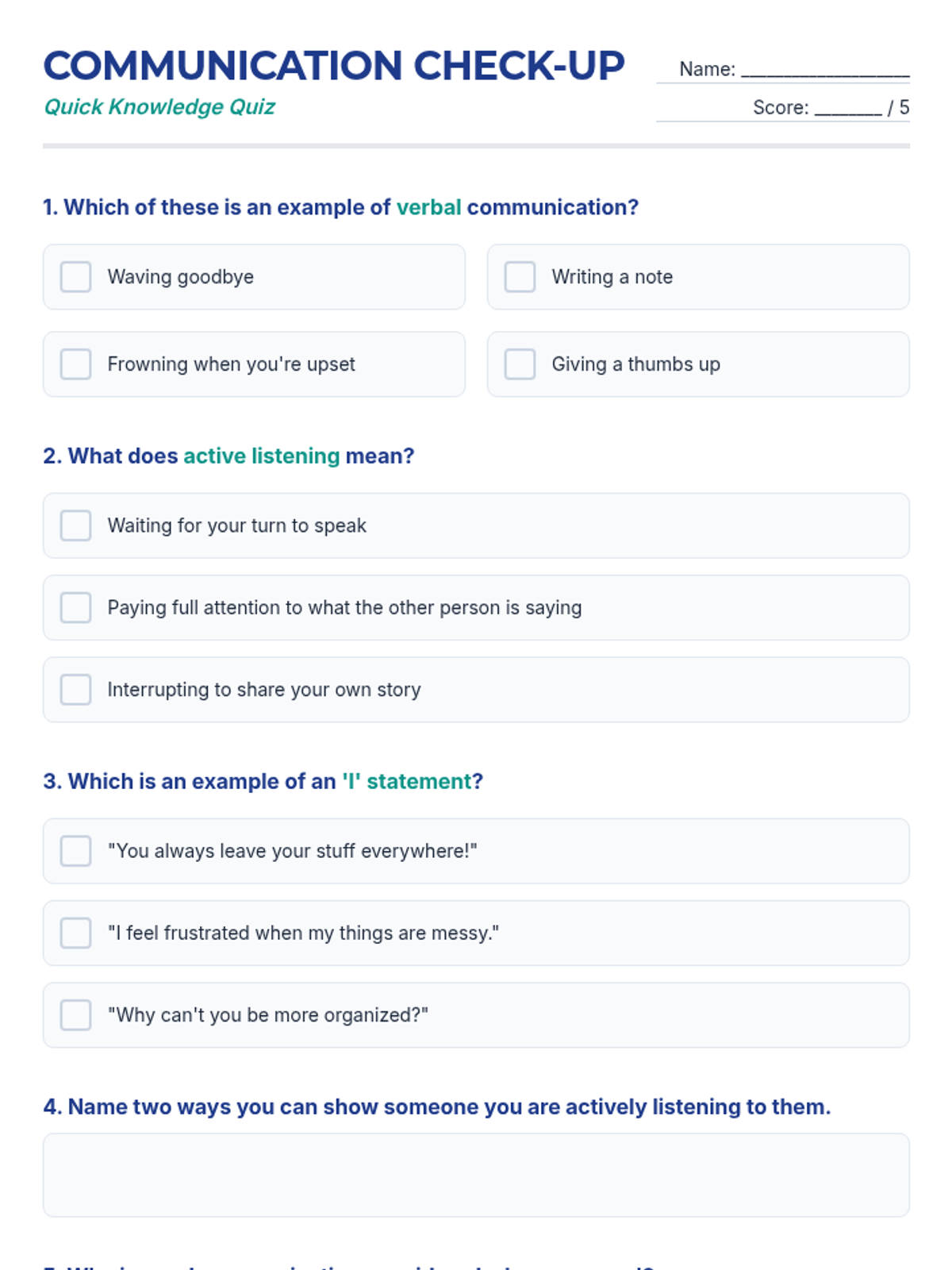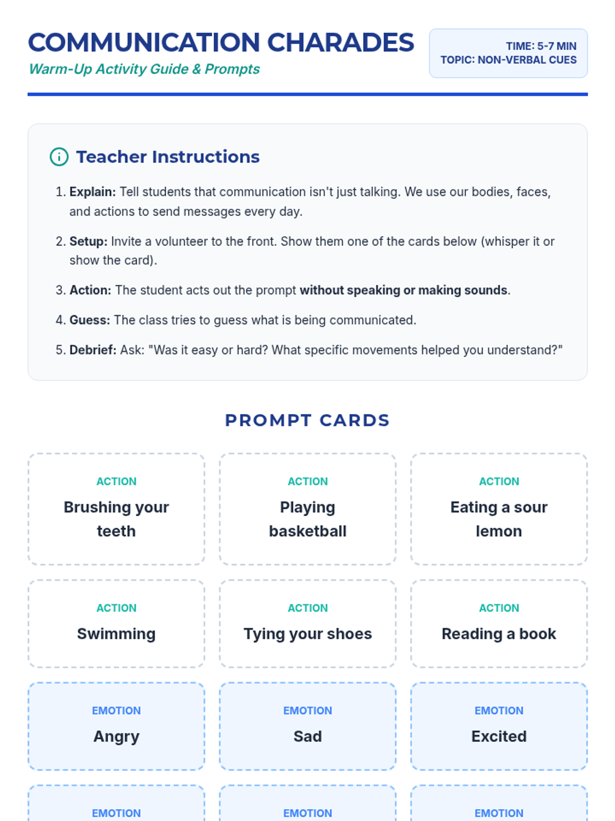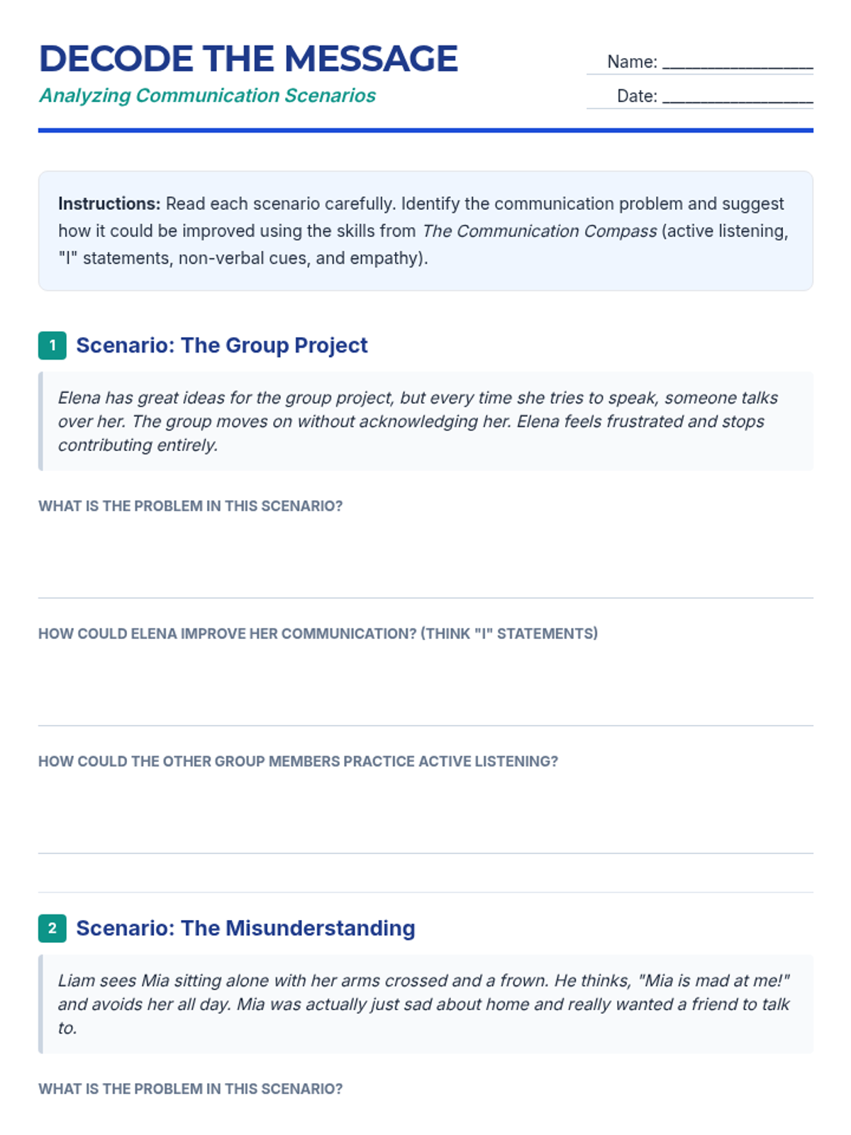 A 1-hour Tier 1 lesson for 5th and 6th graders to develop essential communication skills, including active listening, clear expression using 'I' statements, and understanding non-verbal cues.