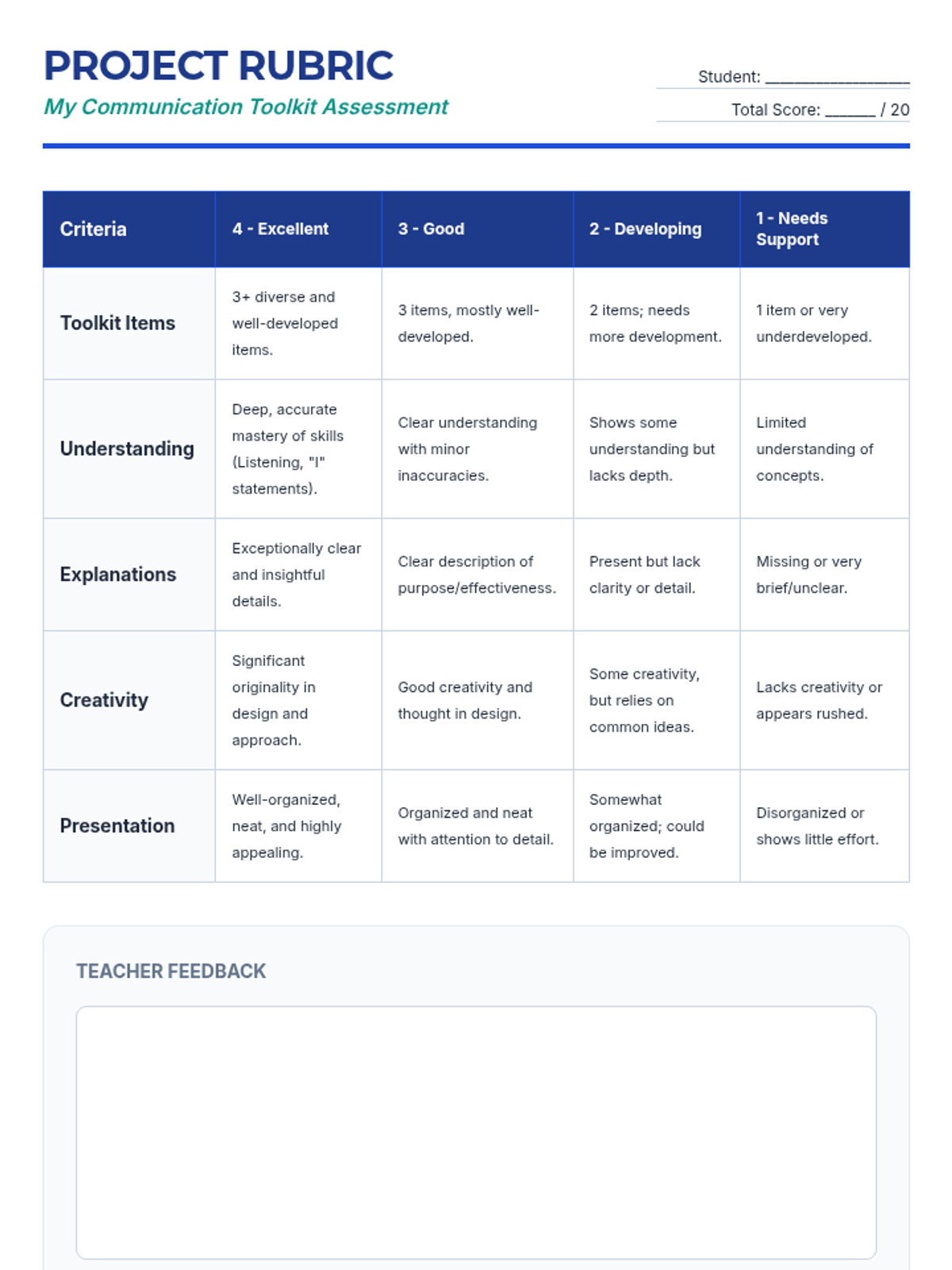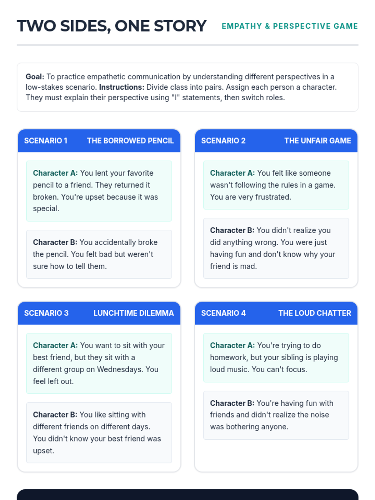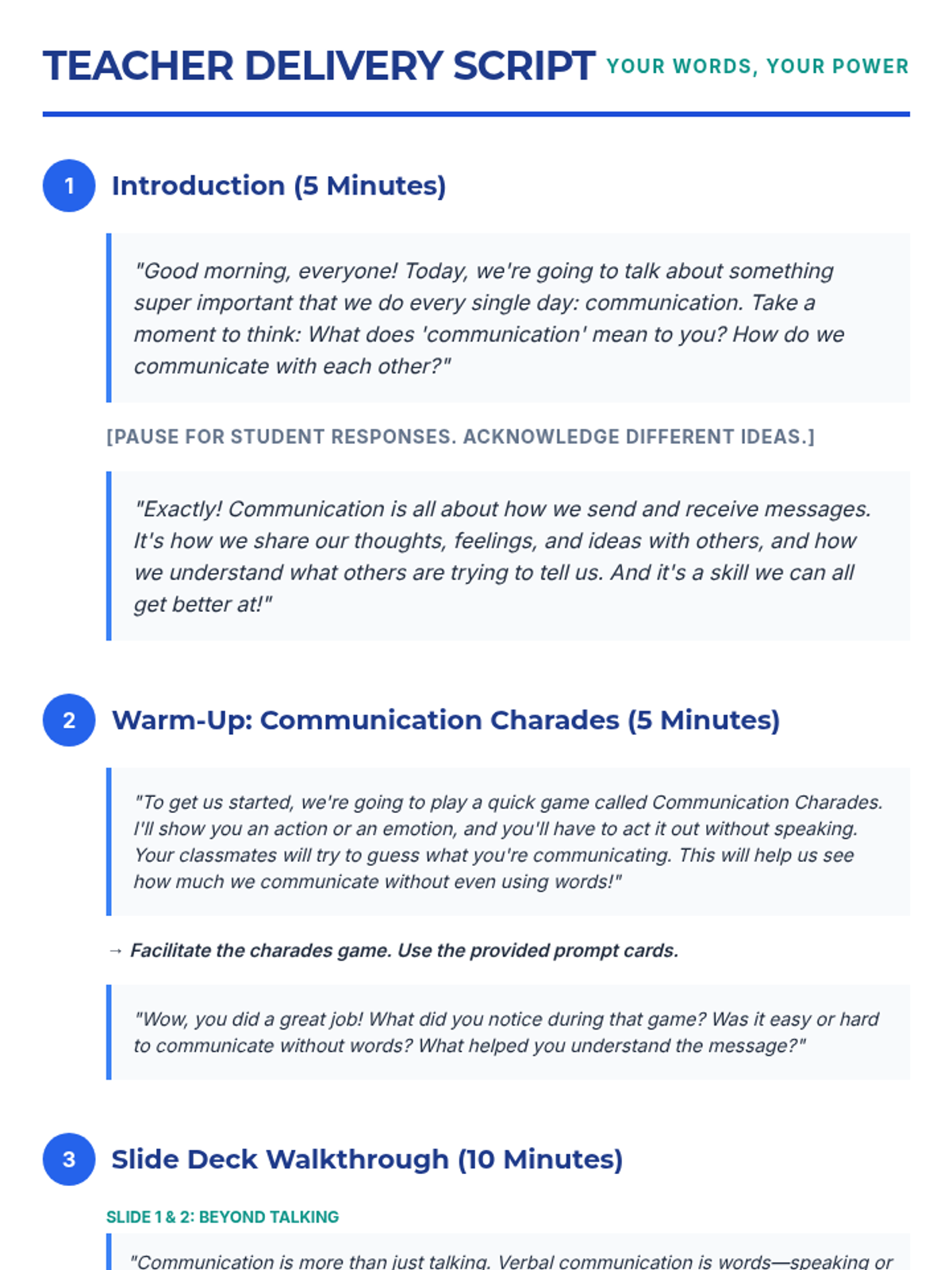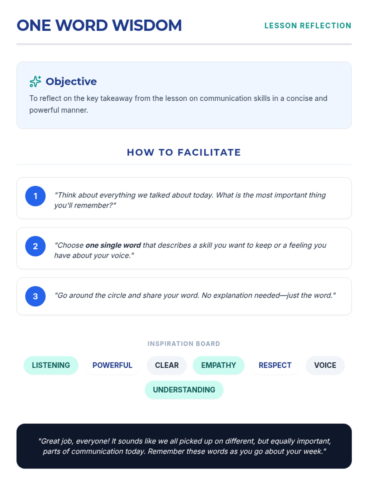 A 1-hour Tier 1 lesson for 5th and 6th graders to develop essential communication skills, including active listening, clear expression using 'I' statements, and understanding non-verbal cues.