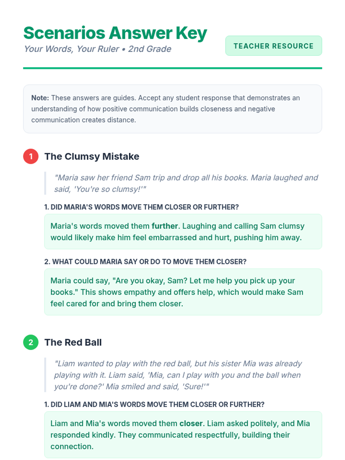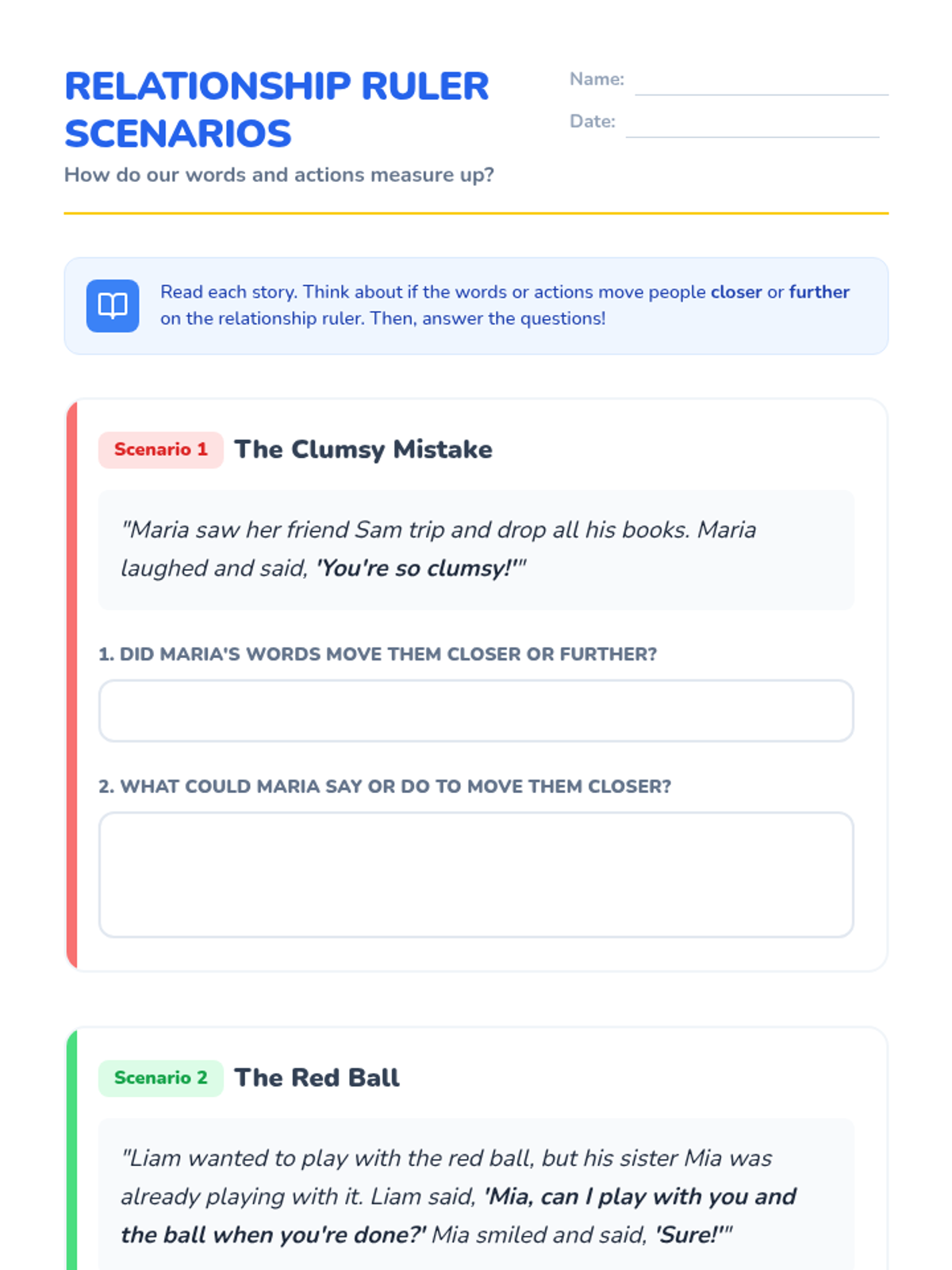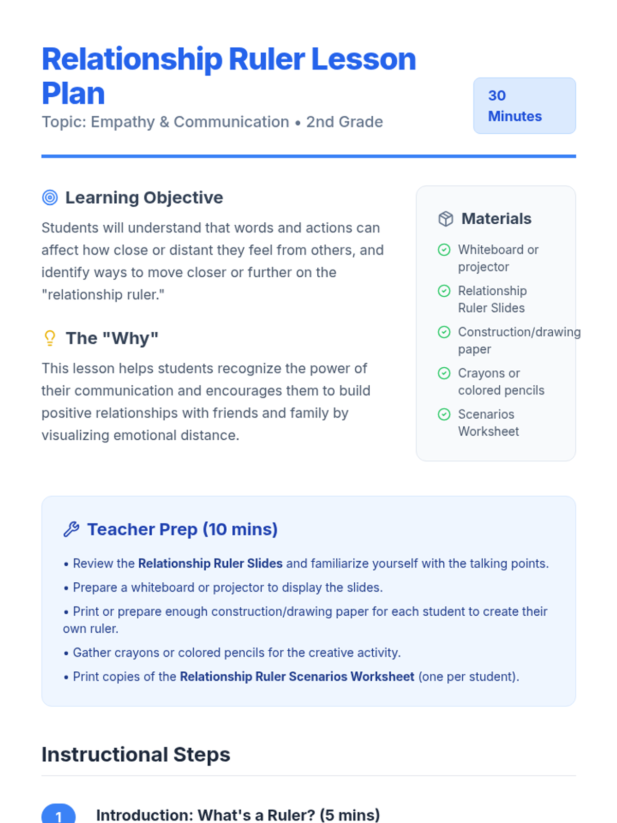 A 30-minute lesson for 2nd graders introducing the 'relationship ruler' concept to help students understand how their words and actions impact their connections with others.