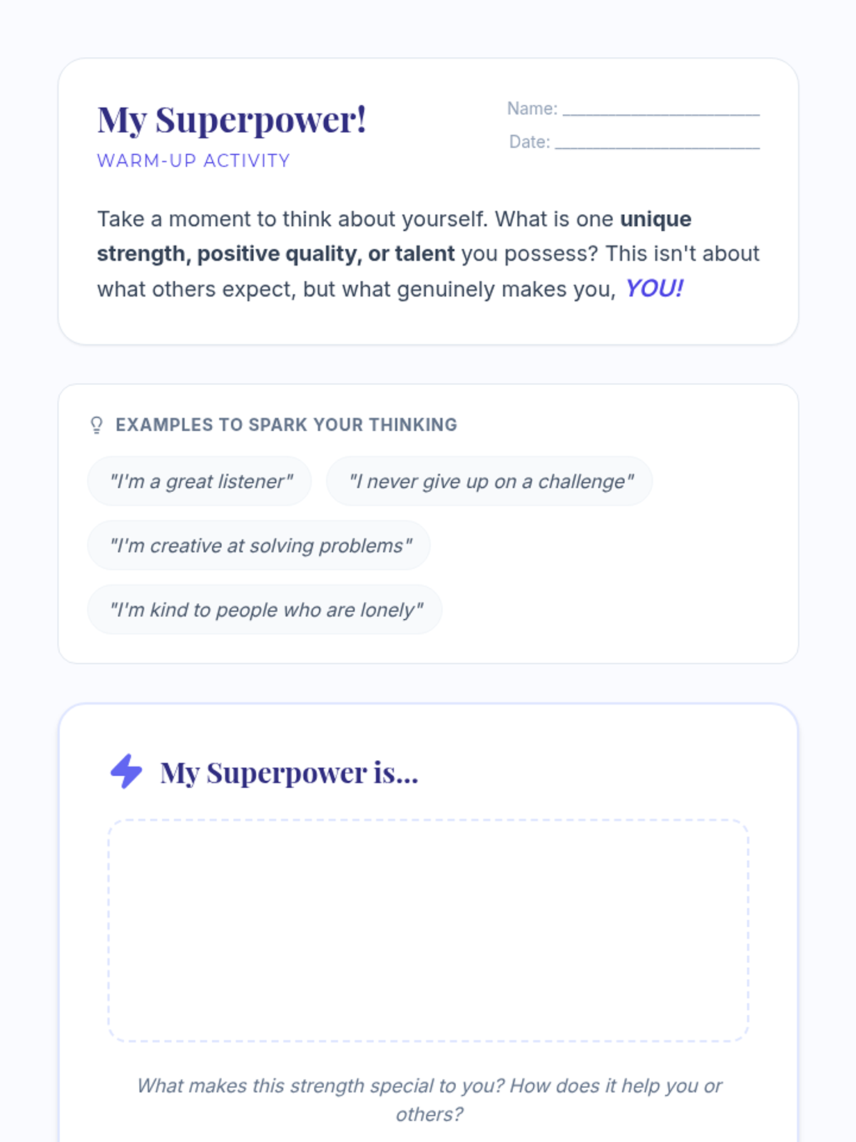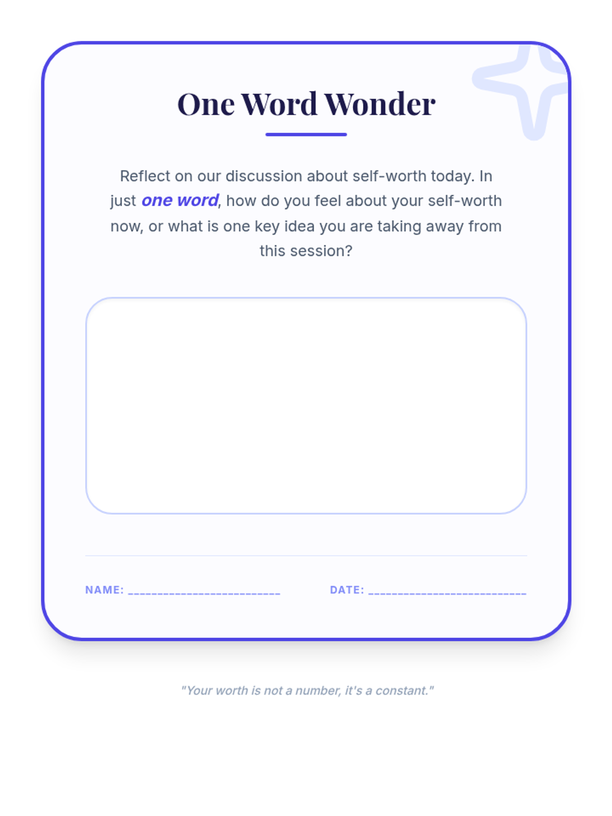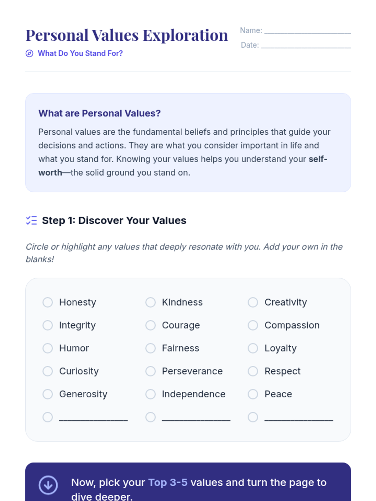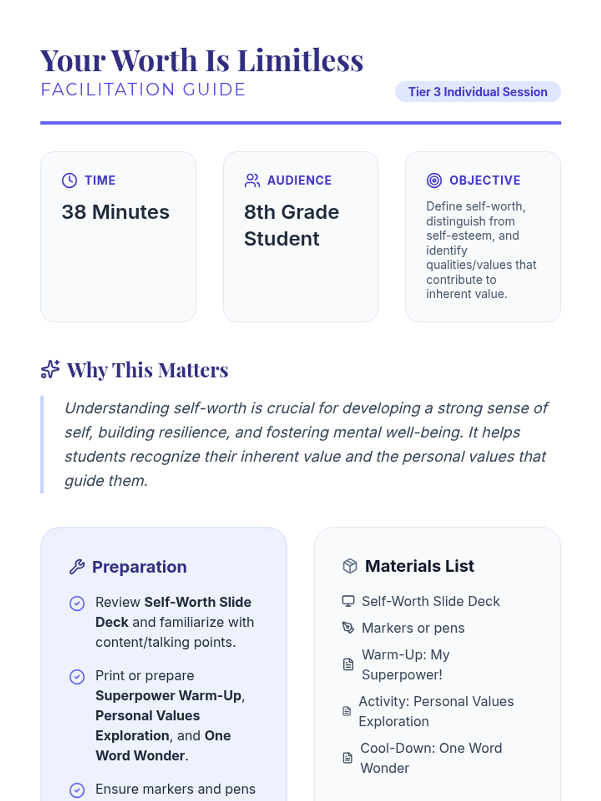 A Tier 3 individual session for 8th-grade students exploring inherent self-worth, distinguishing it from self-esteem, and identifying personal values.