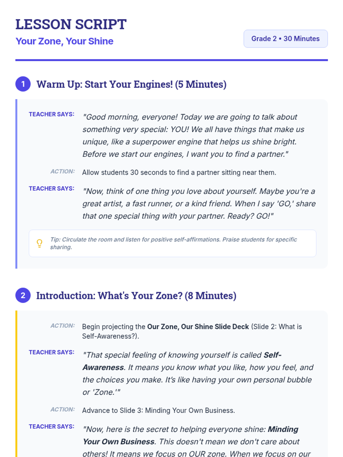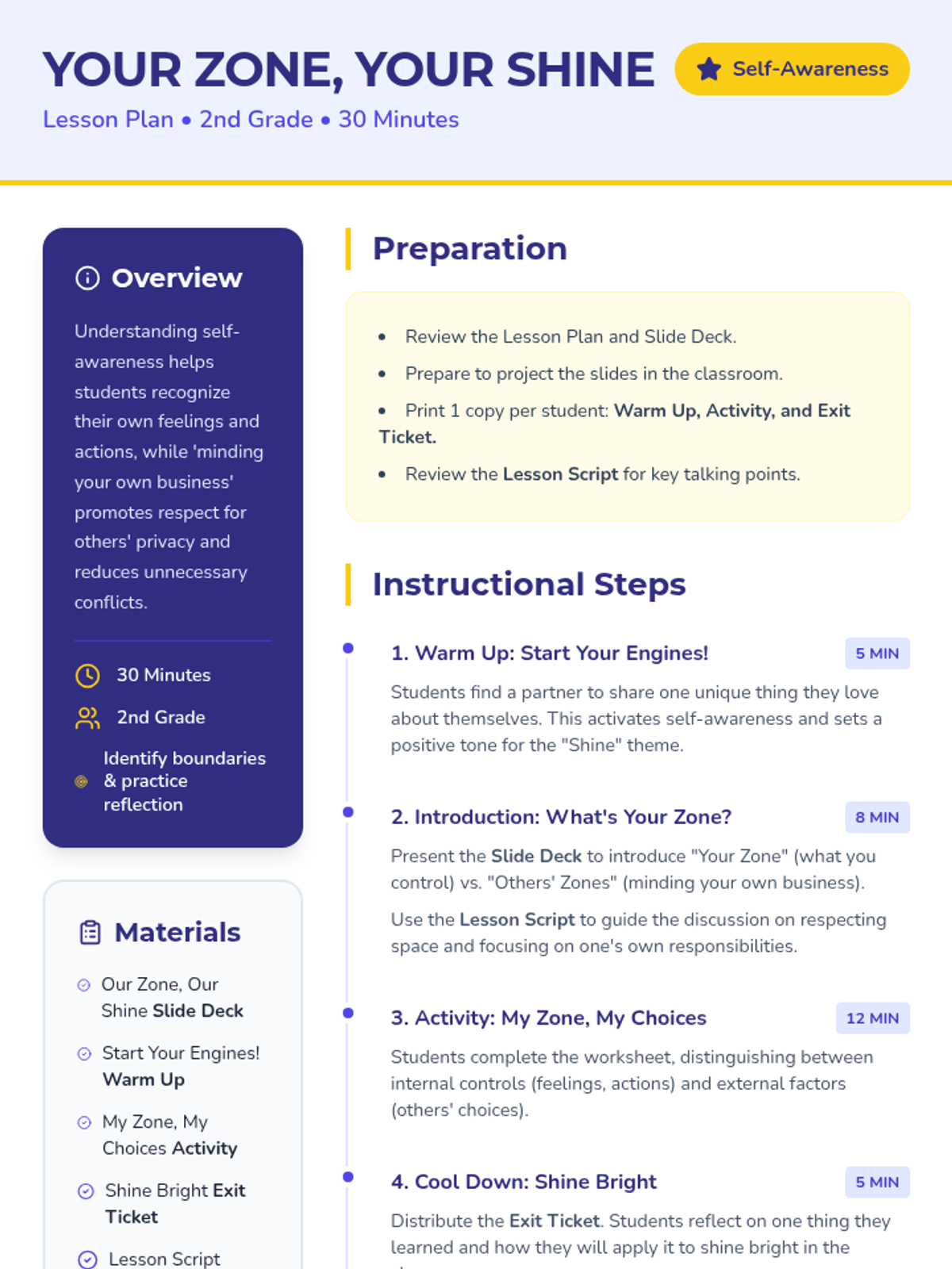 A 30-minute lesson for 2nd graders focusing on self-awareness and personal boundaries through the concept of 'minding your own business.' students learn to identify what they can control within their 'zone' and how to respect others.