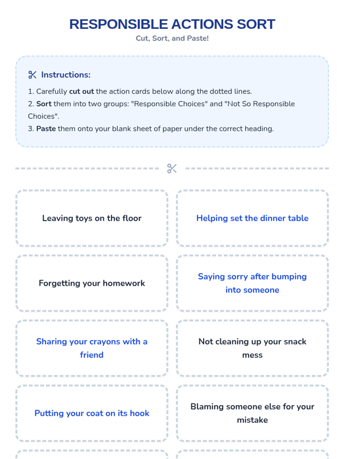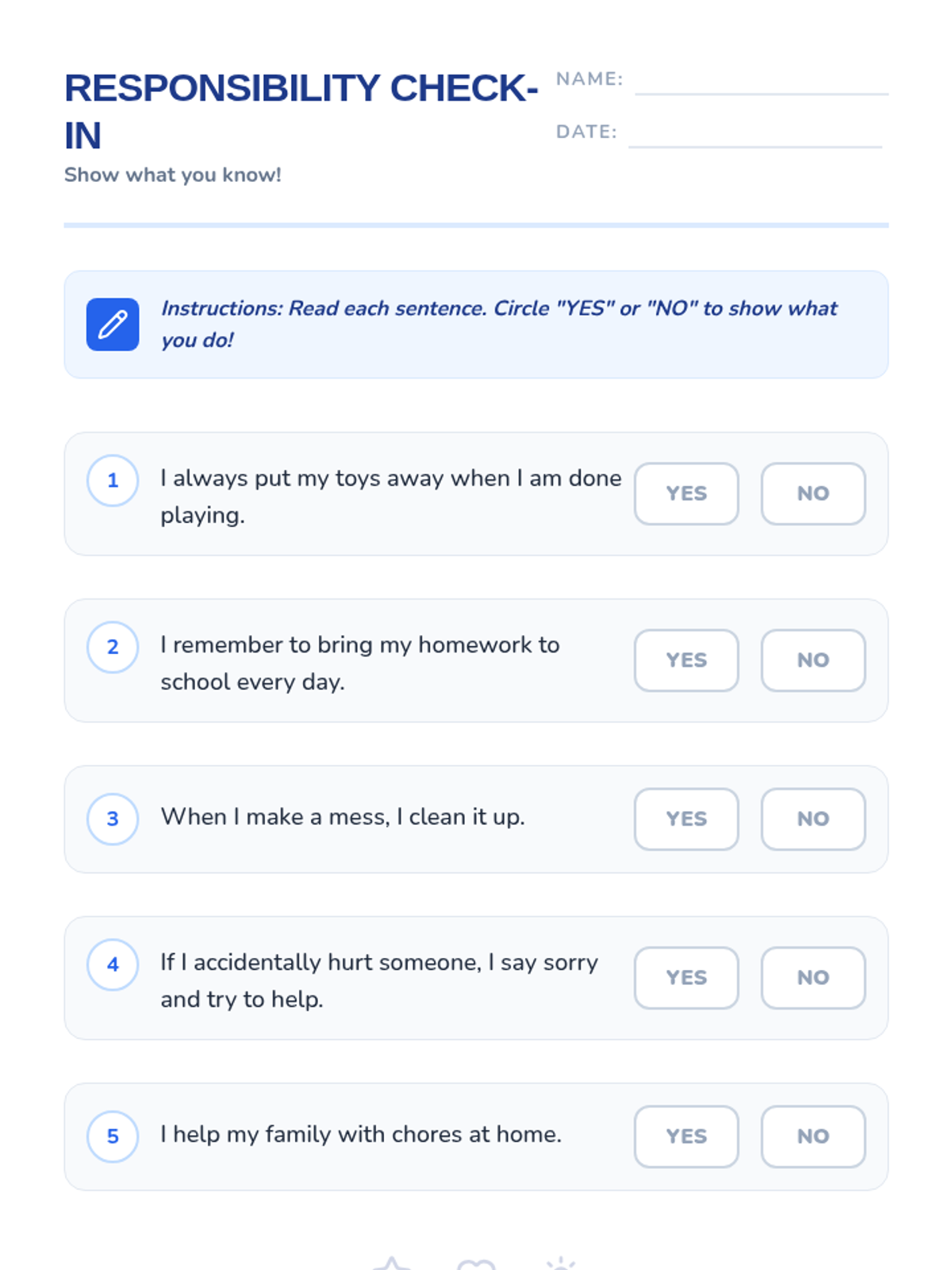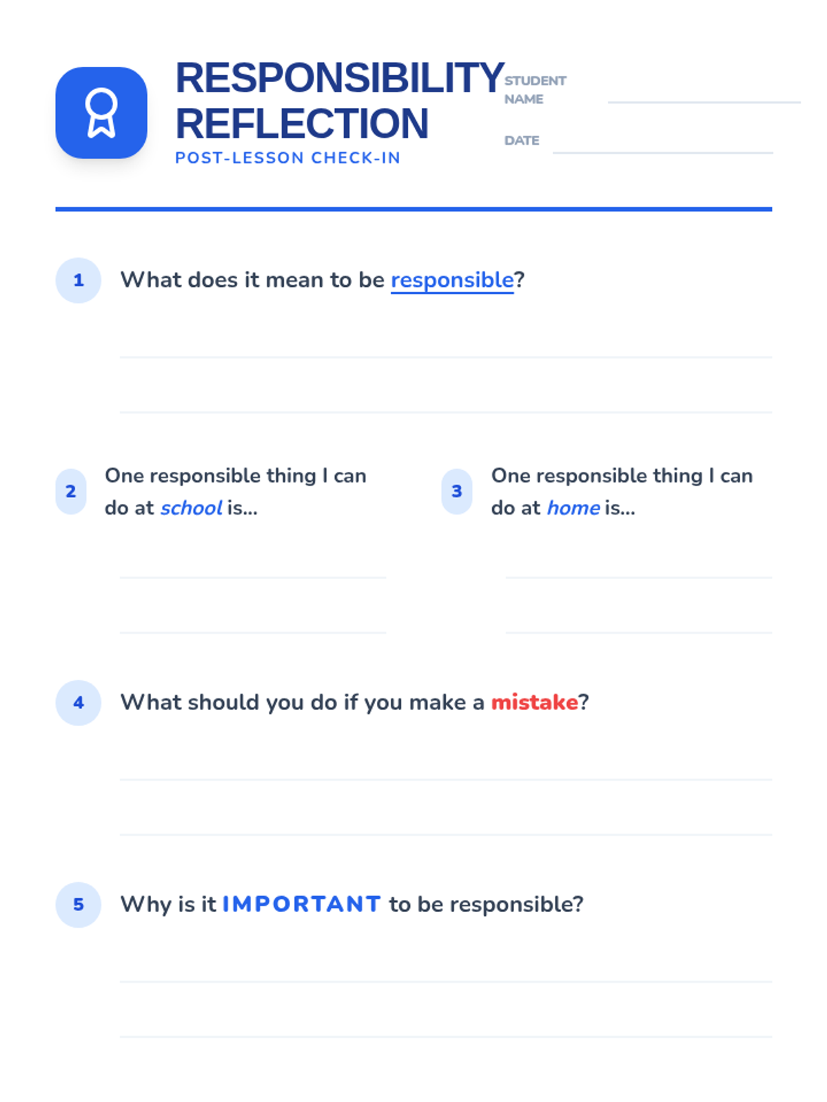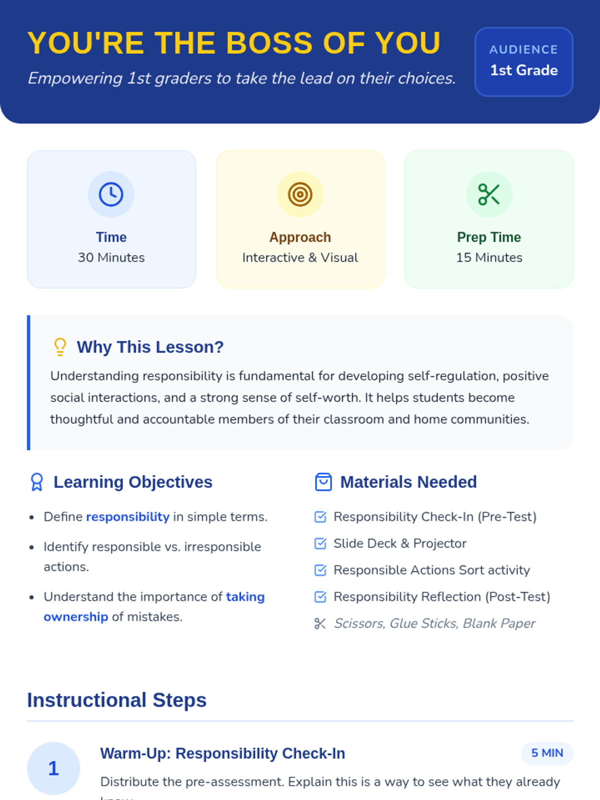 A 1st-grade lesson on responsibility, helping students understand self-regulation, taking ownership of actions, and making positive choices at home and school.