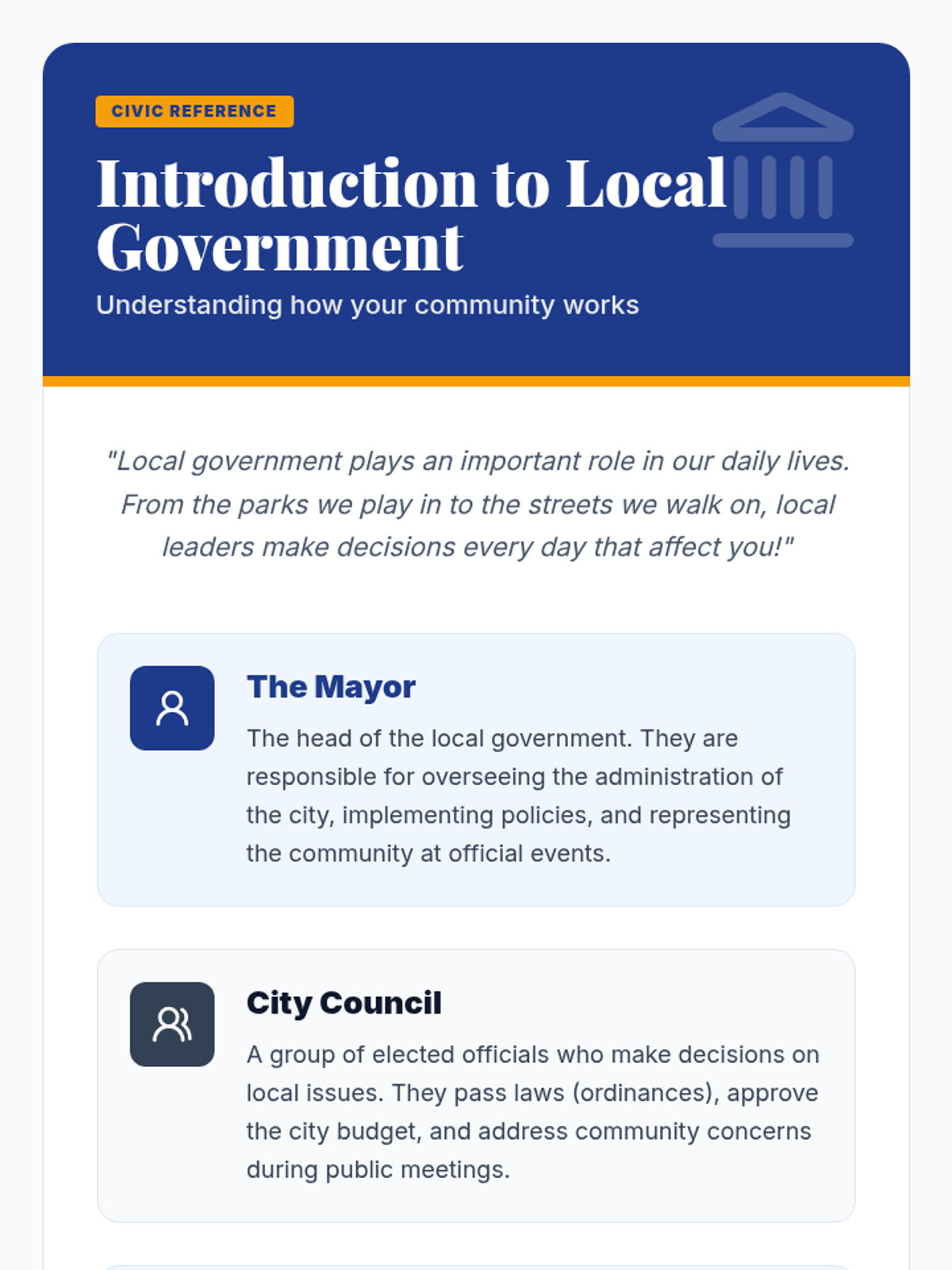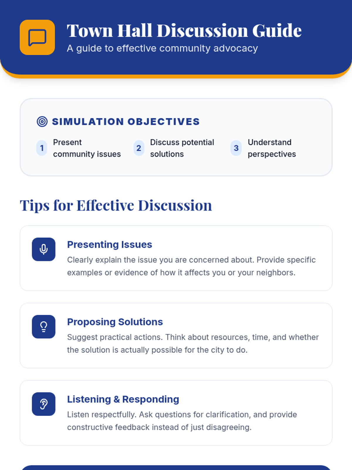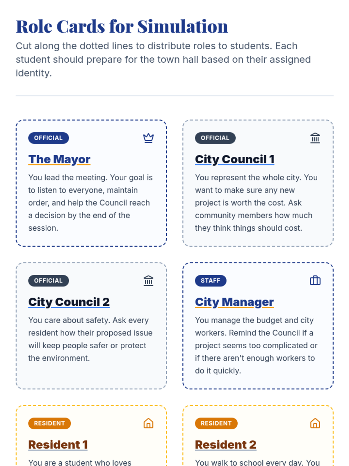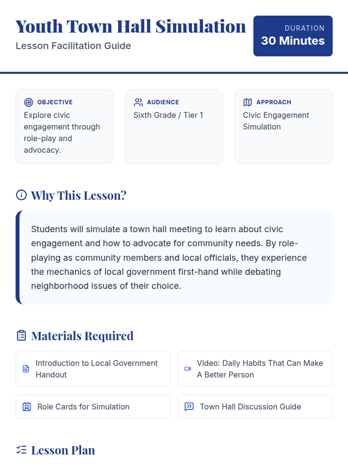 A 30-minute simulation where students role-play as community members and local officials to learn about civic engagement and local government structure.