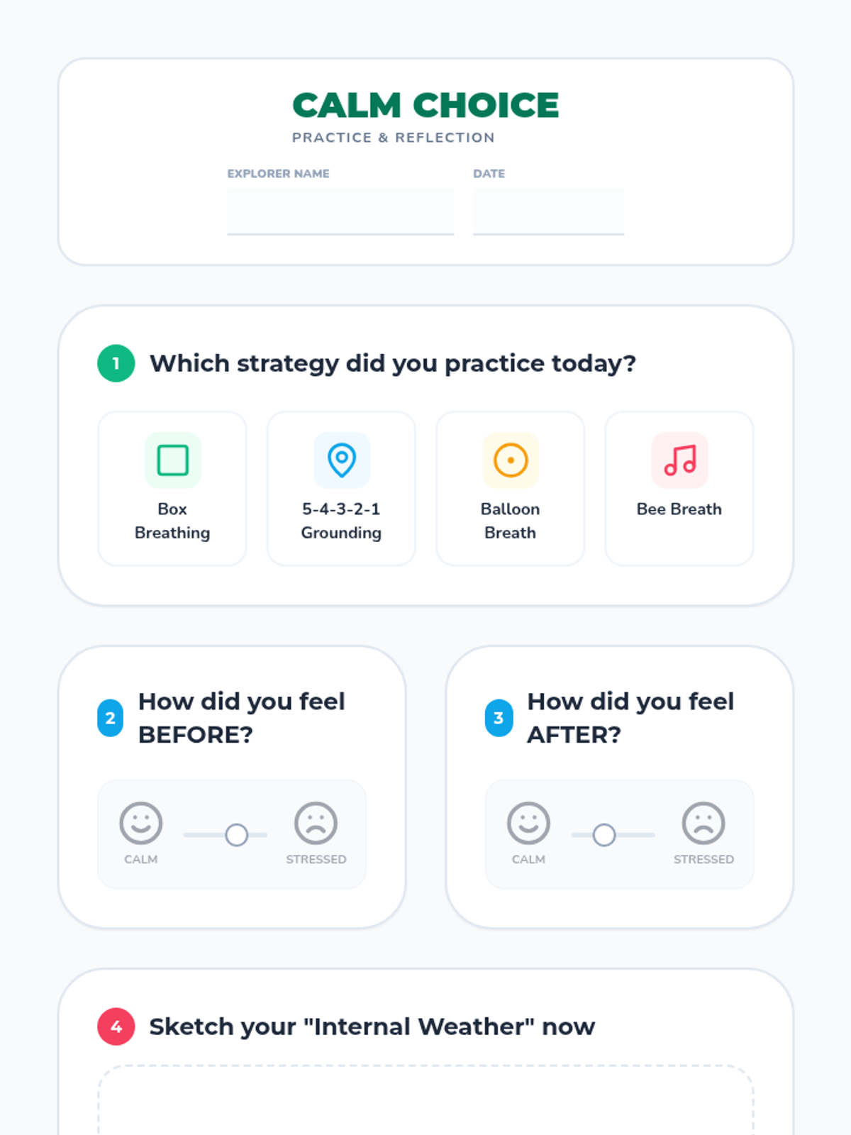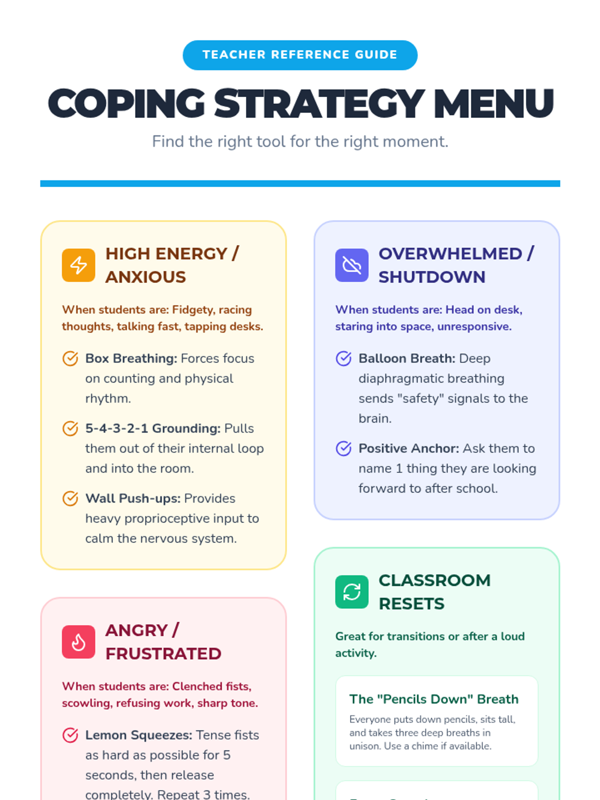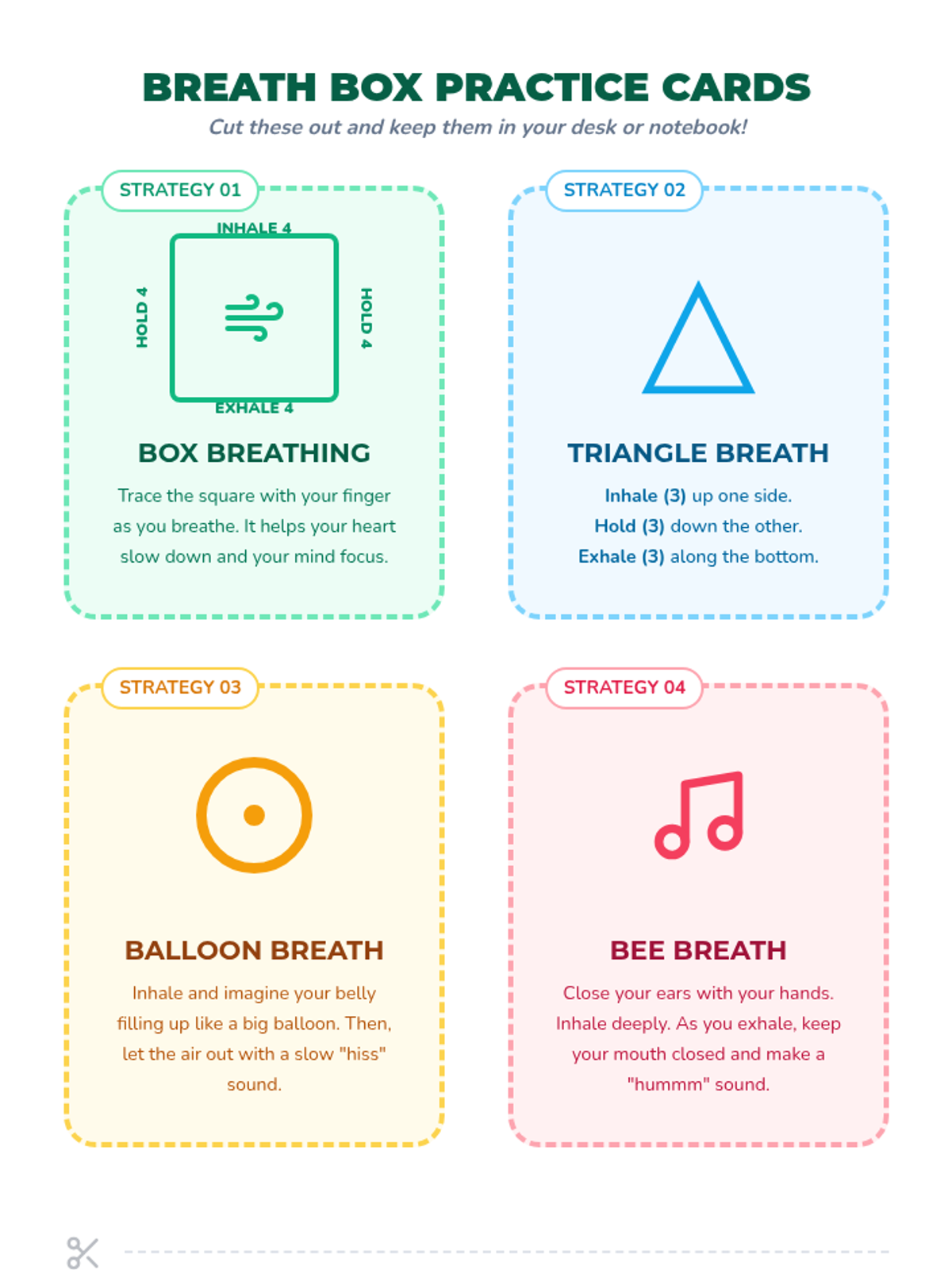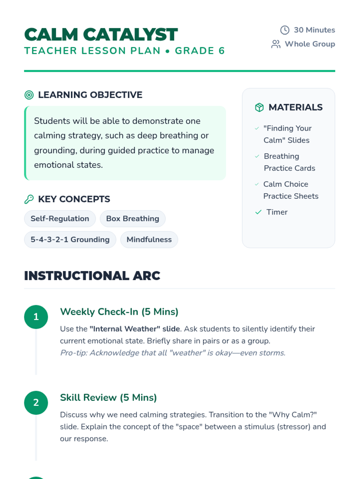 A 30-minute social-emotional learning lesson for 6th graders focused on identifying and practicing calming strategies like deep breathing and grounding to manage stress and emotions.