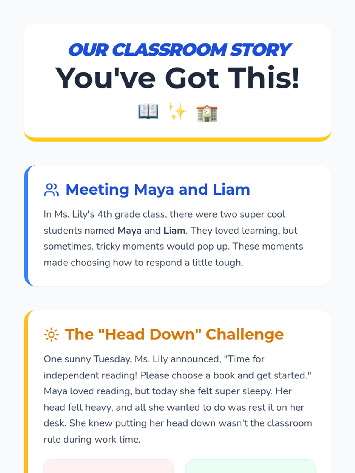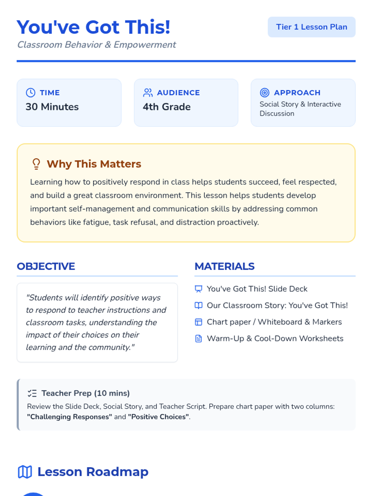 A 30-minute social-emotional learning lesson for 4th graders focused on managing common classroom challenges like task refusal and fatigue through positive behavioral choices and a social story.