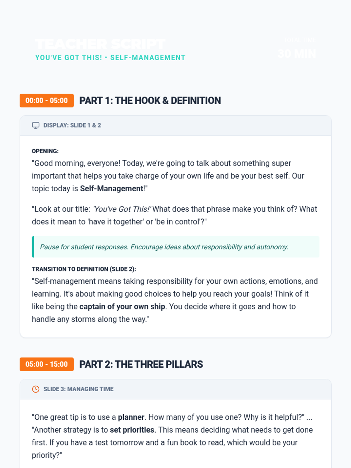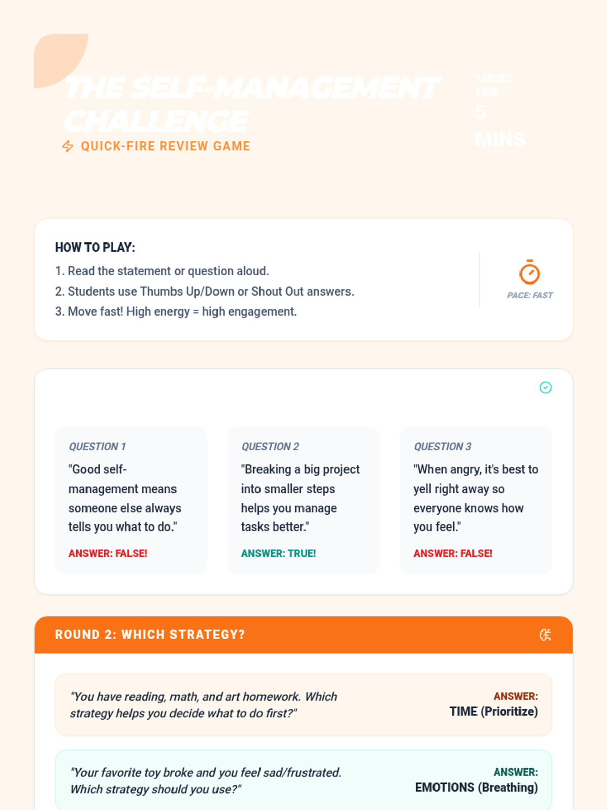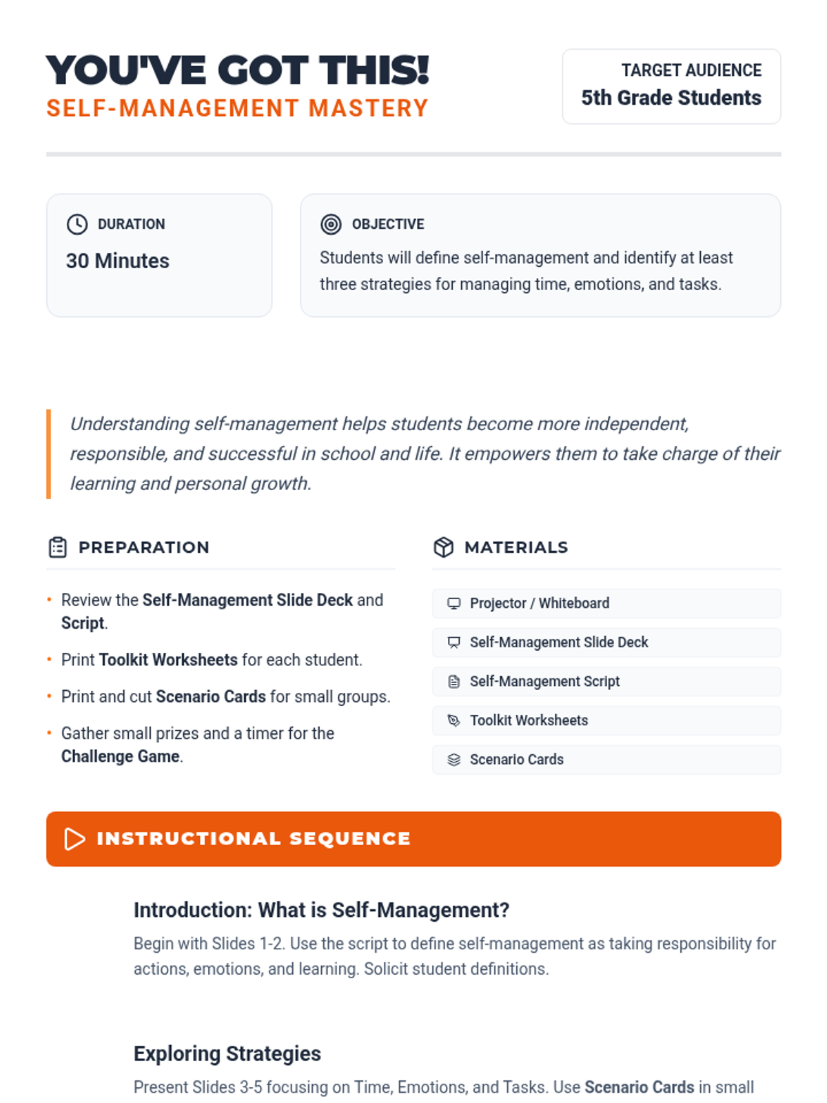 This 30-minute lesson for 5th-grade students introduces self-management, helping them take control of their actions and emotions to achieve goals through direct instruction and interactive scenarios.