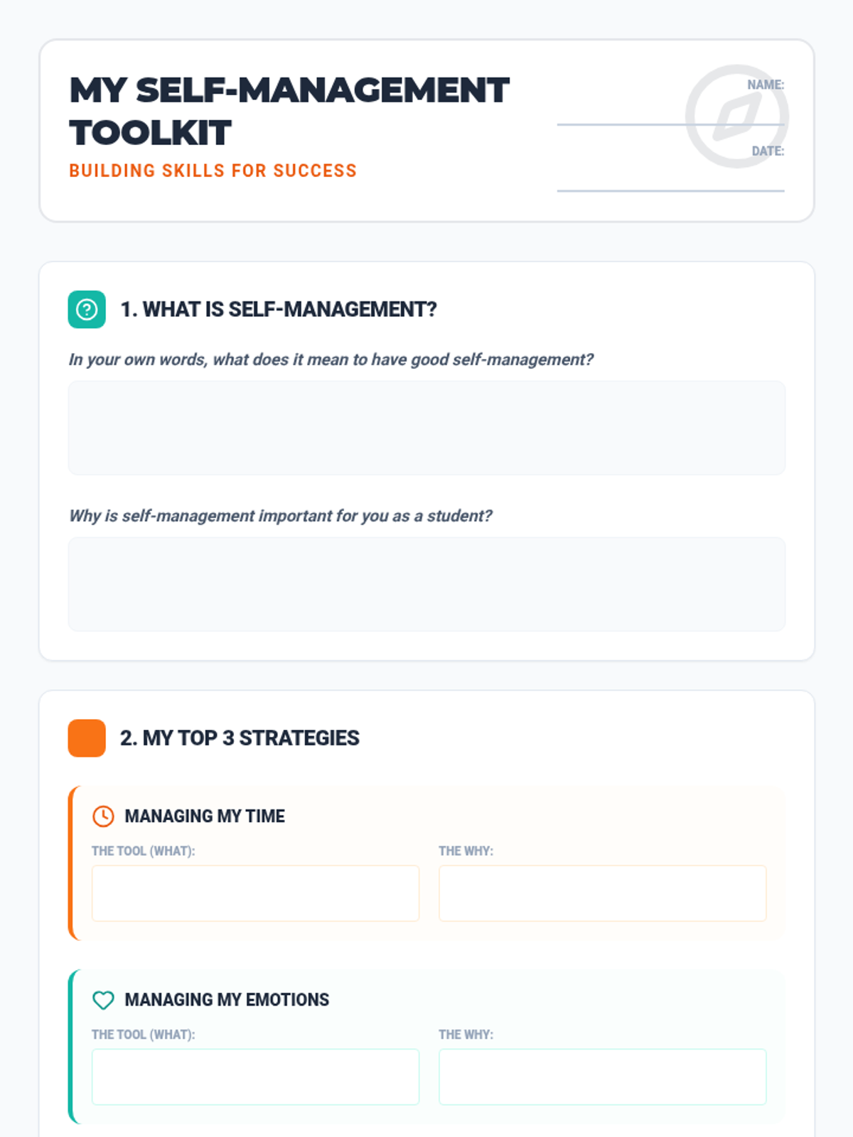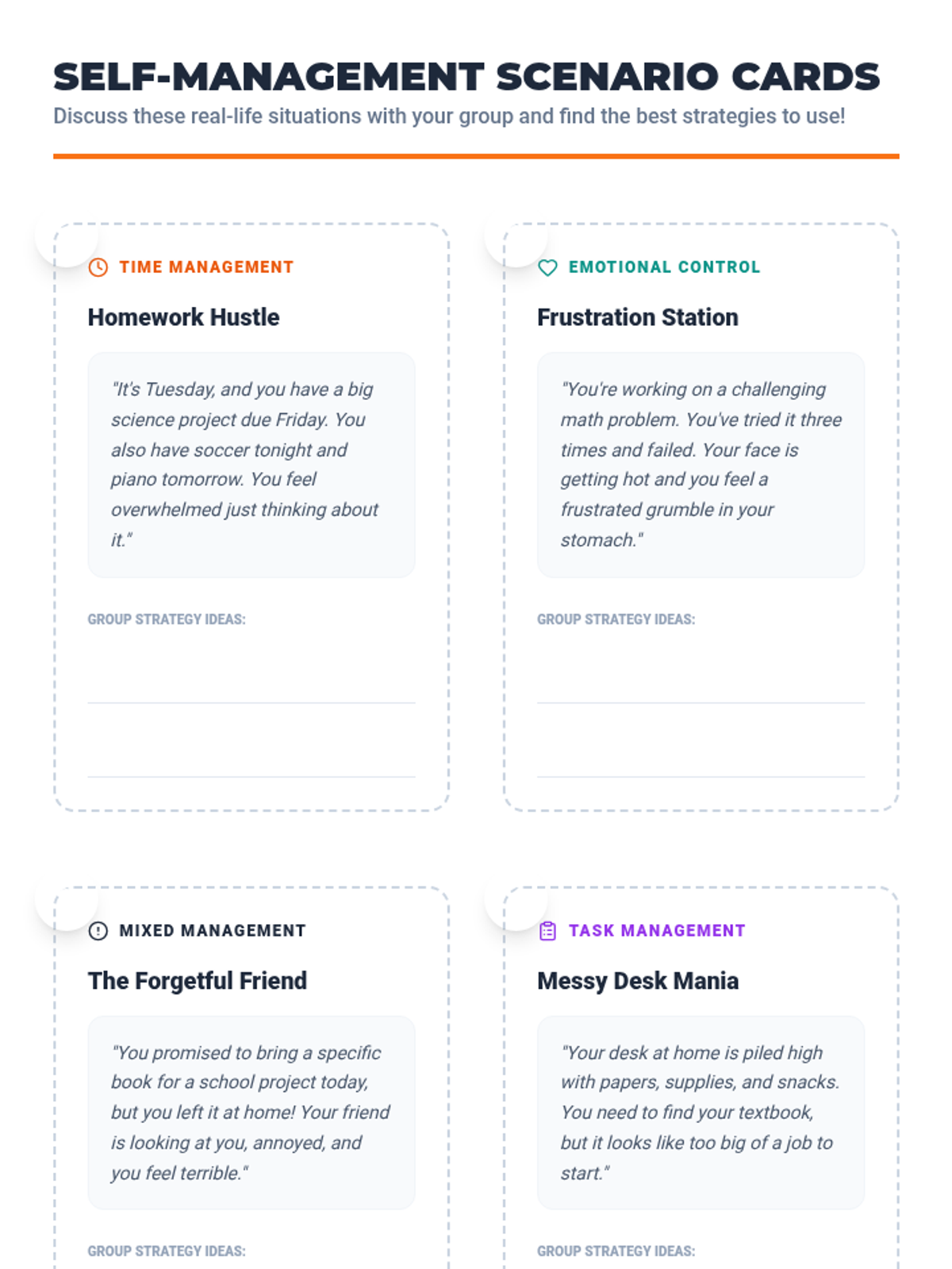 Managing impulsive behavior and big emotions like anger through self-regulation techniques.