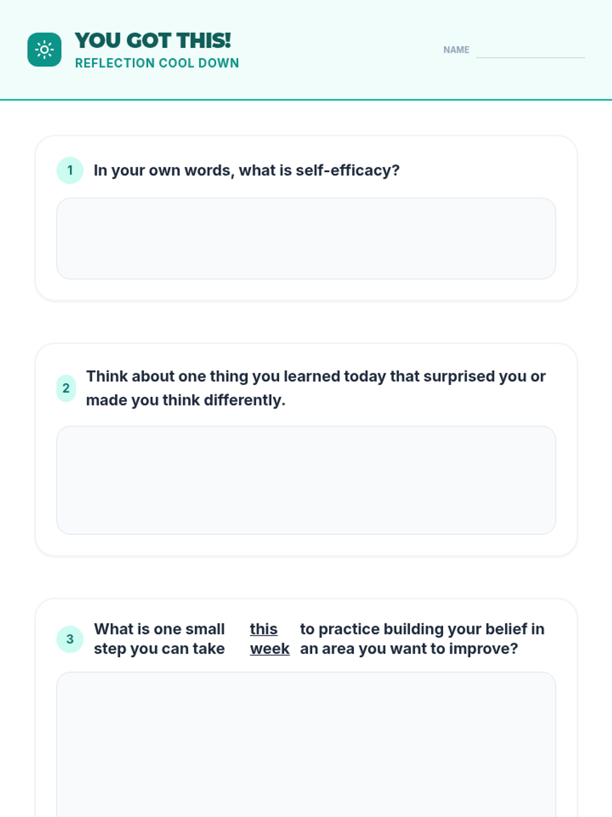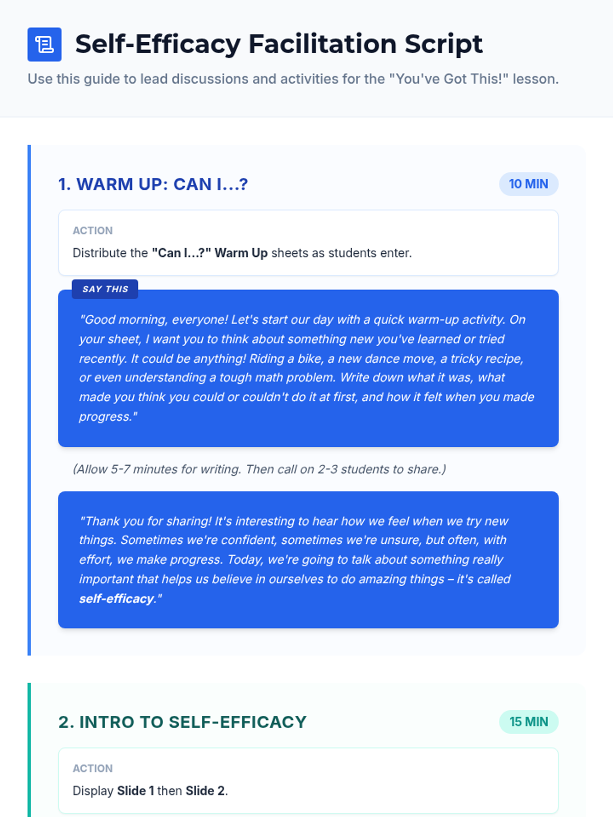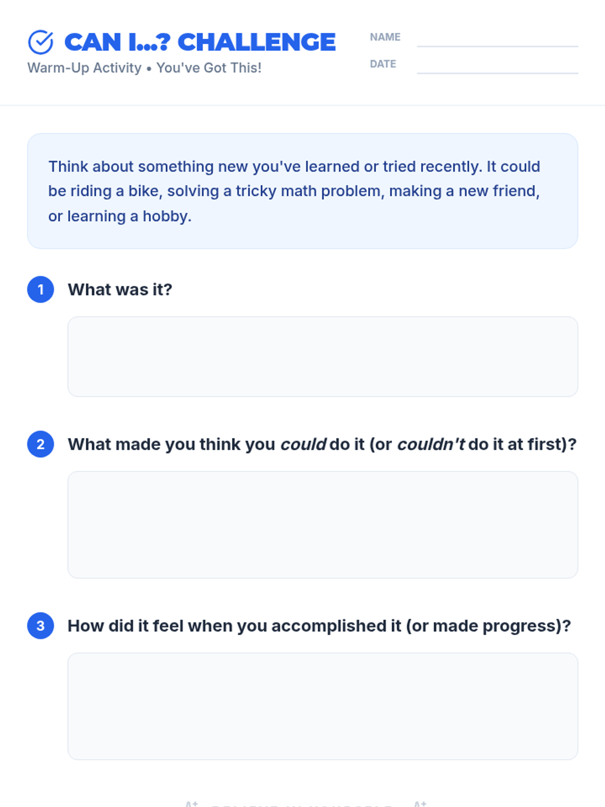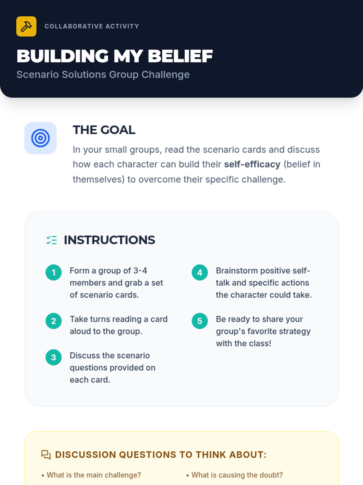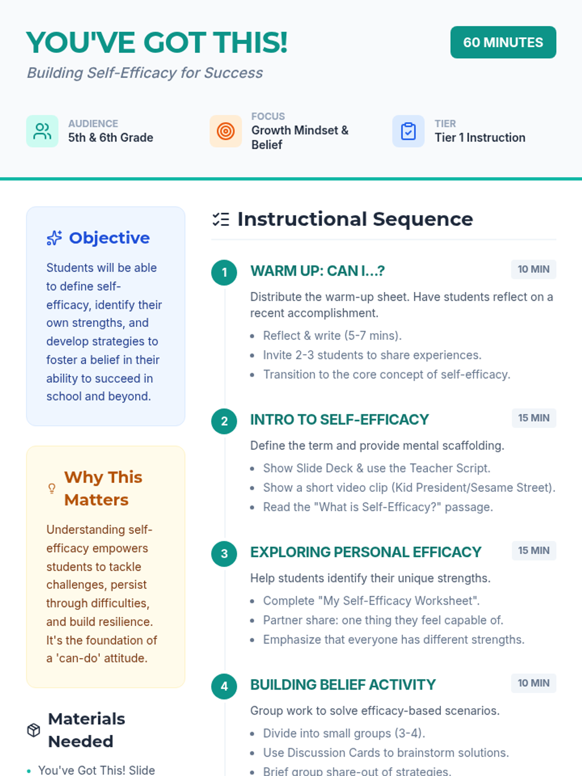 A 60-minute lesson for 5th and 6th graders designed to build self-efficacy, helping students recognize their strengths, learn from challenges, and develop a 'can-do' attitude for school and life.