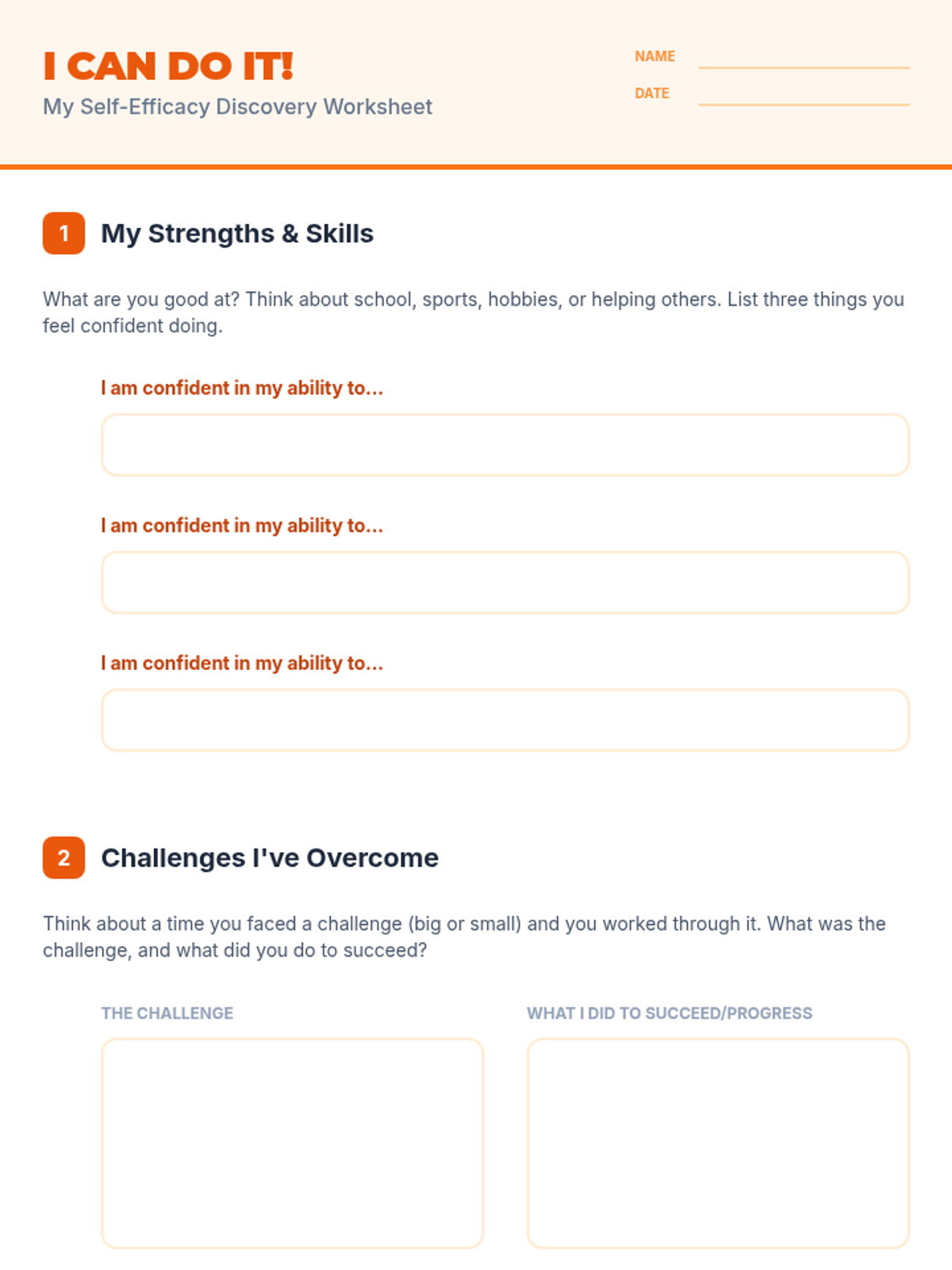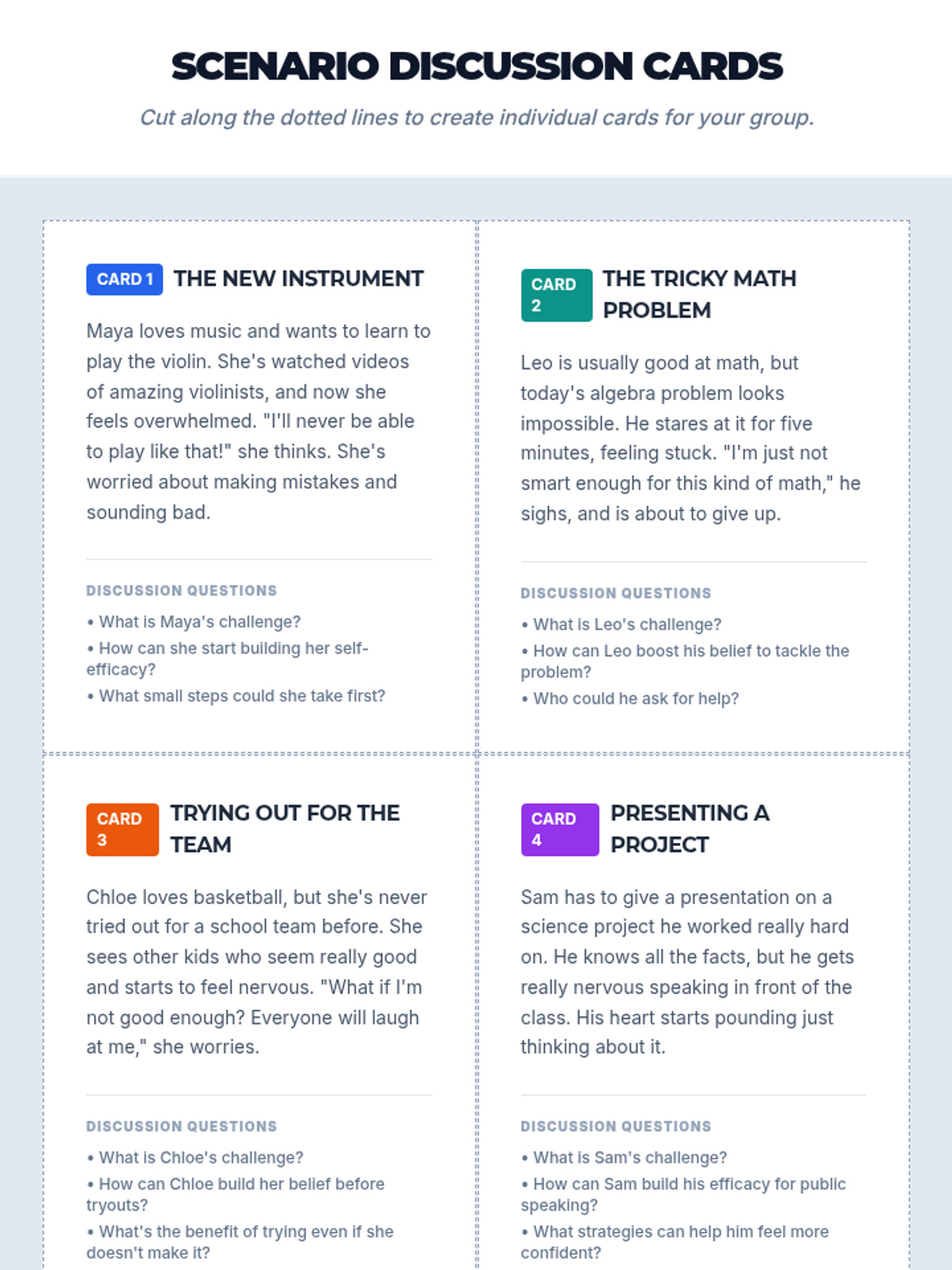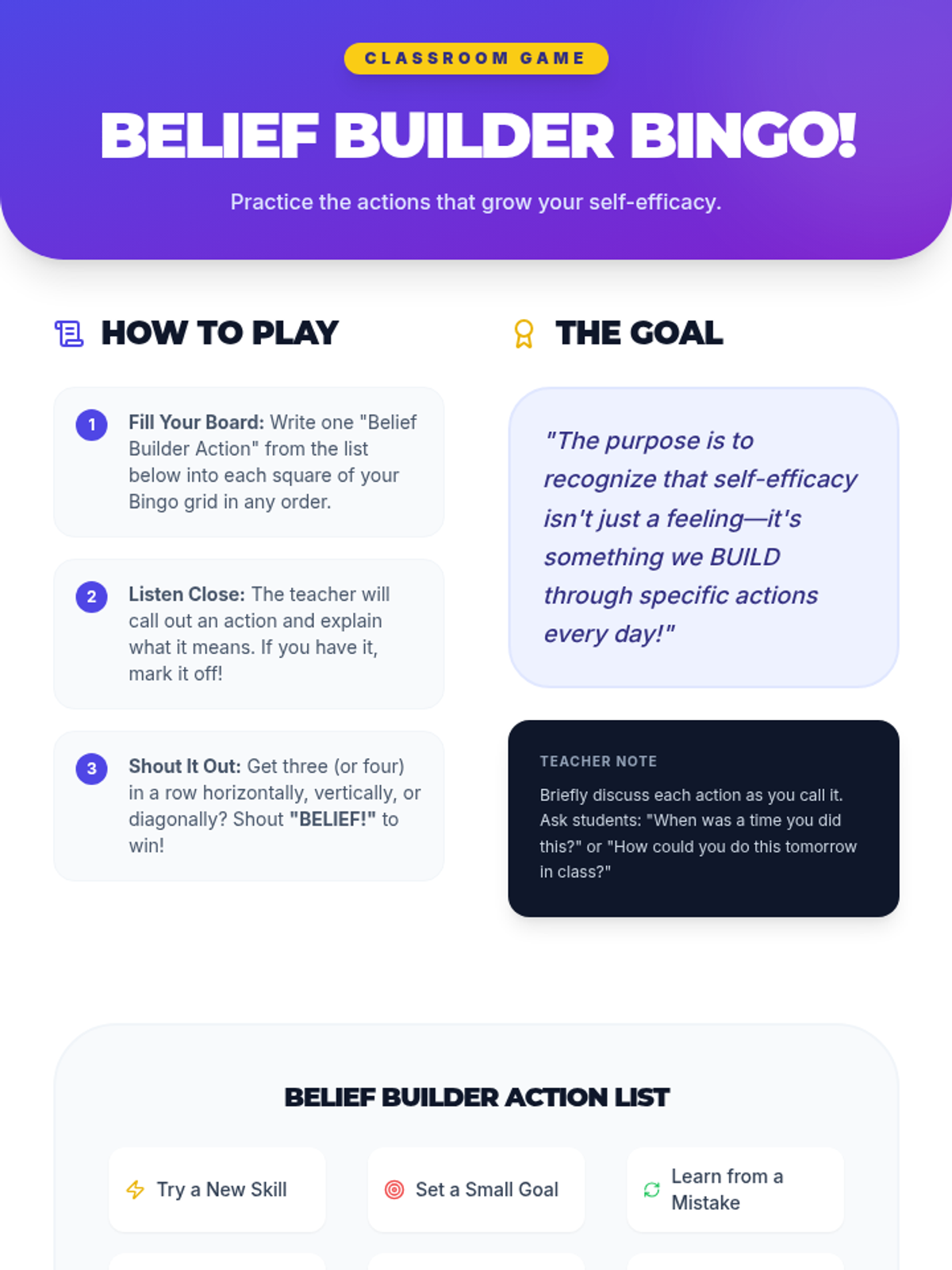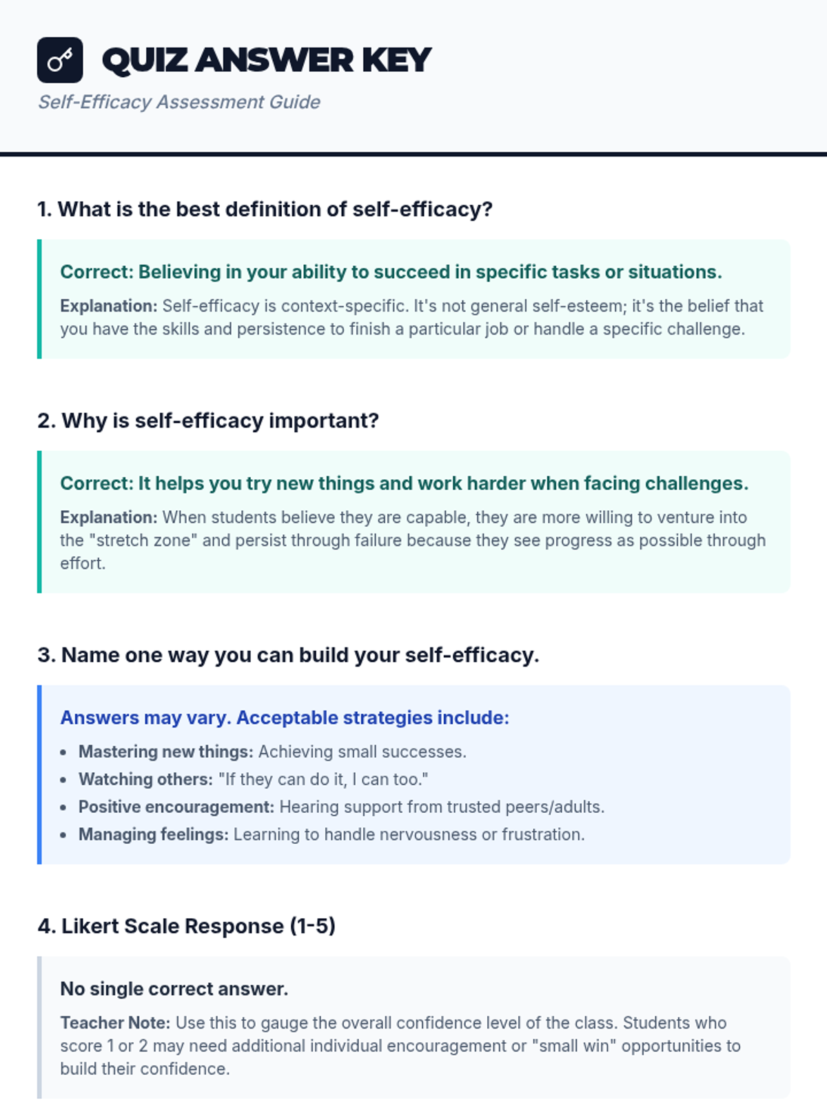 A 60-minute lesson for 5th and 6th graders designed to build self-efficacy, helping students recognize their strengths, learn from challenges, and develop a 'can-do' attitude for school and life.