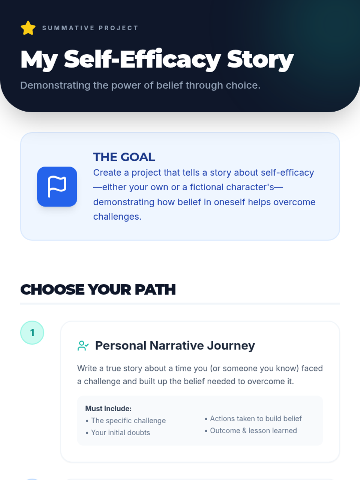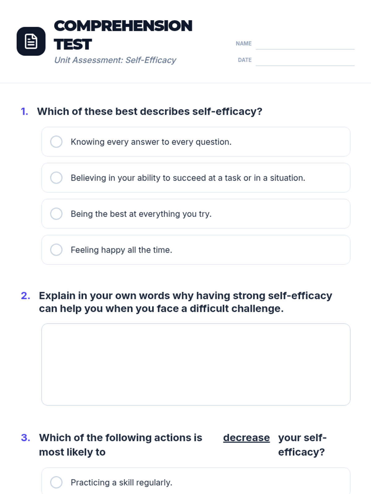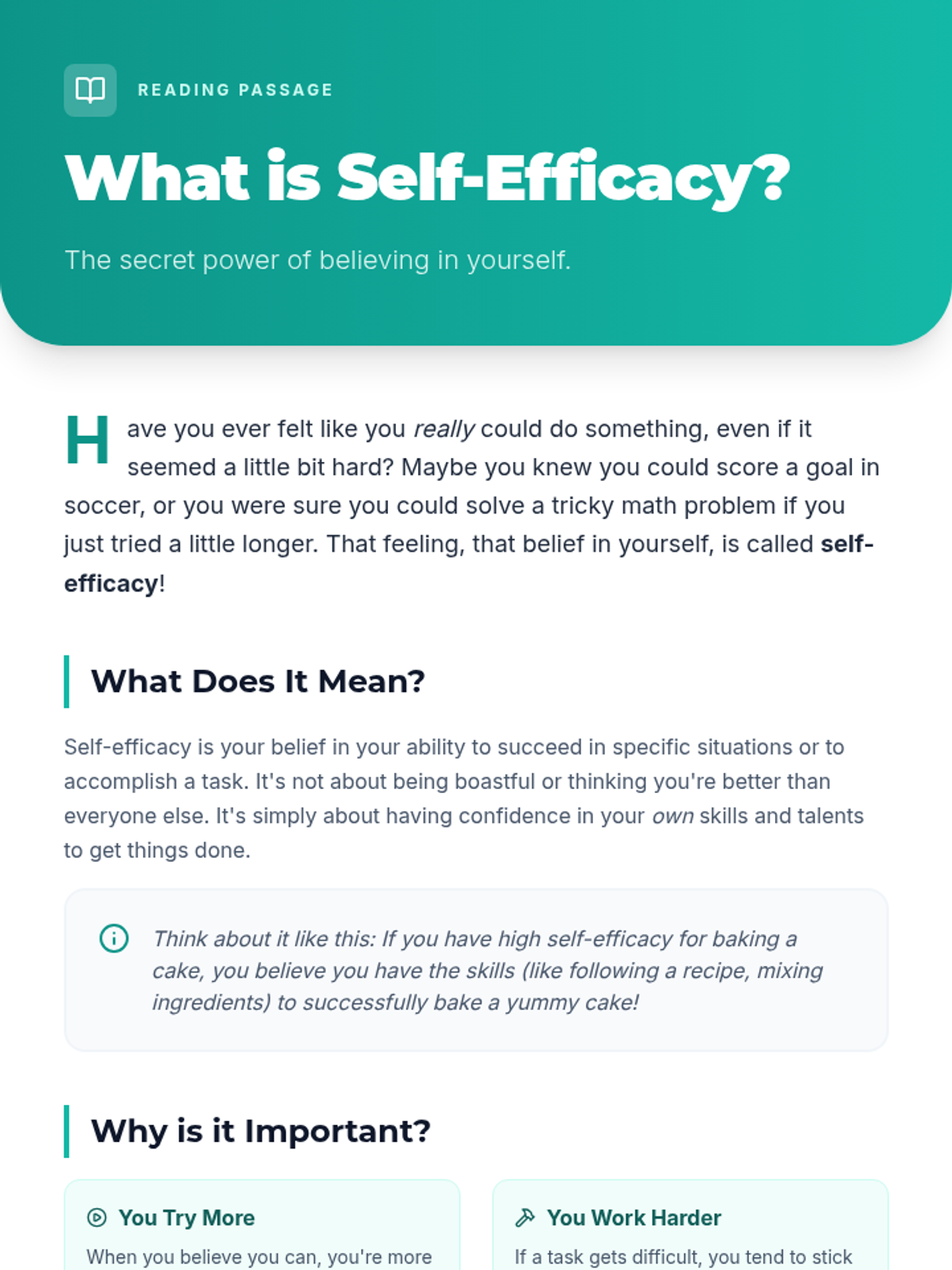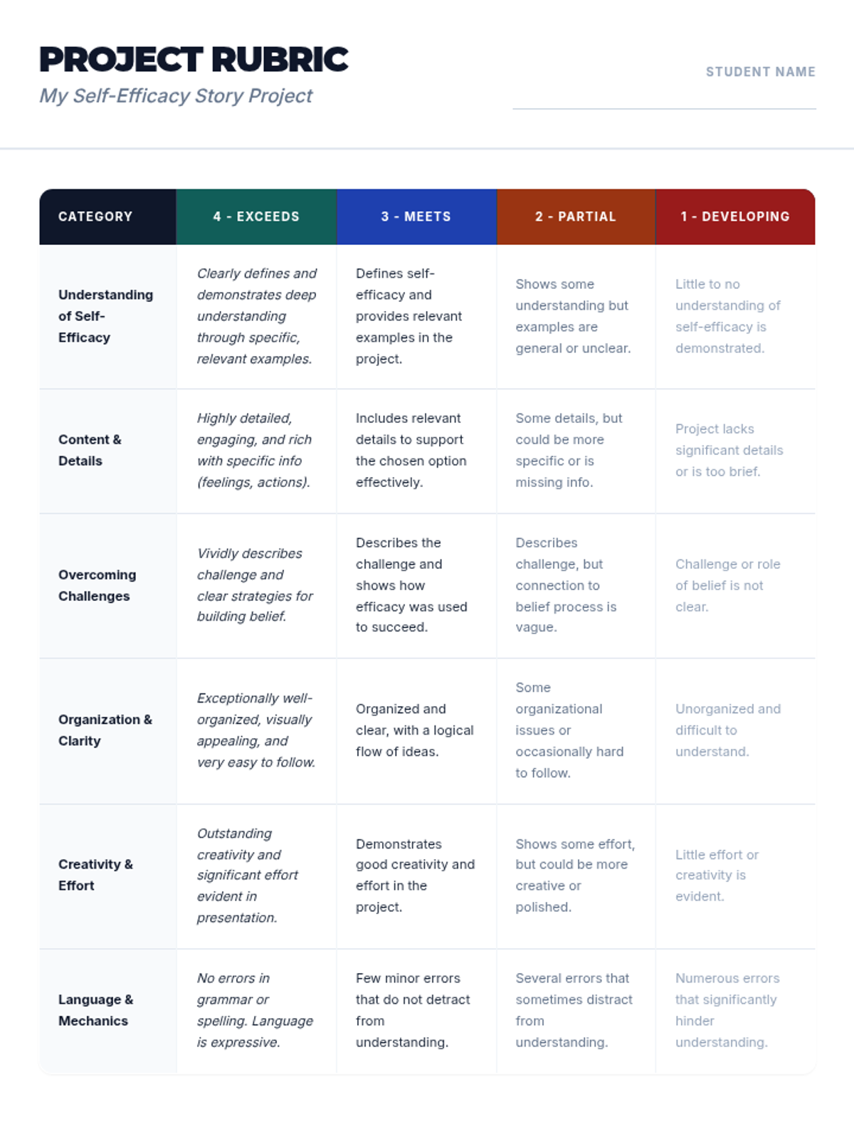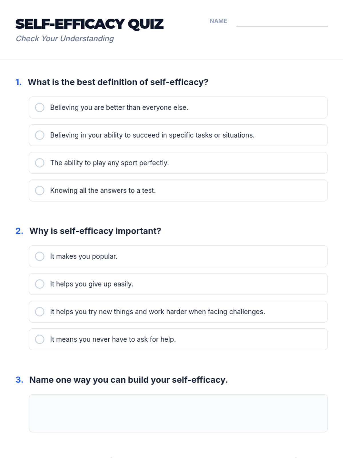 A 60-minute lesson for 5th and 6th graders designed to build self-efficacy, helping students recognize their strengths, learn from challenges, and develop a 'can-do' attitude for school and life.