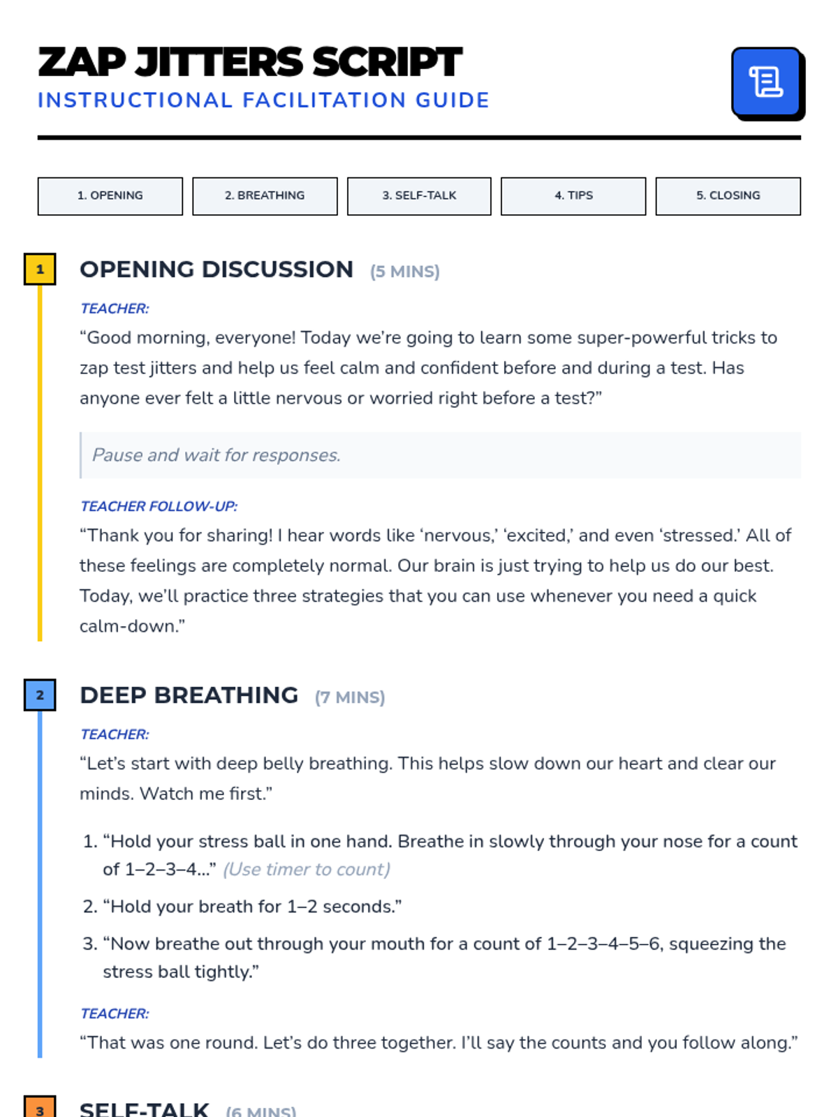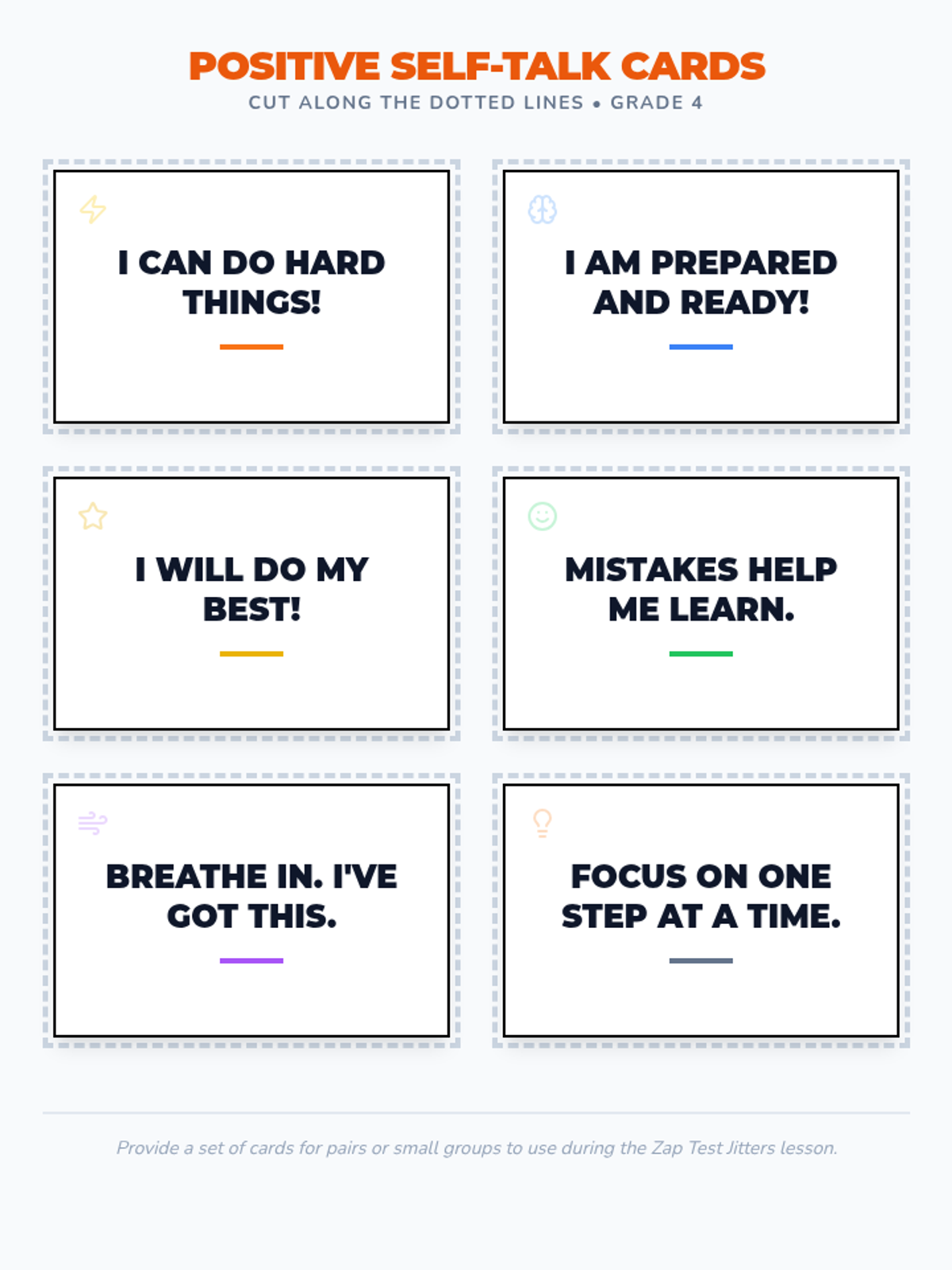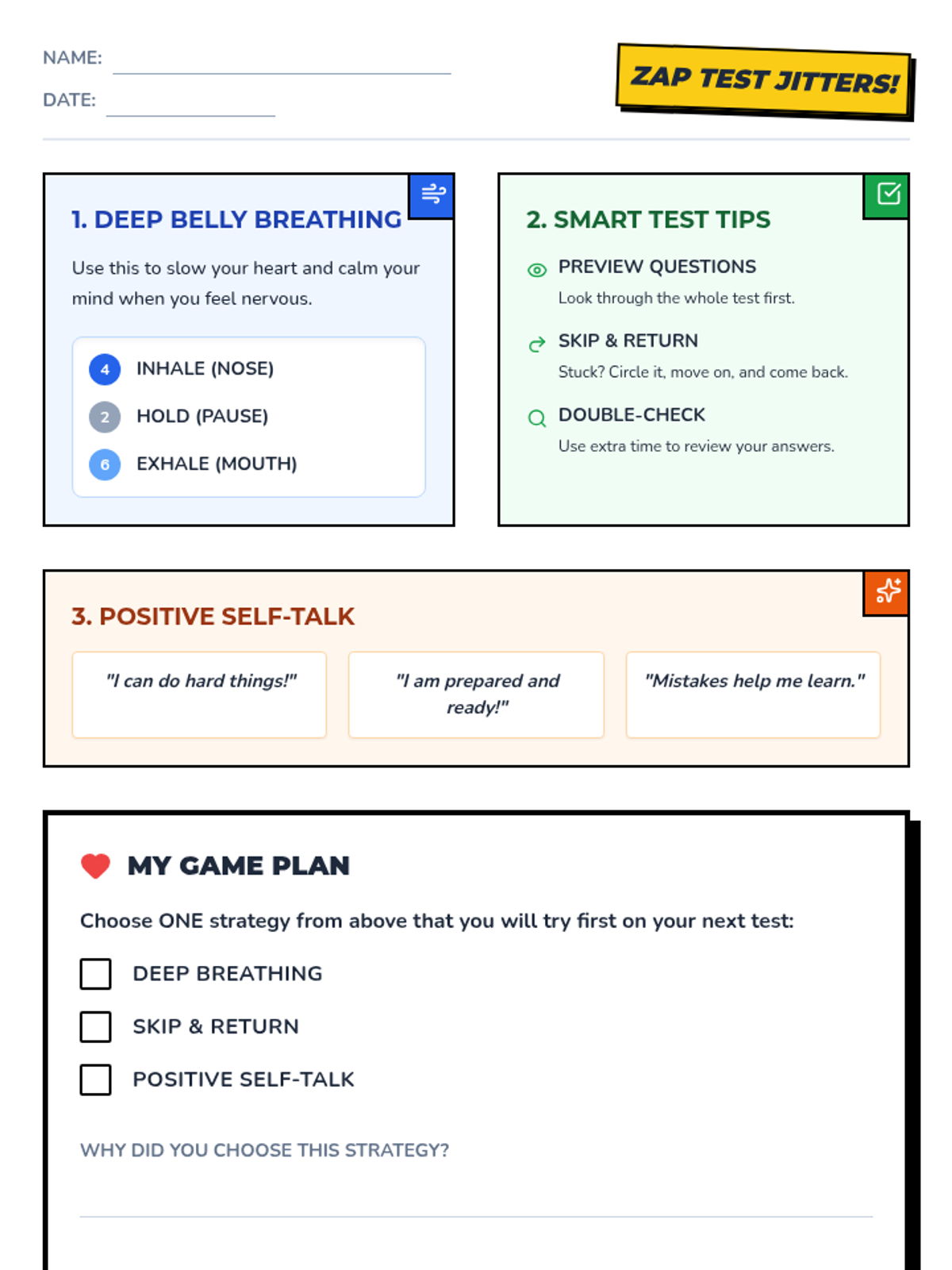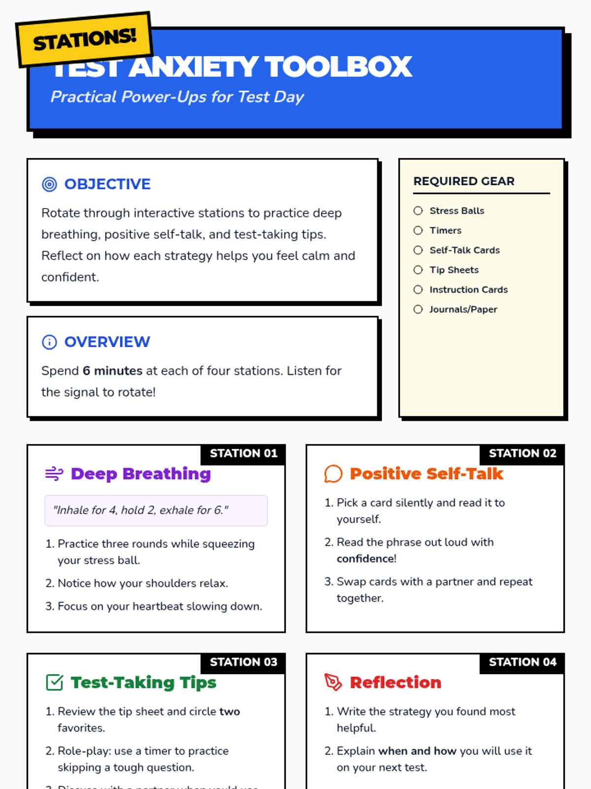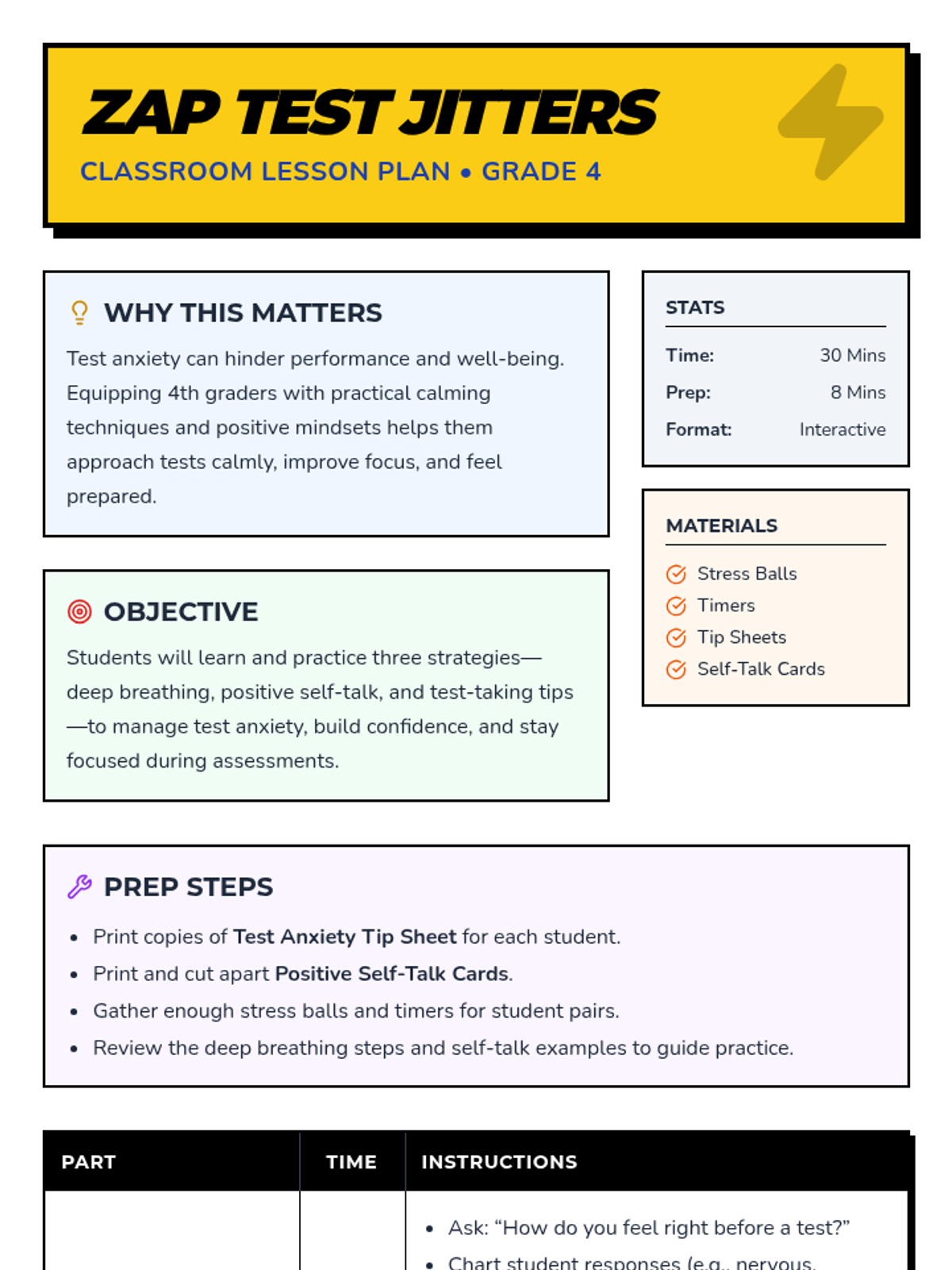 A 30-minute Tier 1 lesson for 4th graders to manage test anxiety through deep breathing, positive self-talk, and practical test-taking strategies.